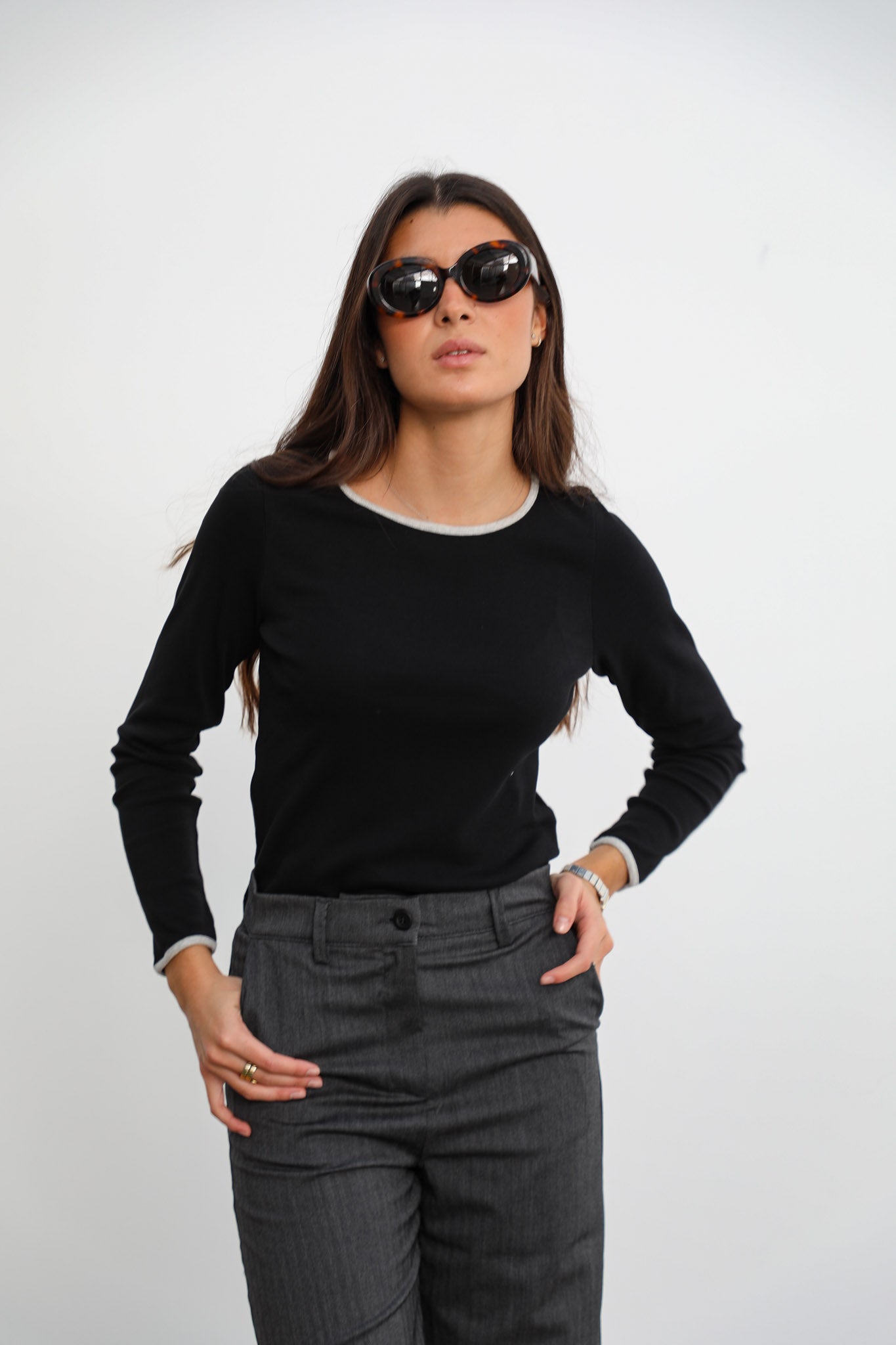 Black long sleeve t-shirt with contrast white fabric around neck and wrists, a round neck and straight finish.