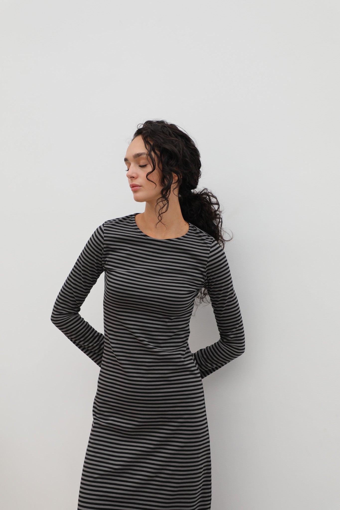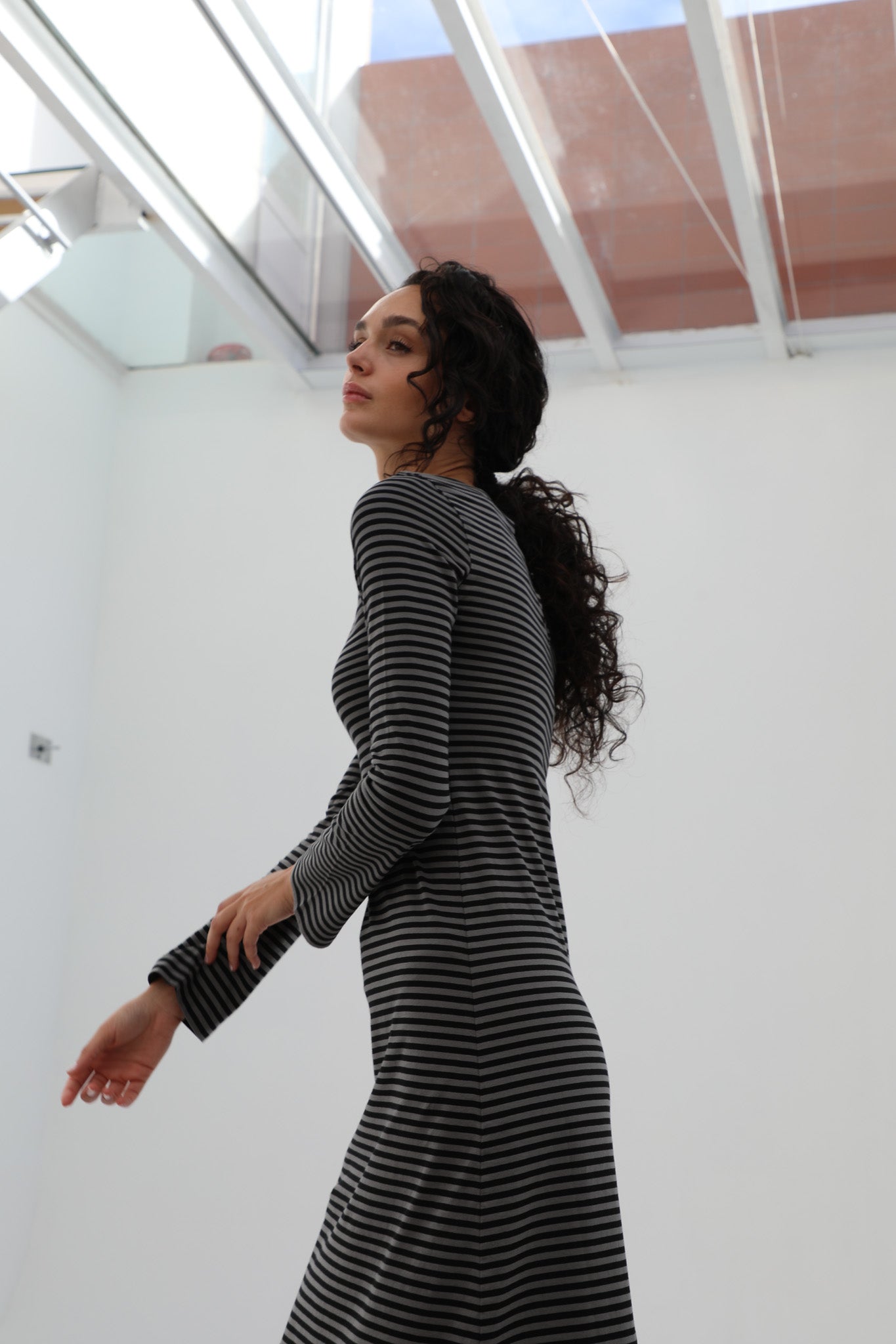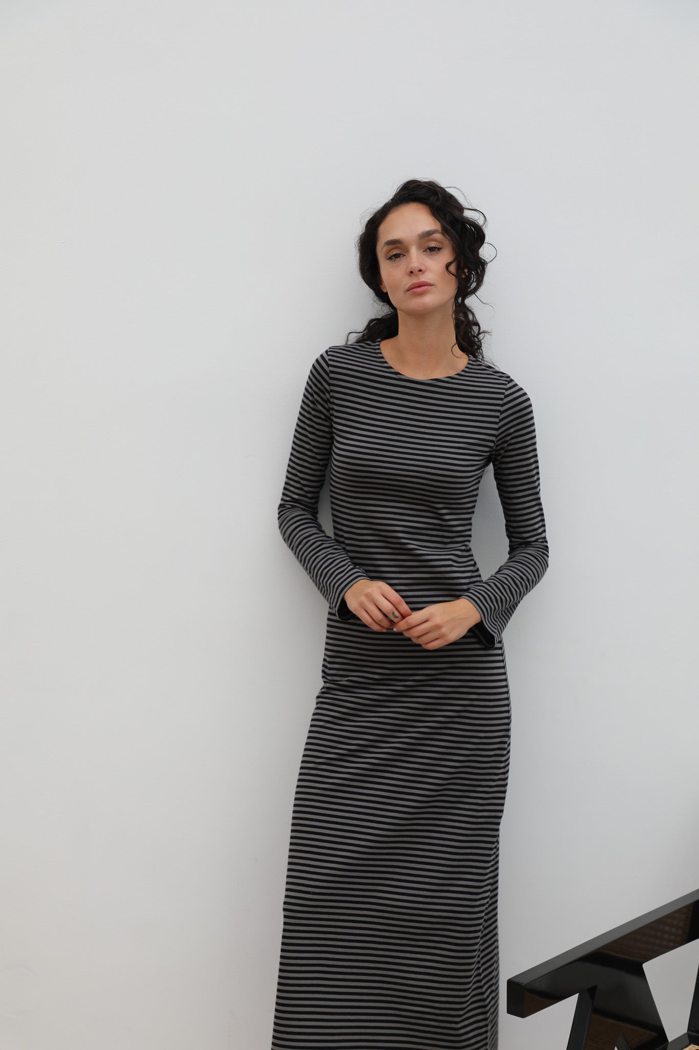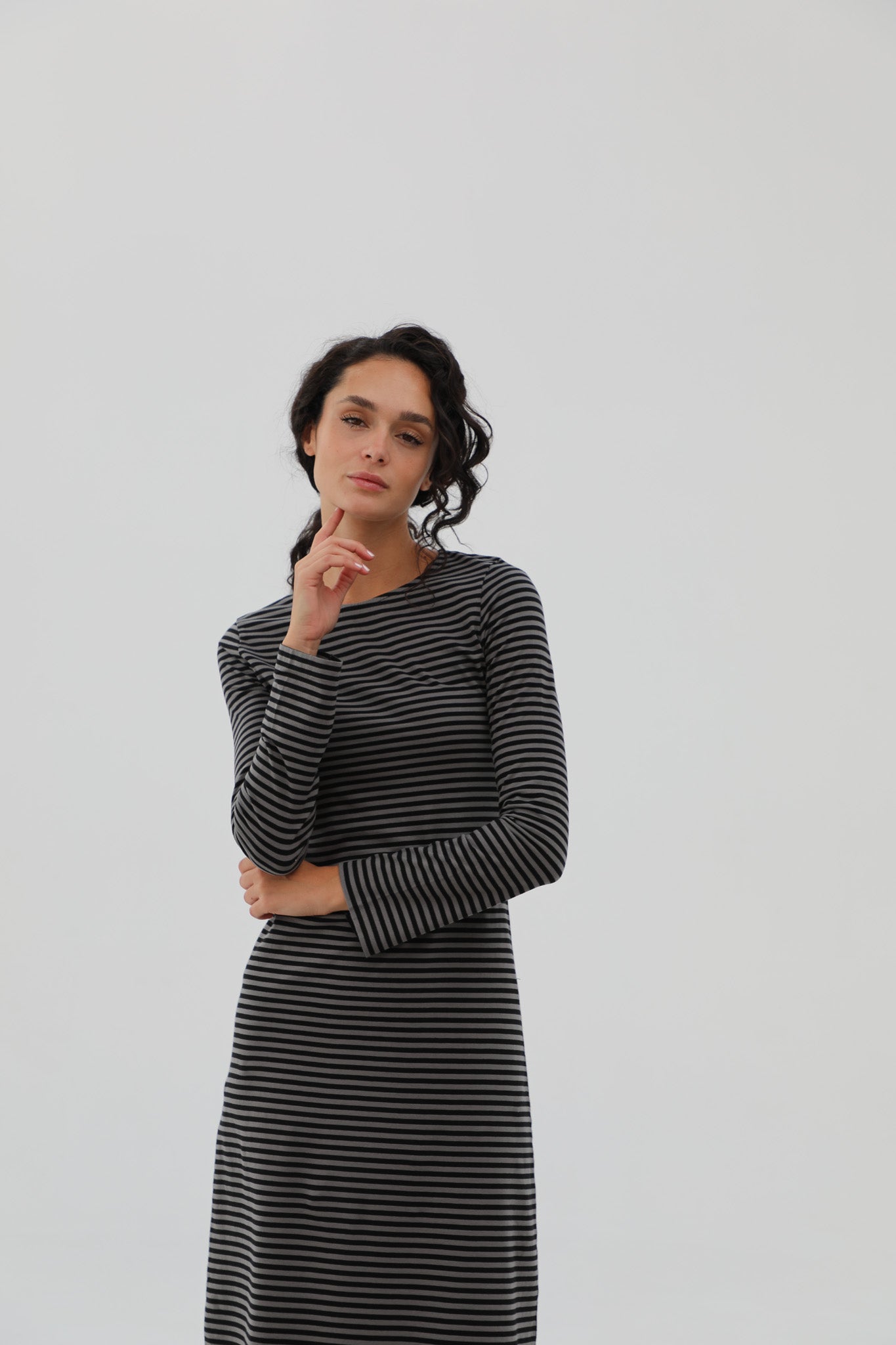 Long, soft dress with black and grey stripes. The flowing design adds a touch of elegance, perfect for both casual and dressy occasions.