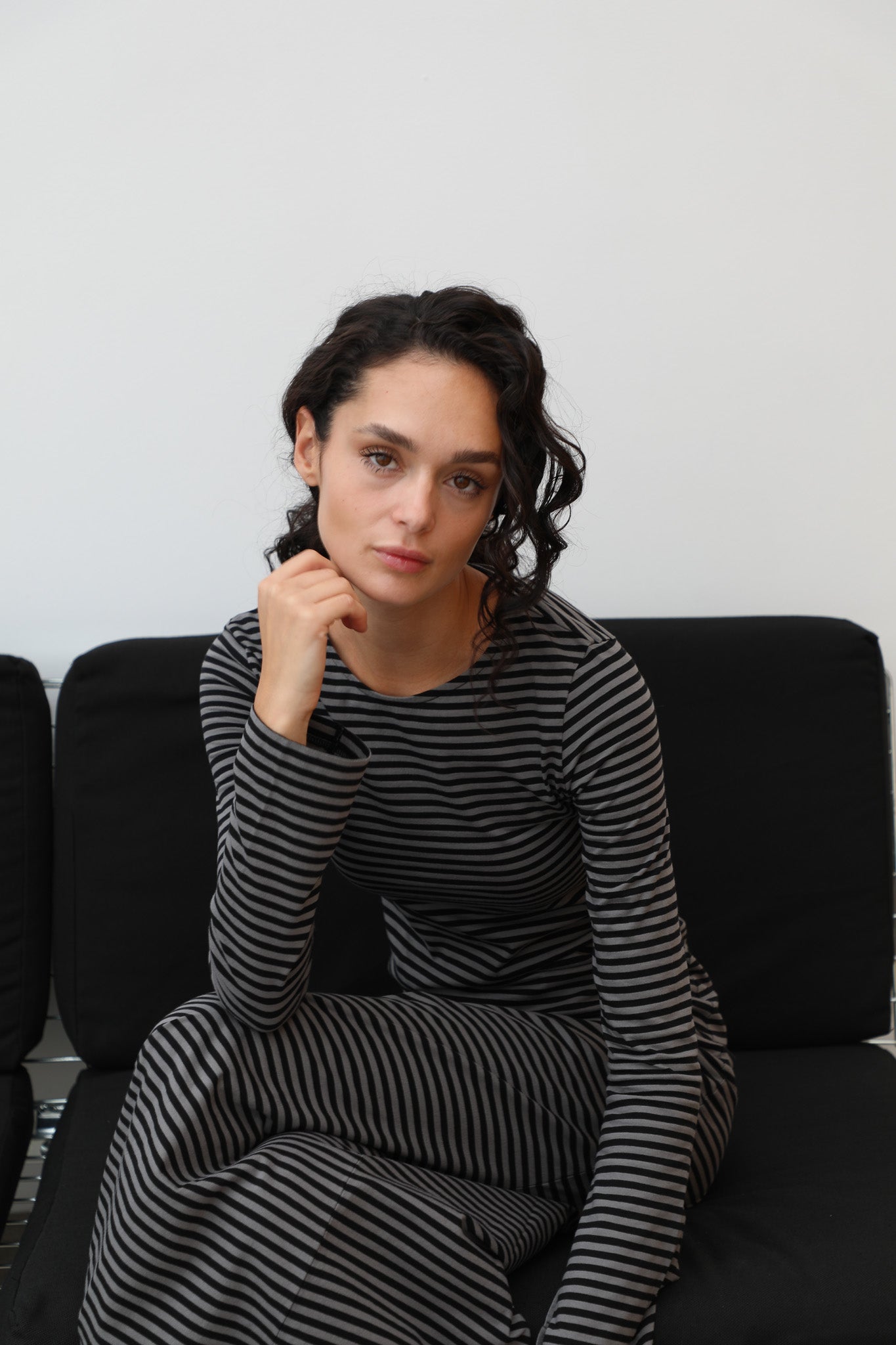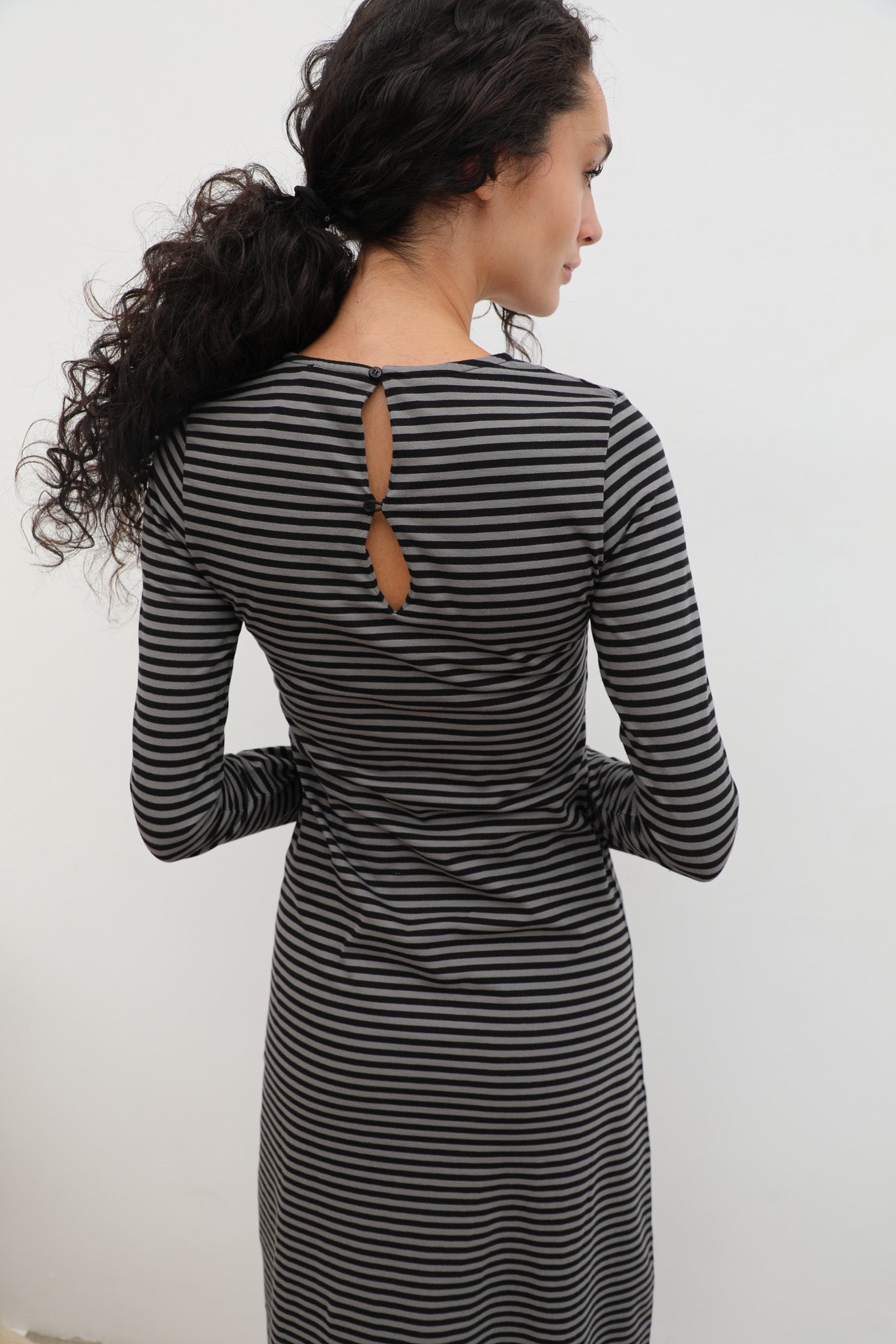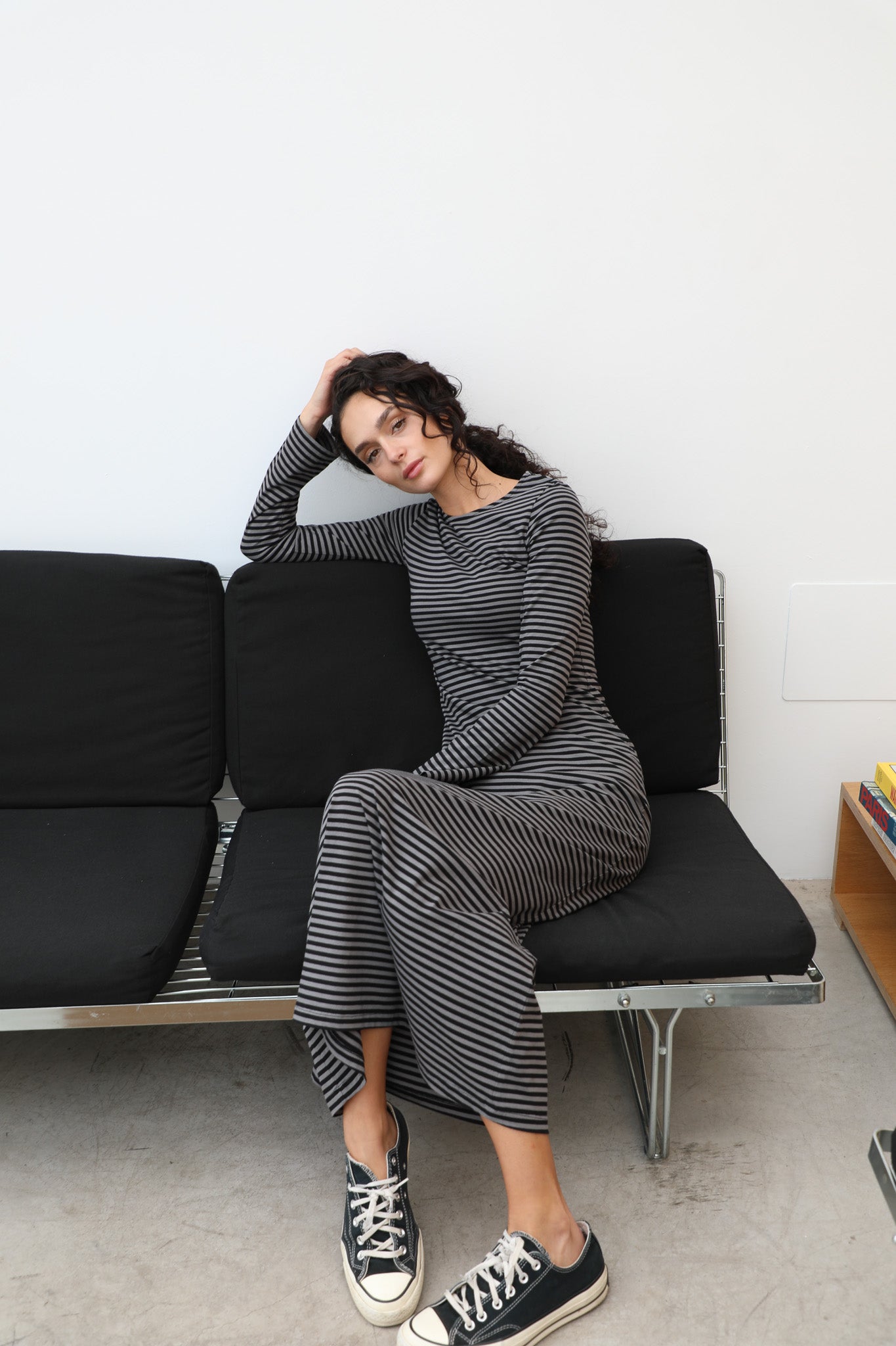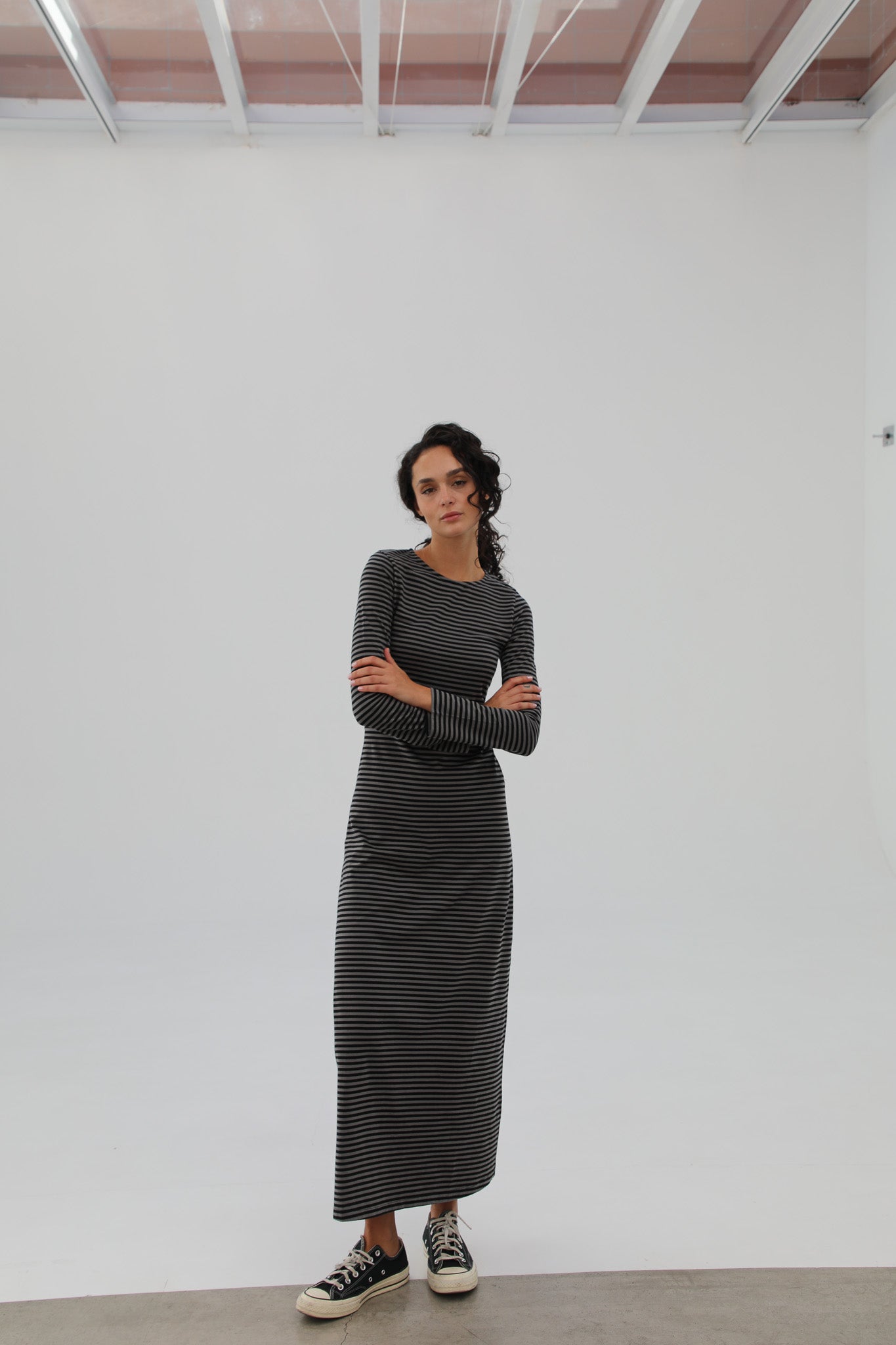 Long, soft dress with black and grey stripes. The flowing design adds a touch of elegance, perfect for both casual and dressy occasions.