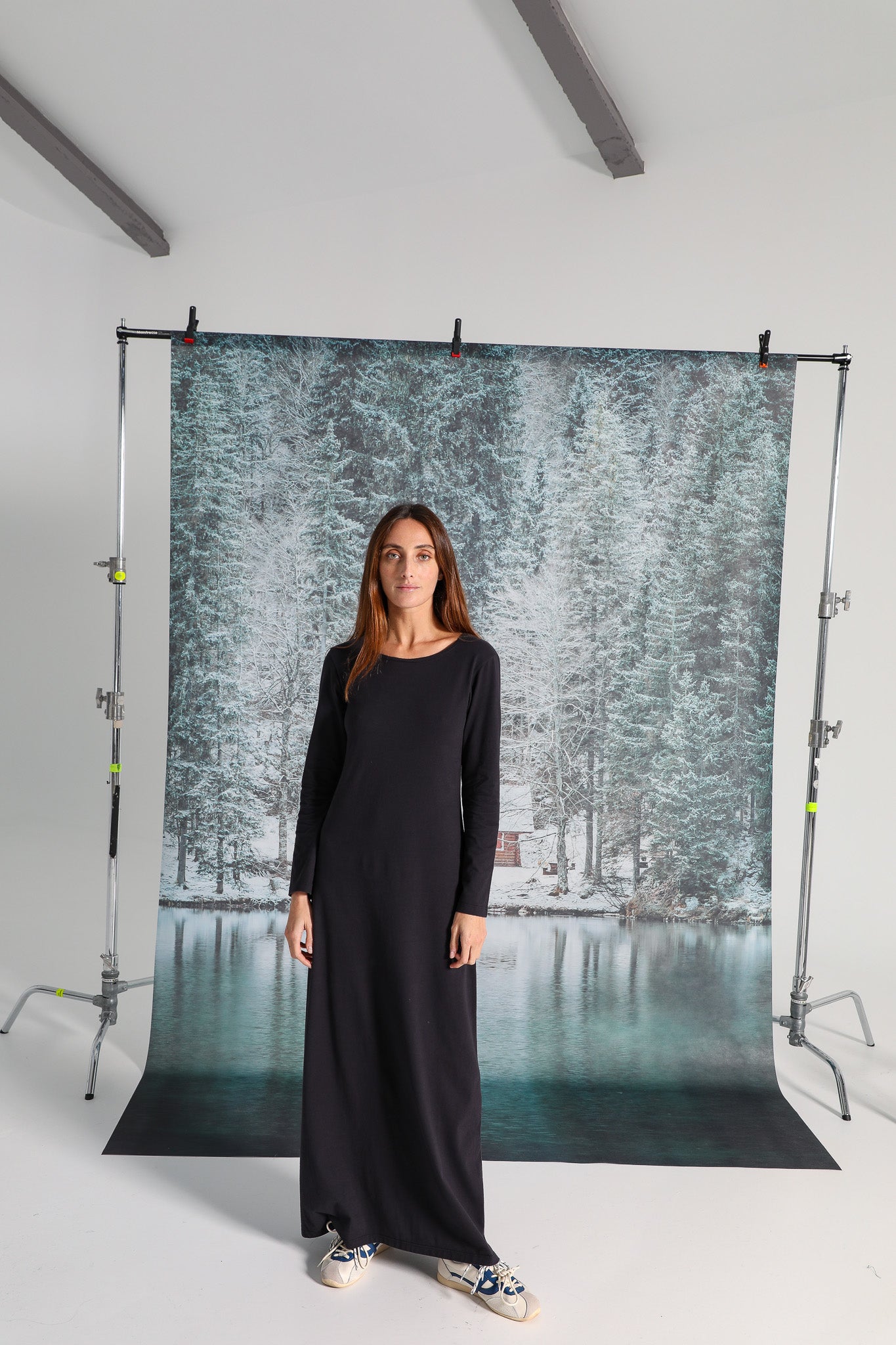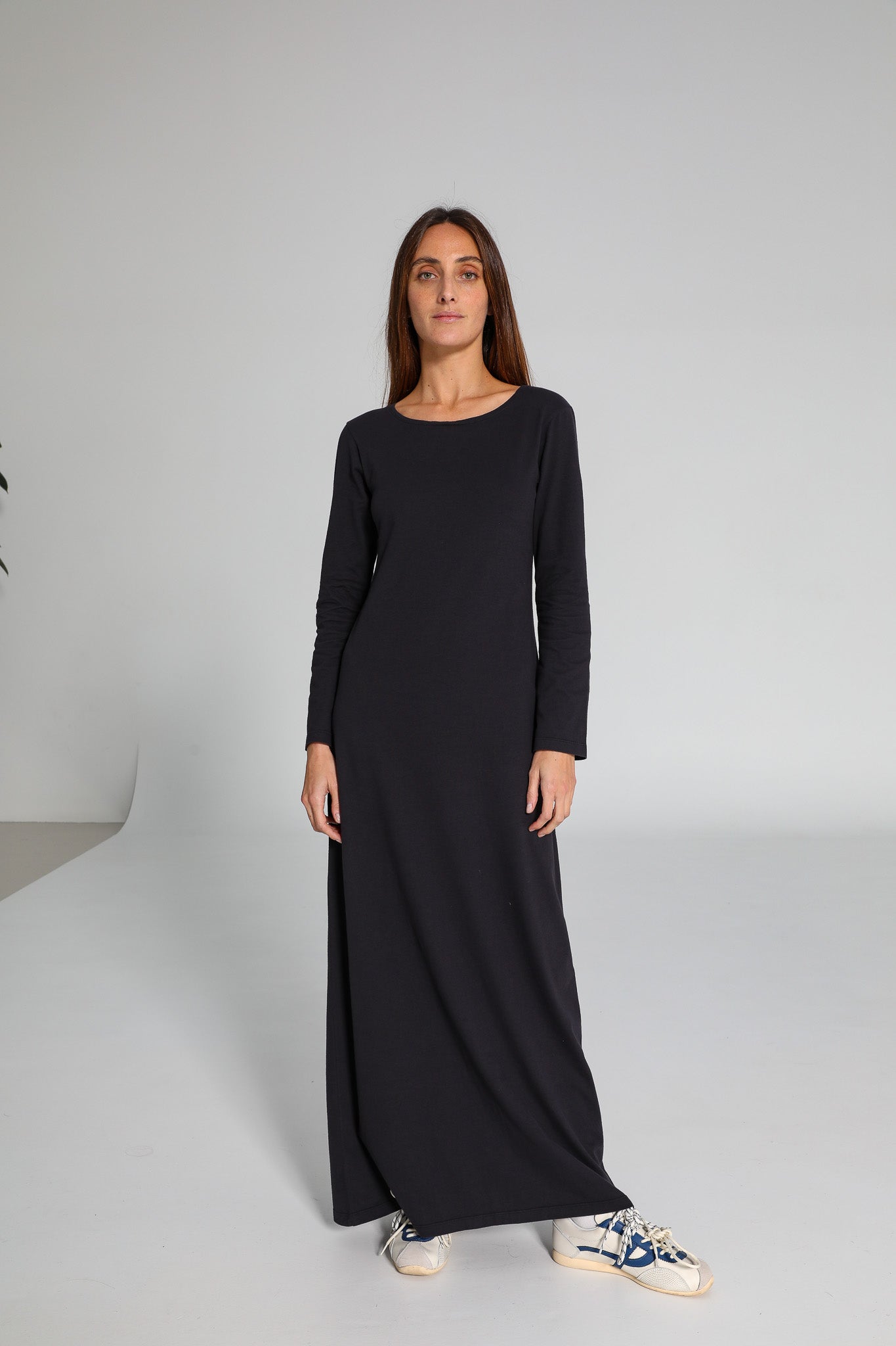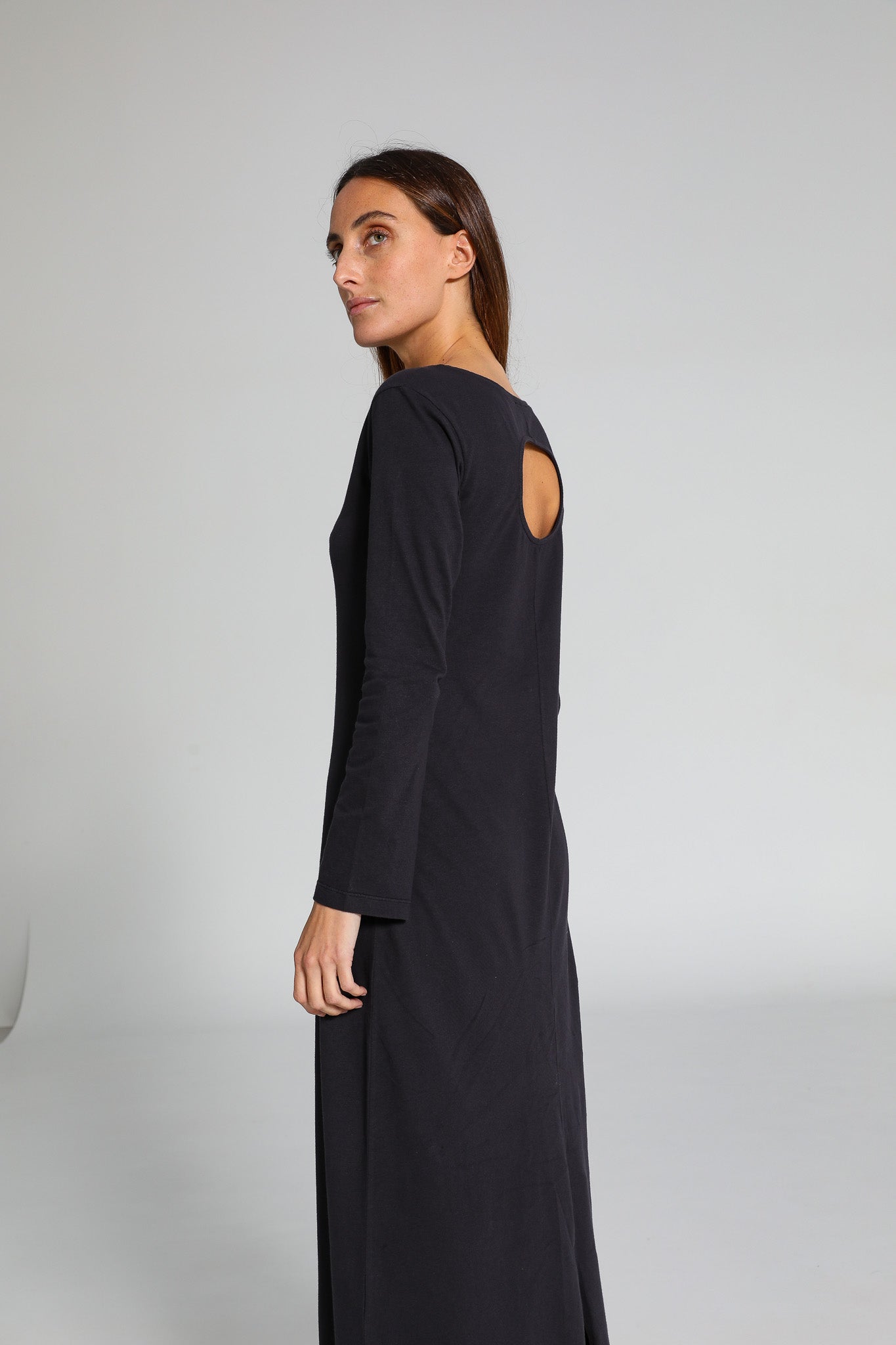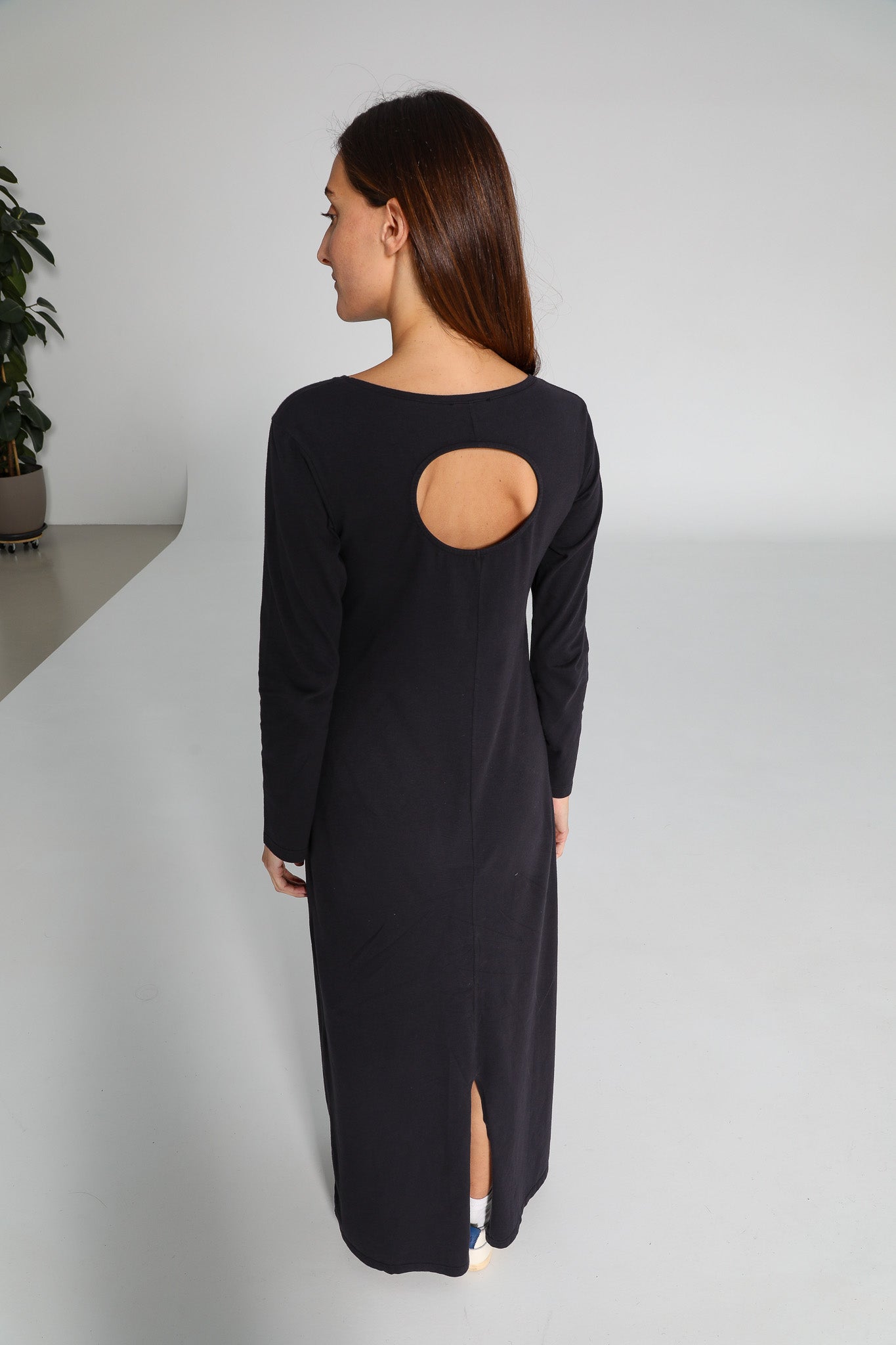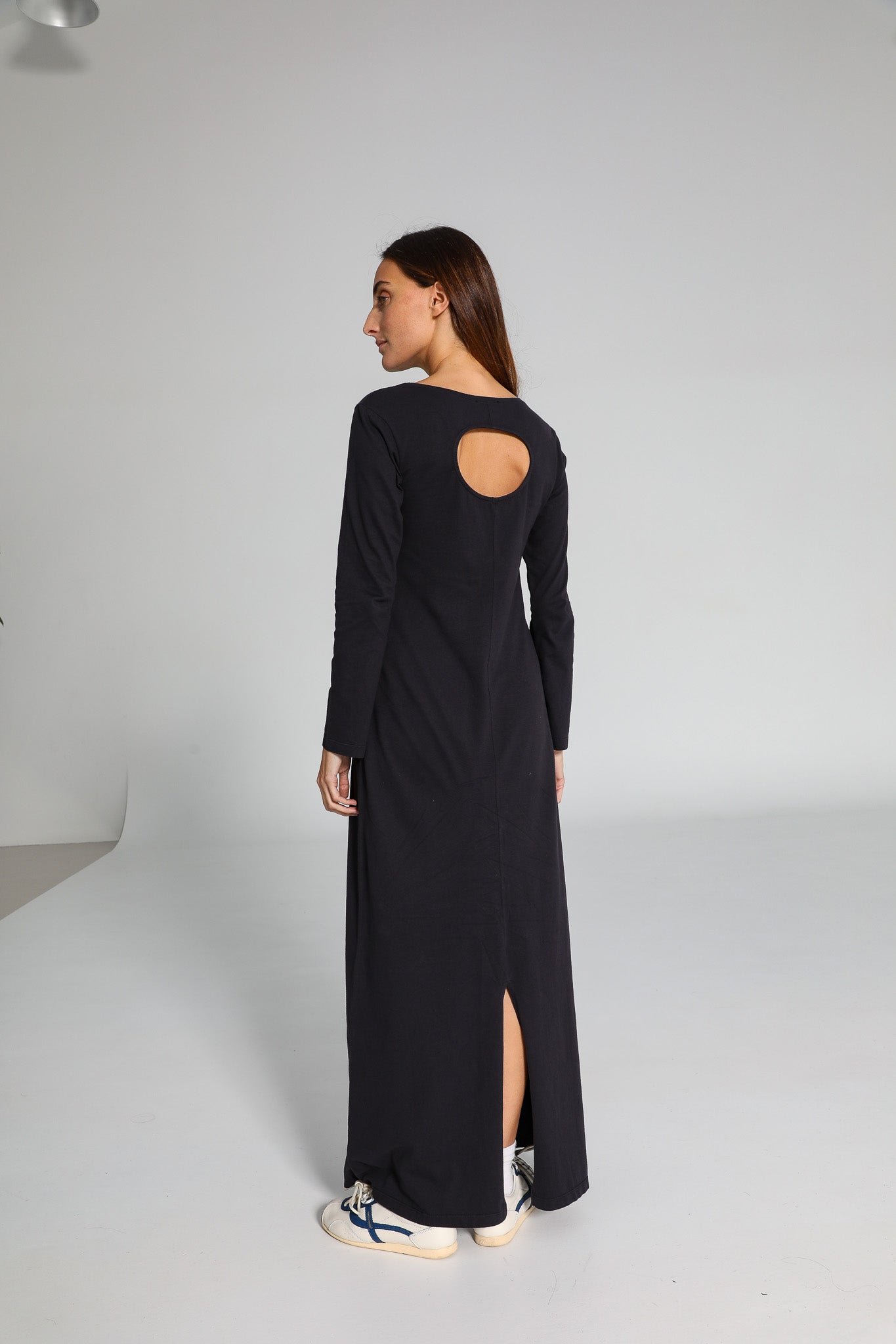 Dark blue long maxi dress with hole detail on the back and back leg opening.