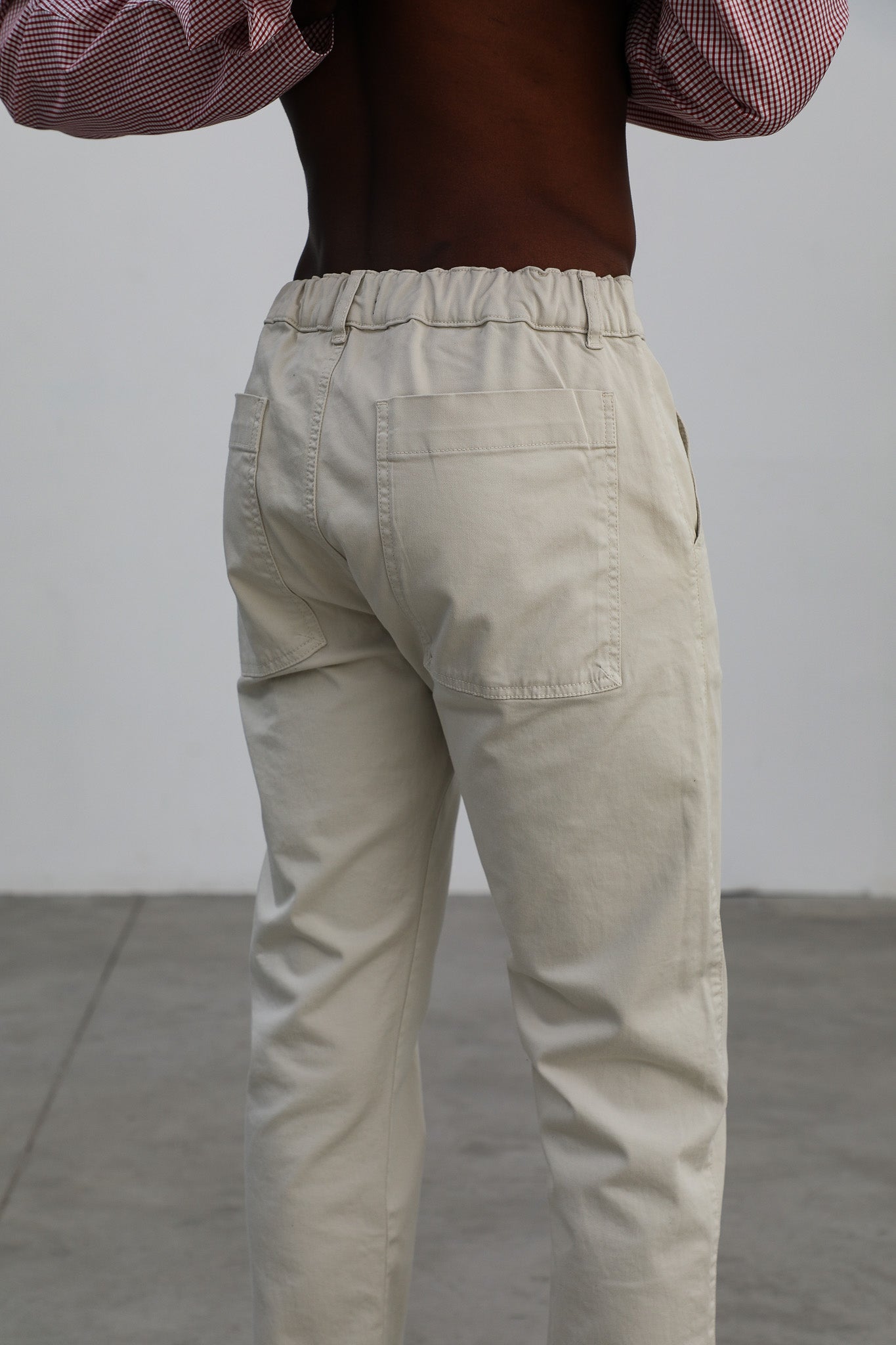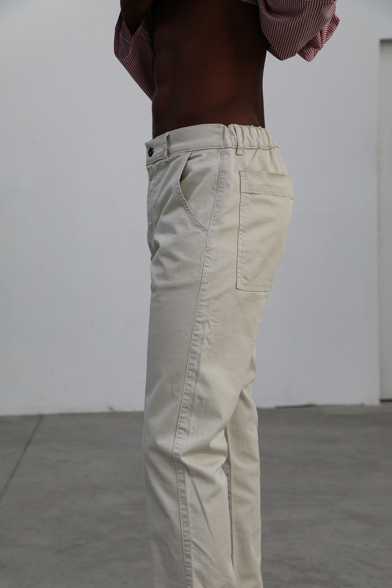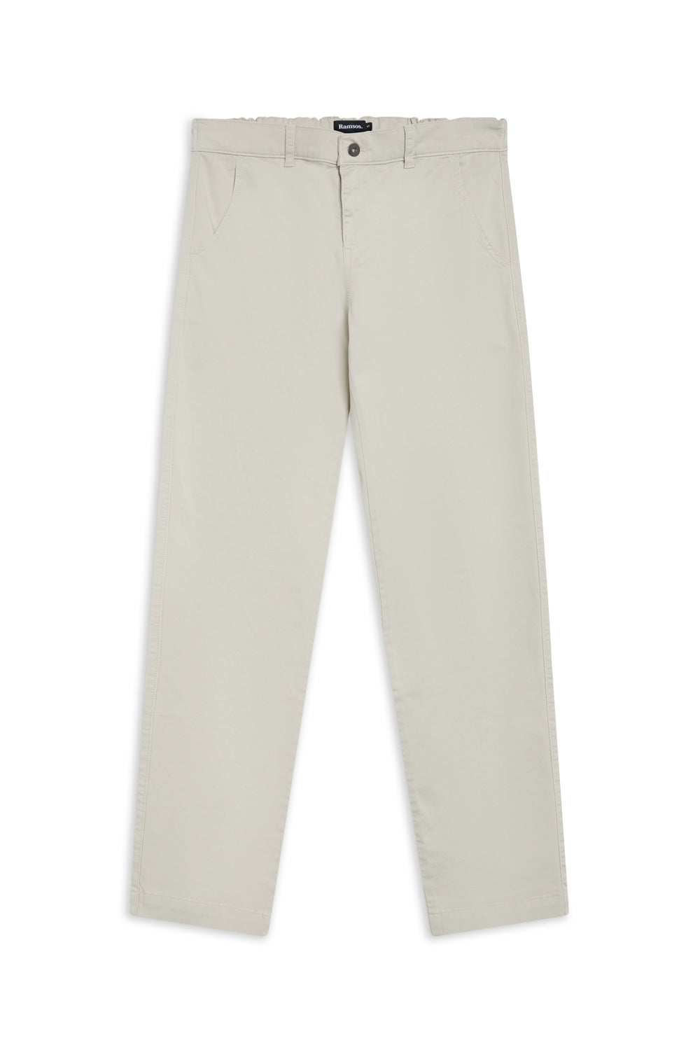 Slim fit men's pants in a natural white, featuring a front button and zipper closure, with elastic at the back for added comfort and an optimal fit with side pockets and two large open back pockets.