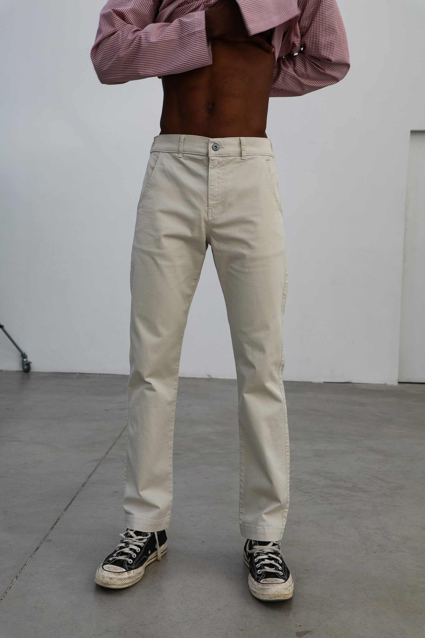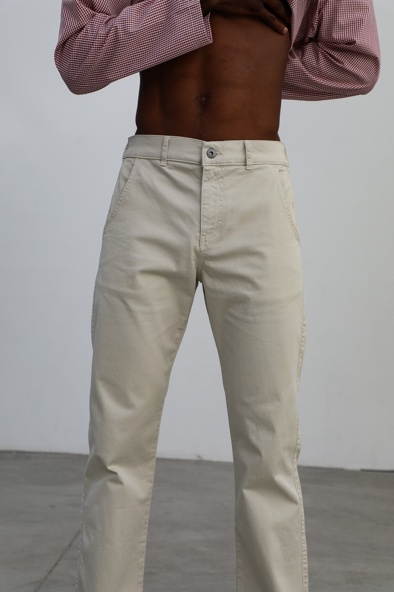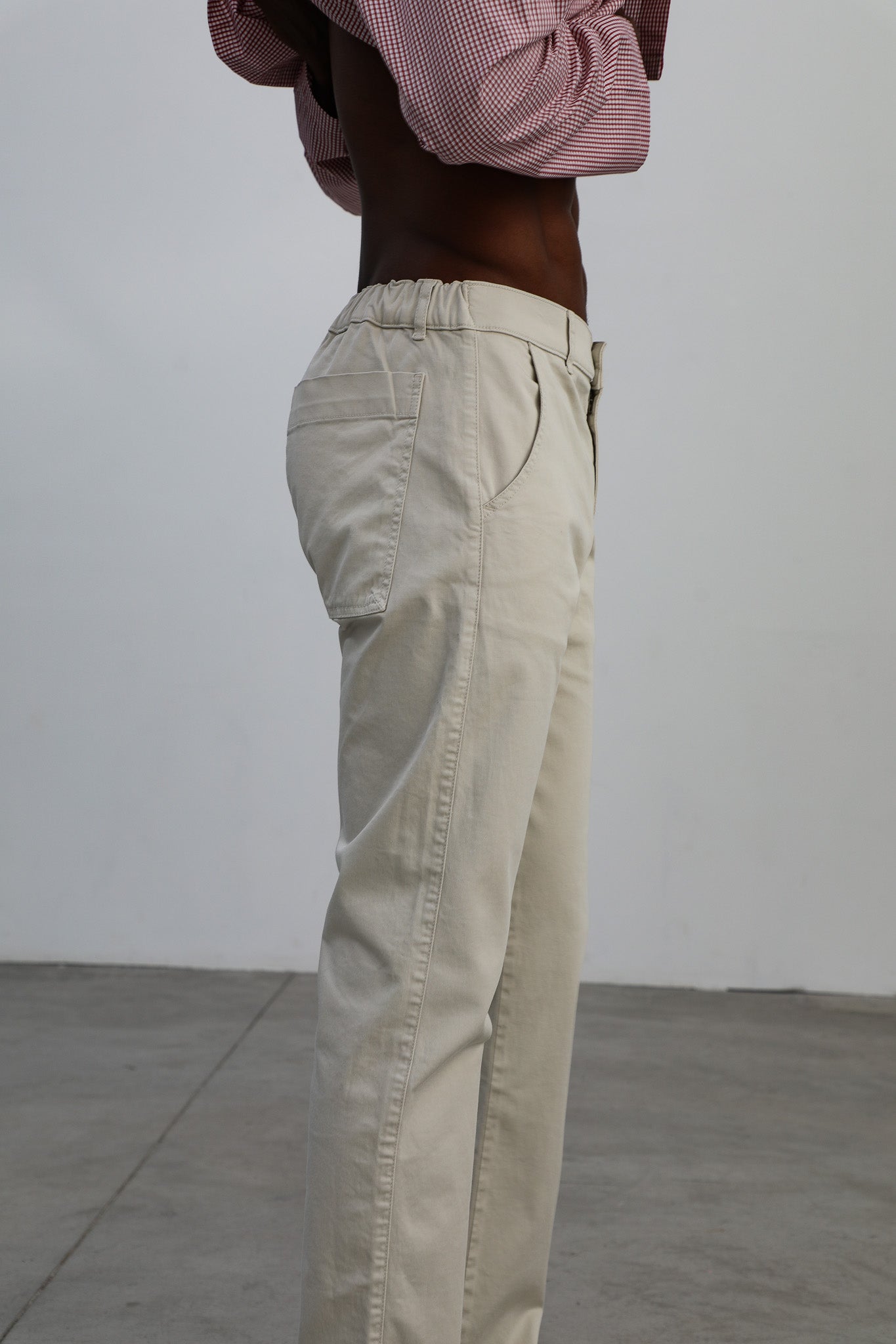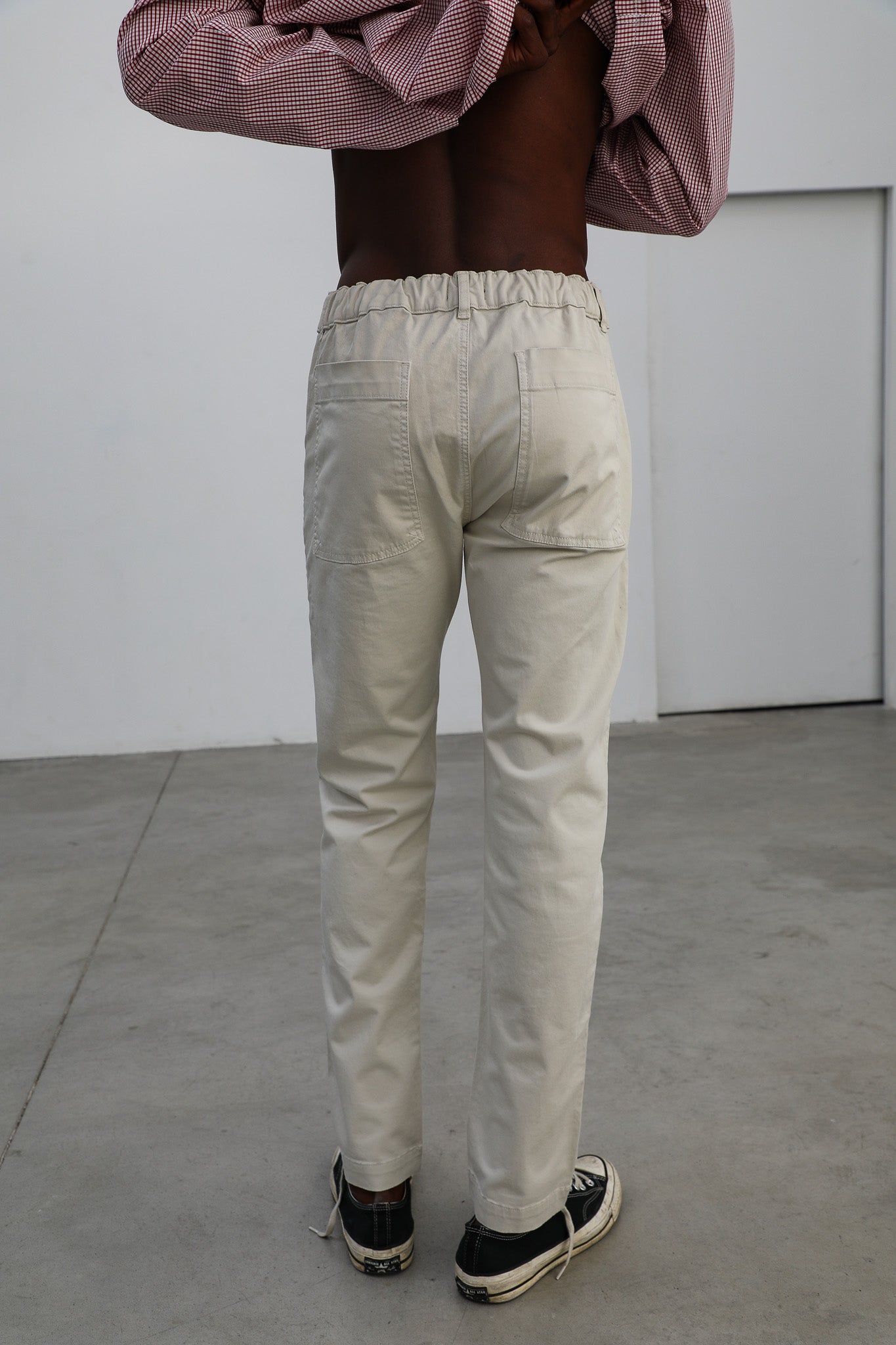 Slim fit men's pants in a natural white, featuring a front button and zipper closure, with elastic at the back for added comfort and an optimal fit with side pockets and two large open back pockets.