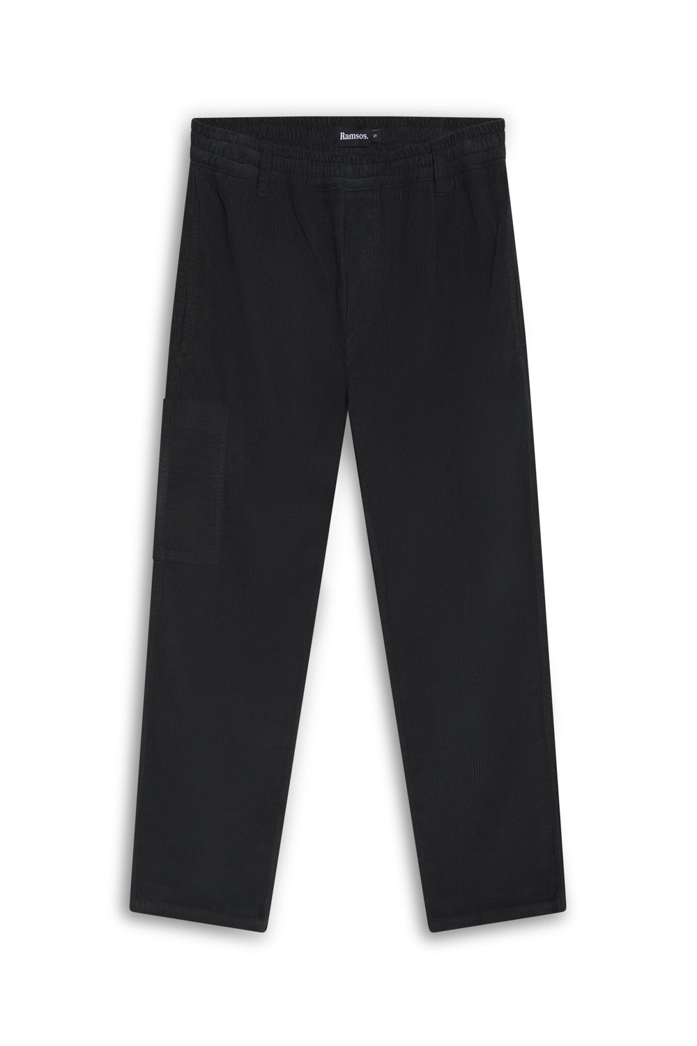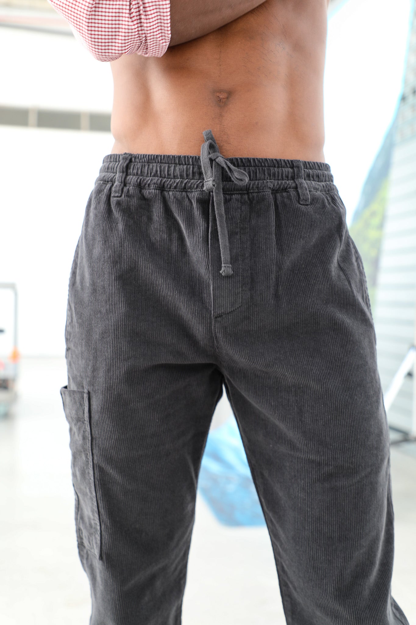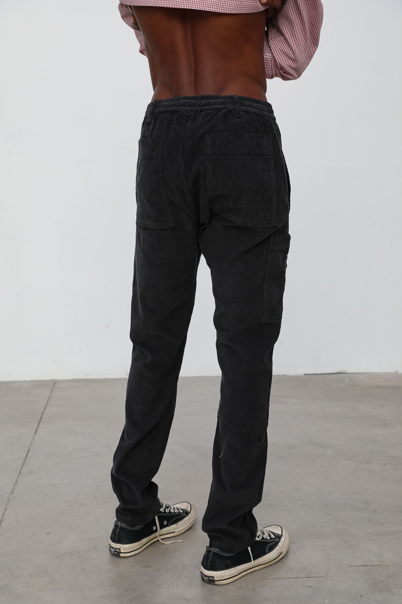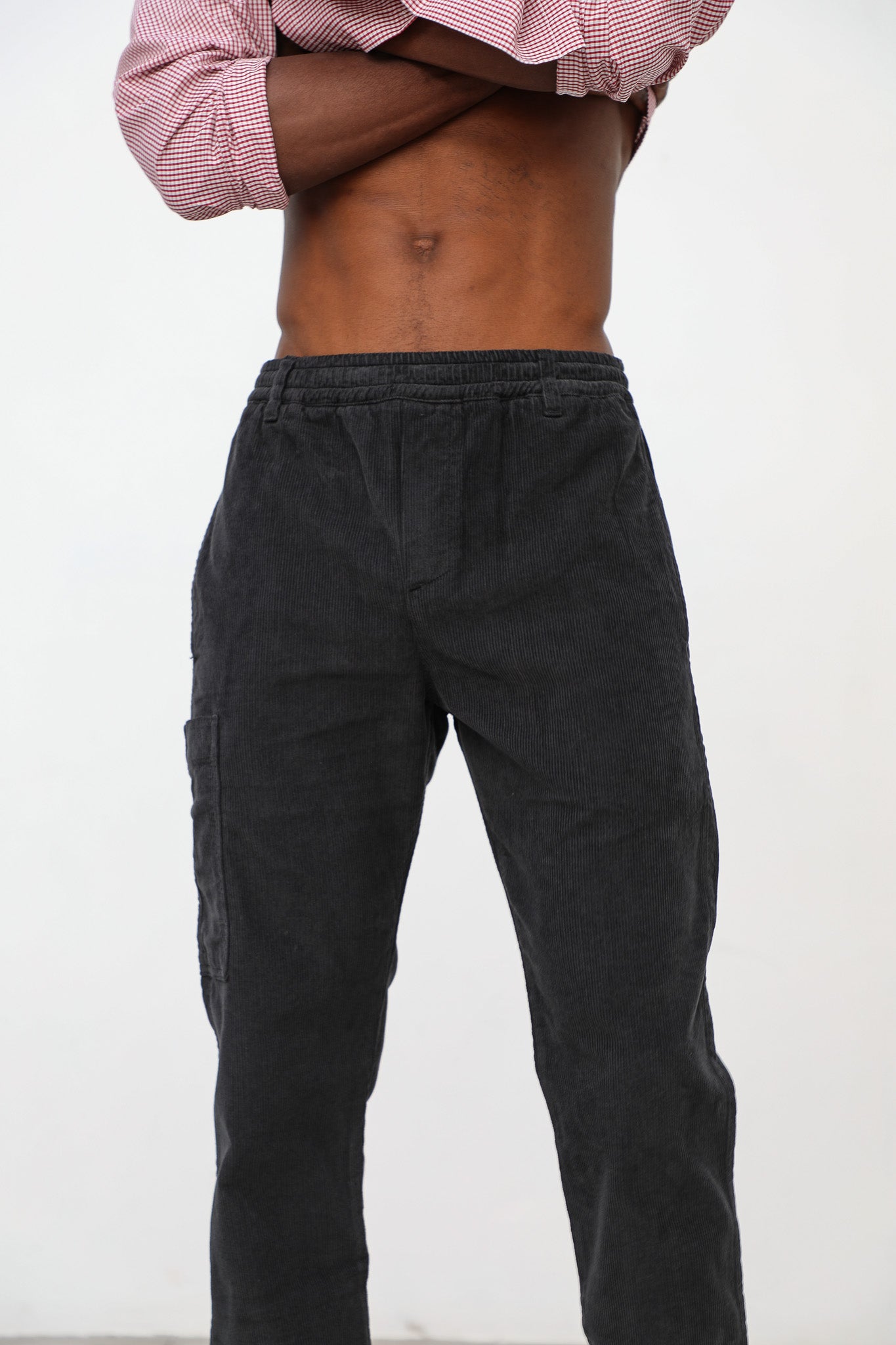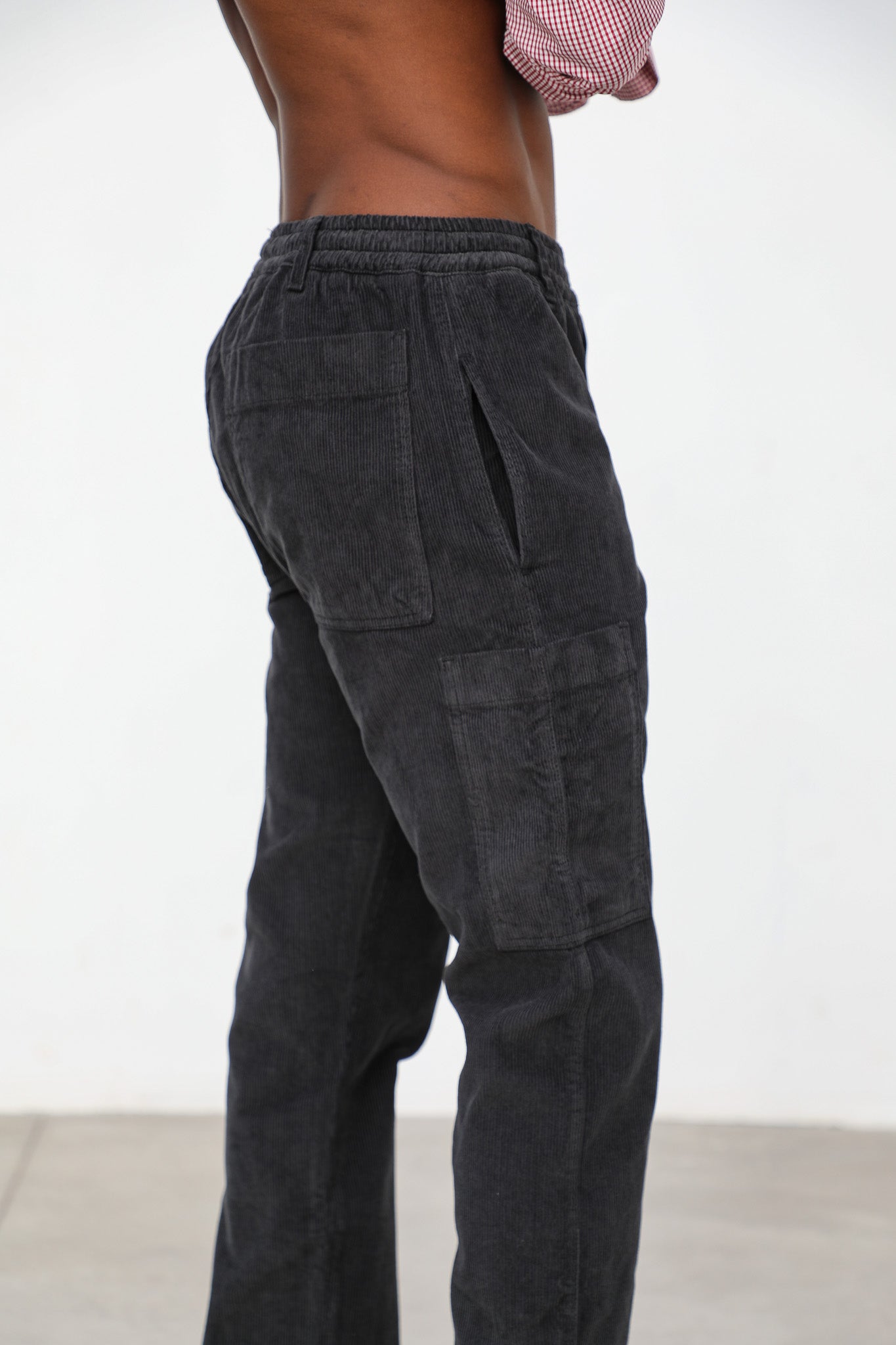 Narrow-fit corduroy pants in petrol, with elastic waist and a small side pocket.