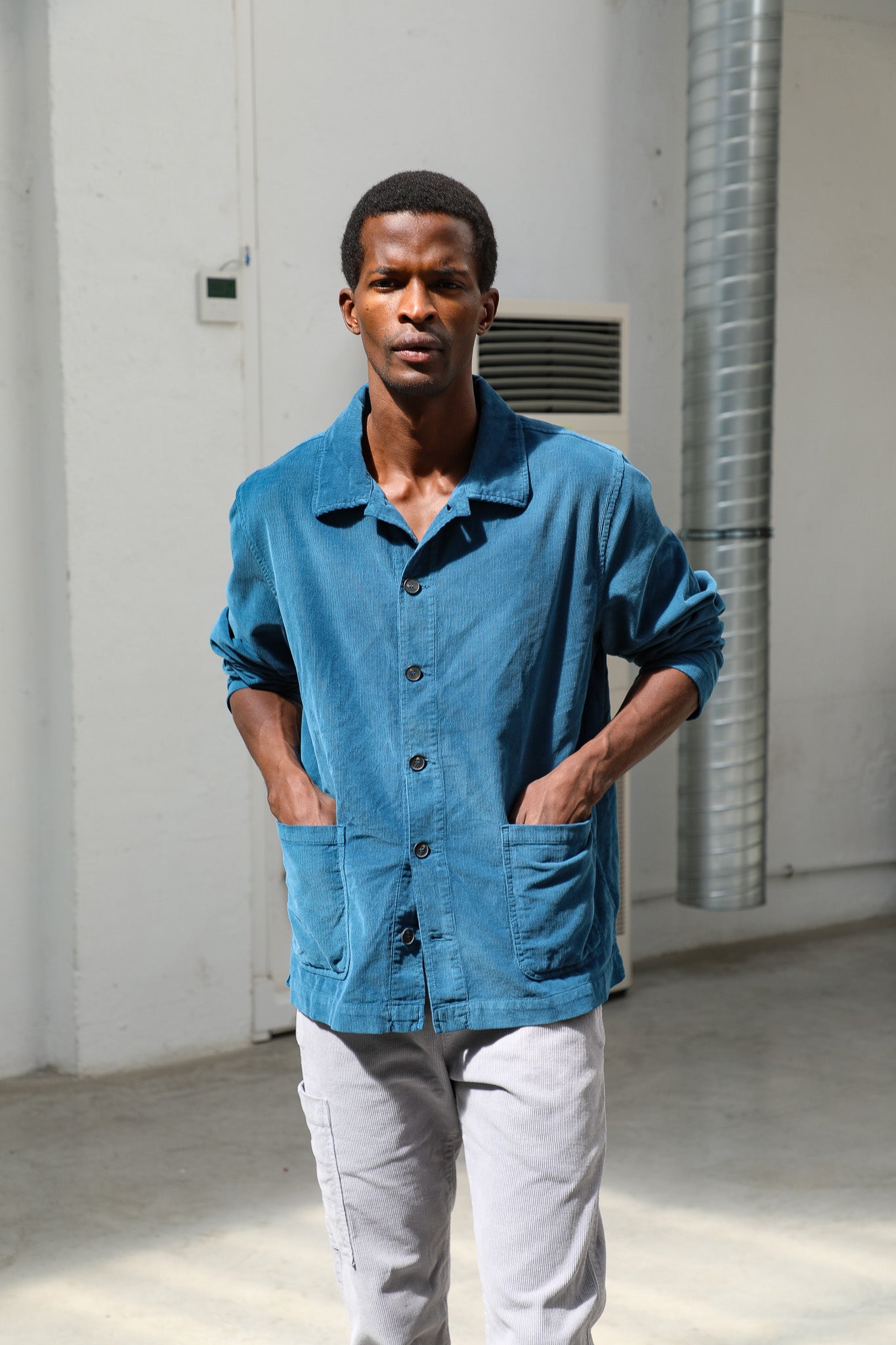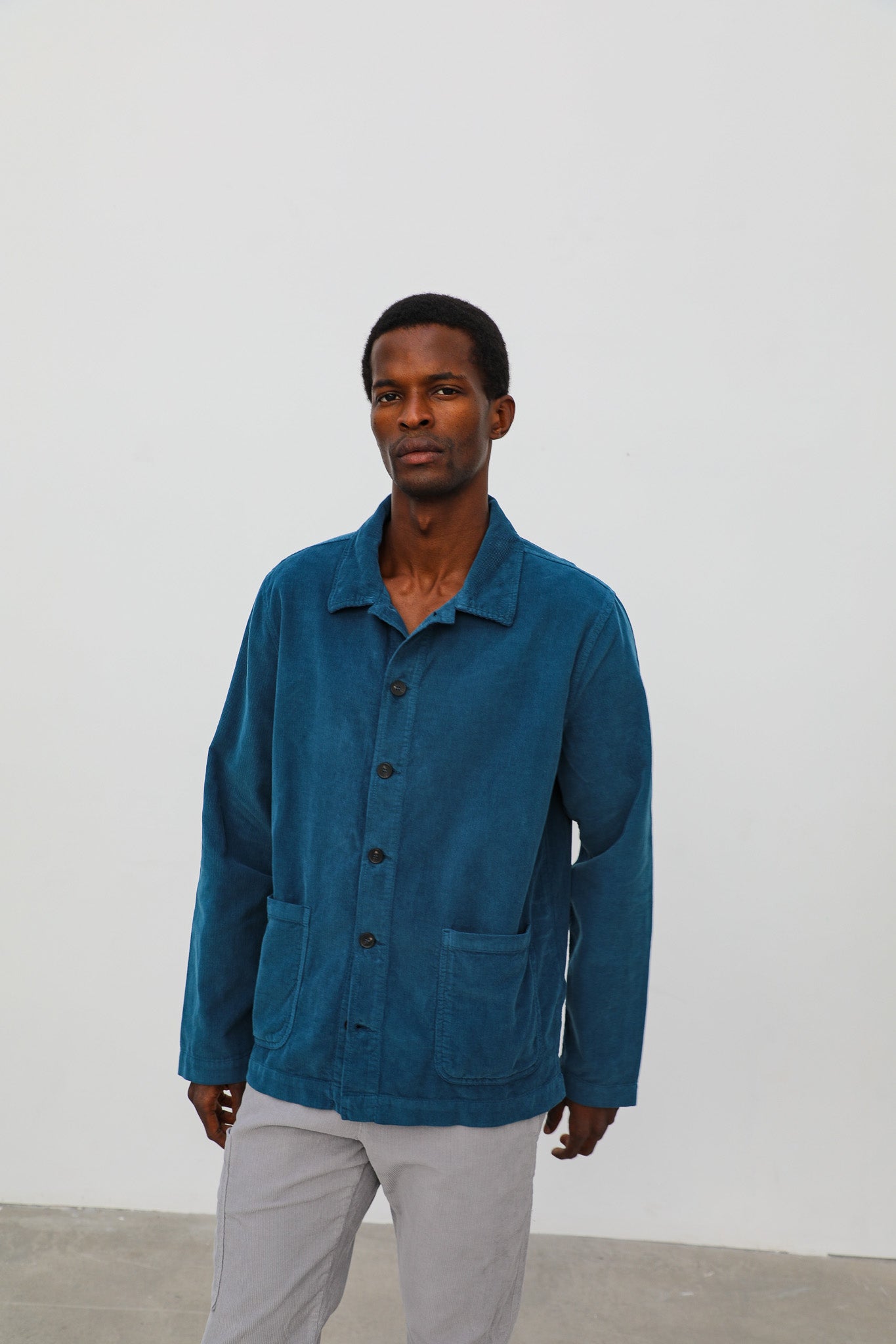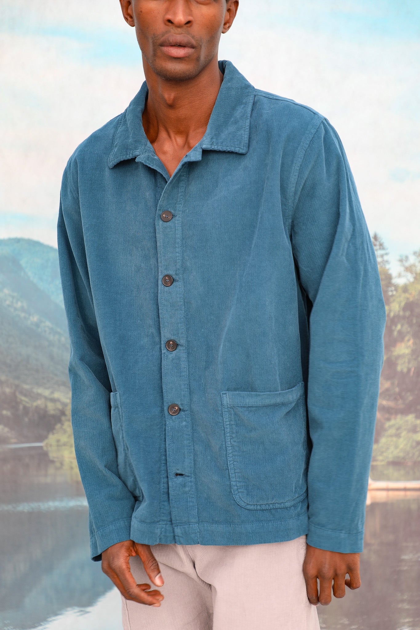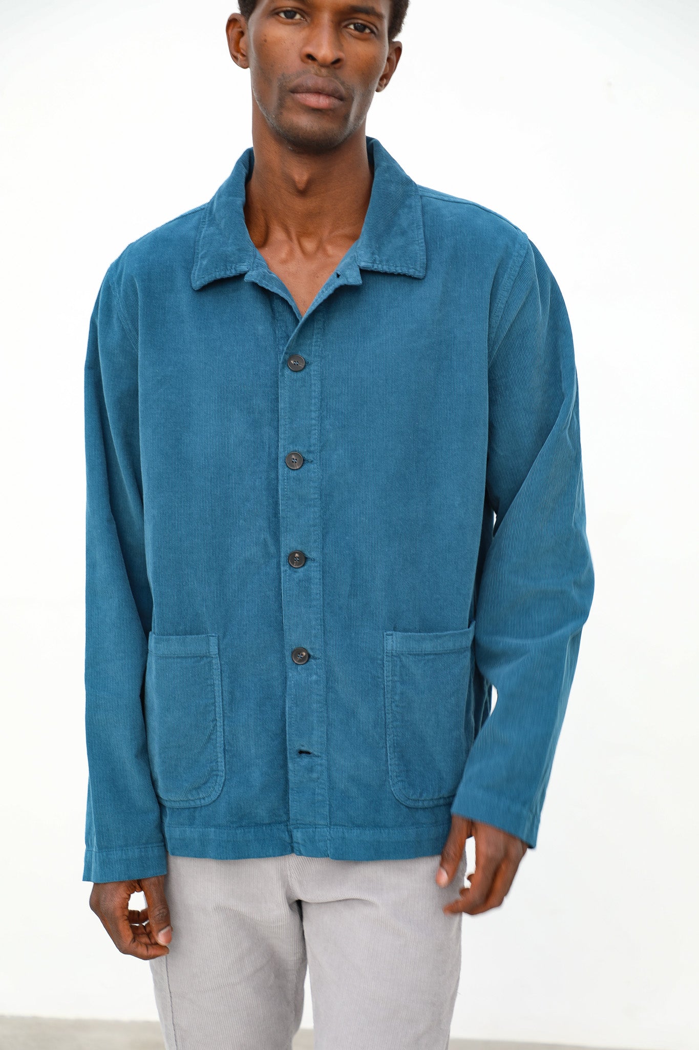 Corduroy jacket in blue, designed with a full button closure and two large side pockets.