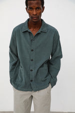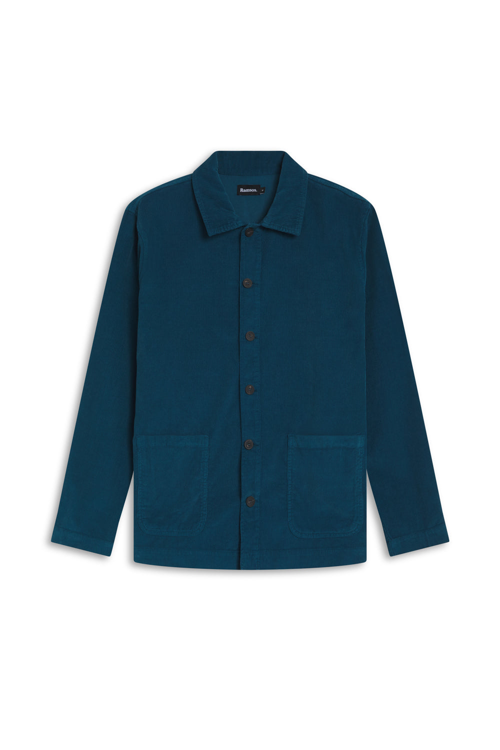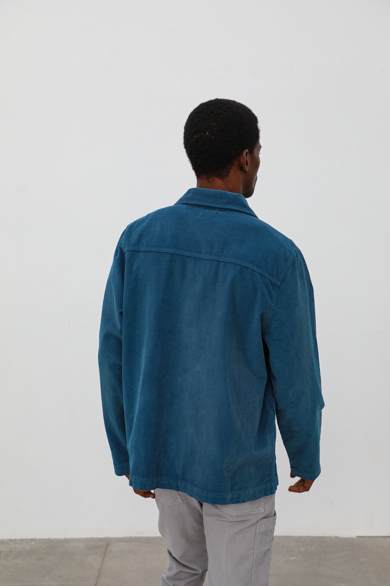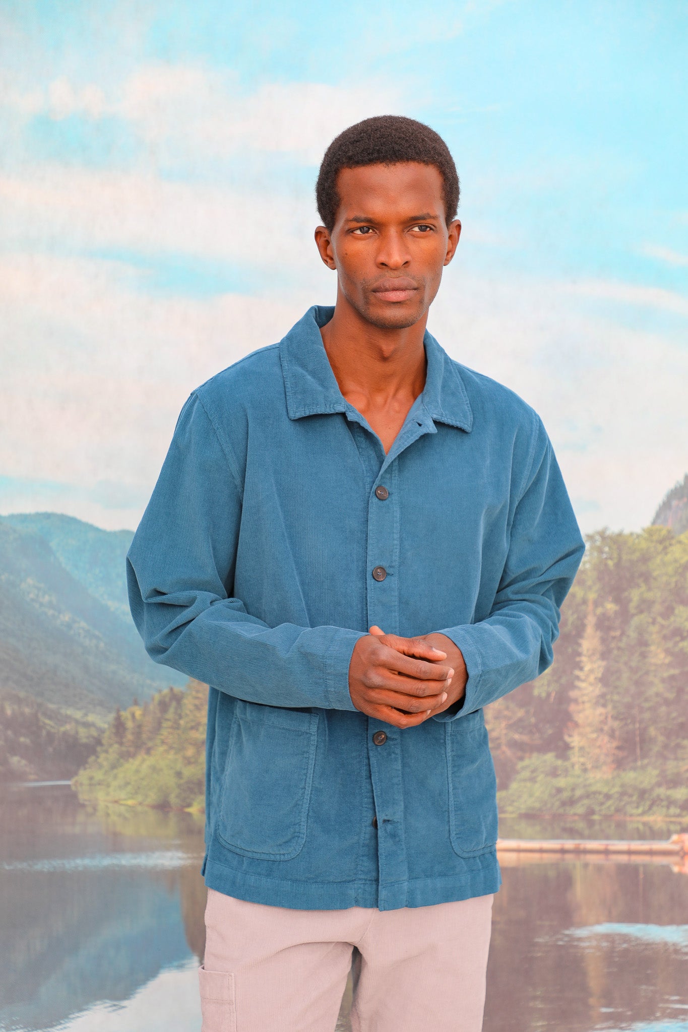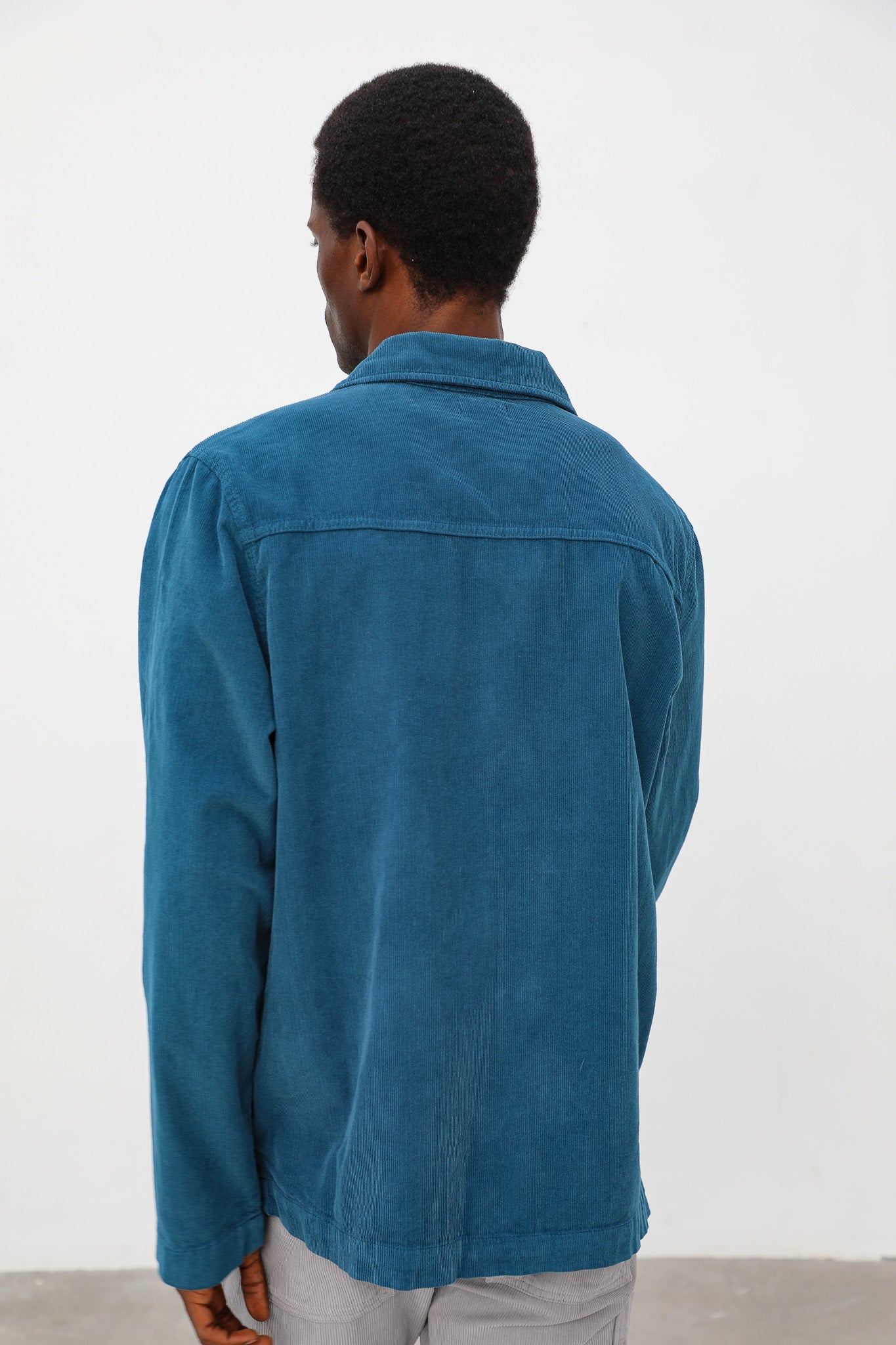 Corduroy jacket in blue, designed with a full button closure and two large side pockets.