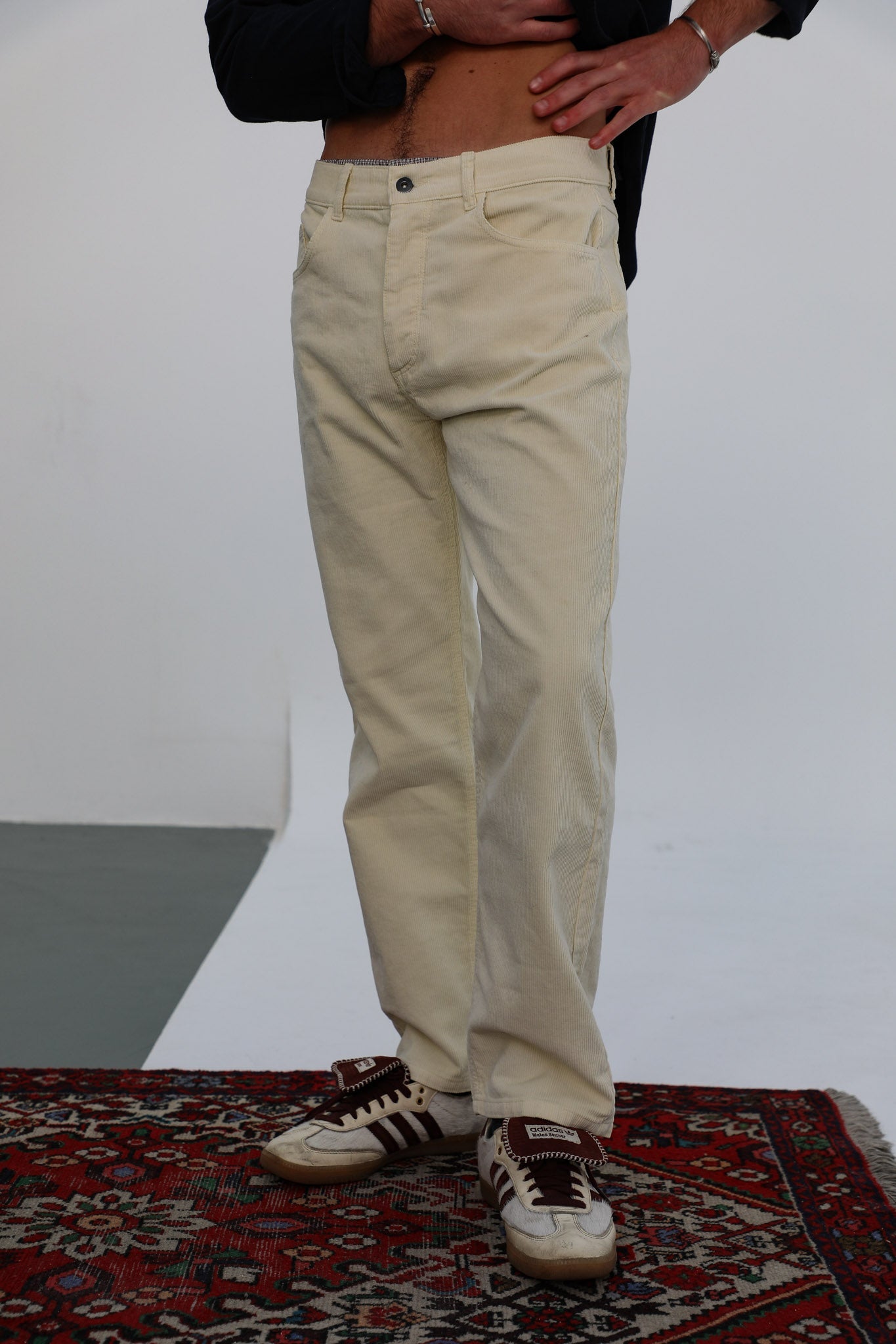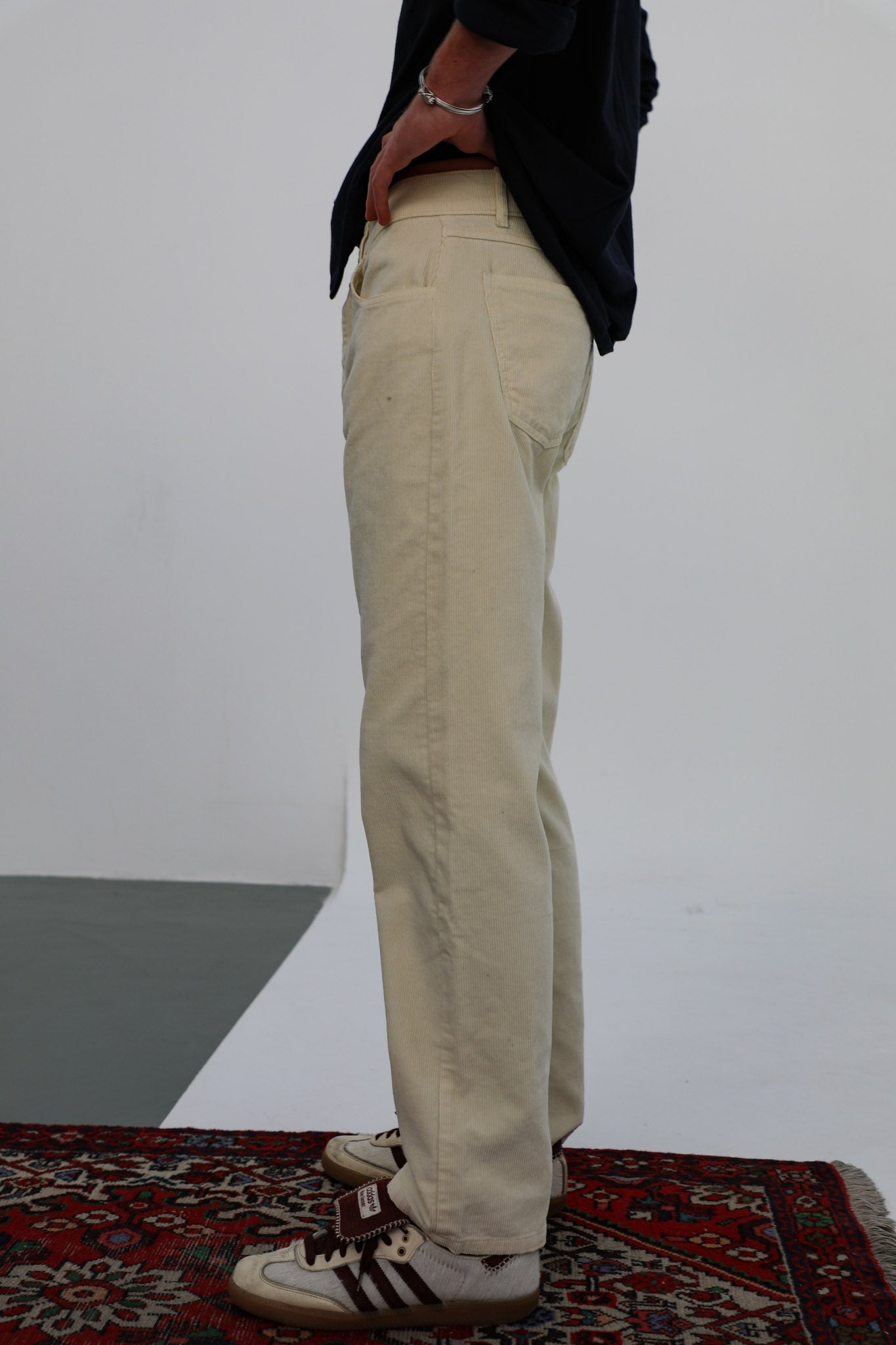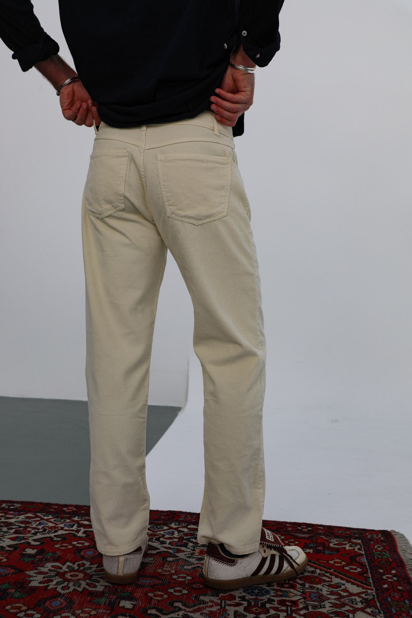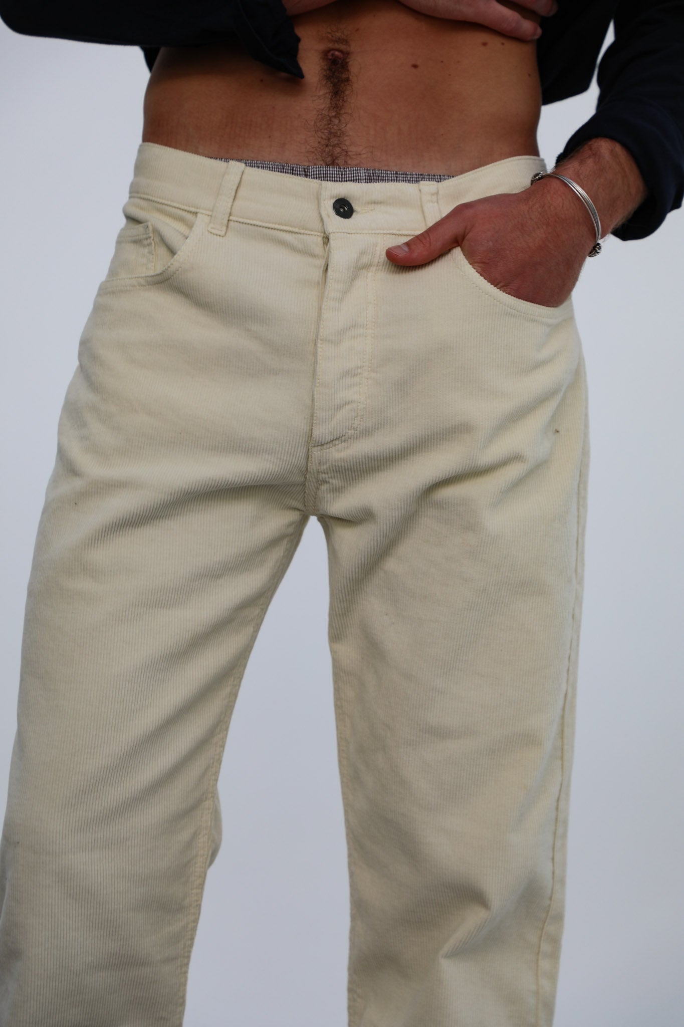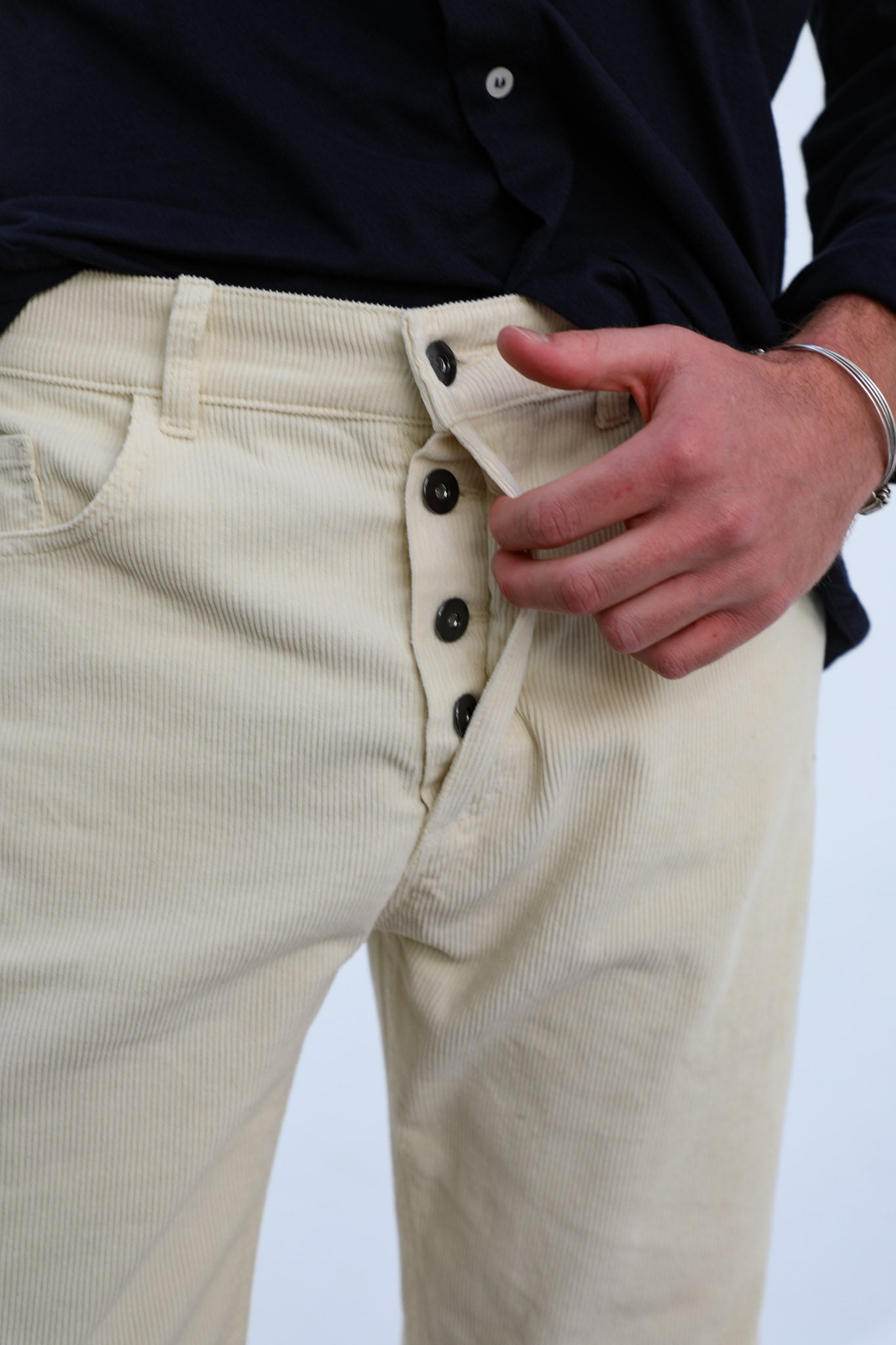 Discover our wide-fit men's pants made from cotton corduroy in a stylish white color. Featuring with button closure, these pants are designed with stud details on the side pockets and two spacious open pockets at the back, adding a modern and functional touch to your wardrobe.