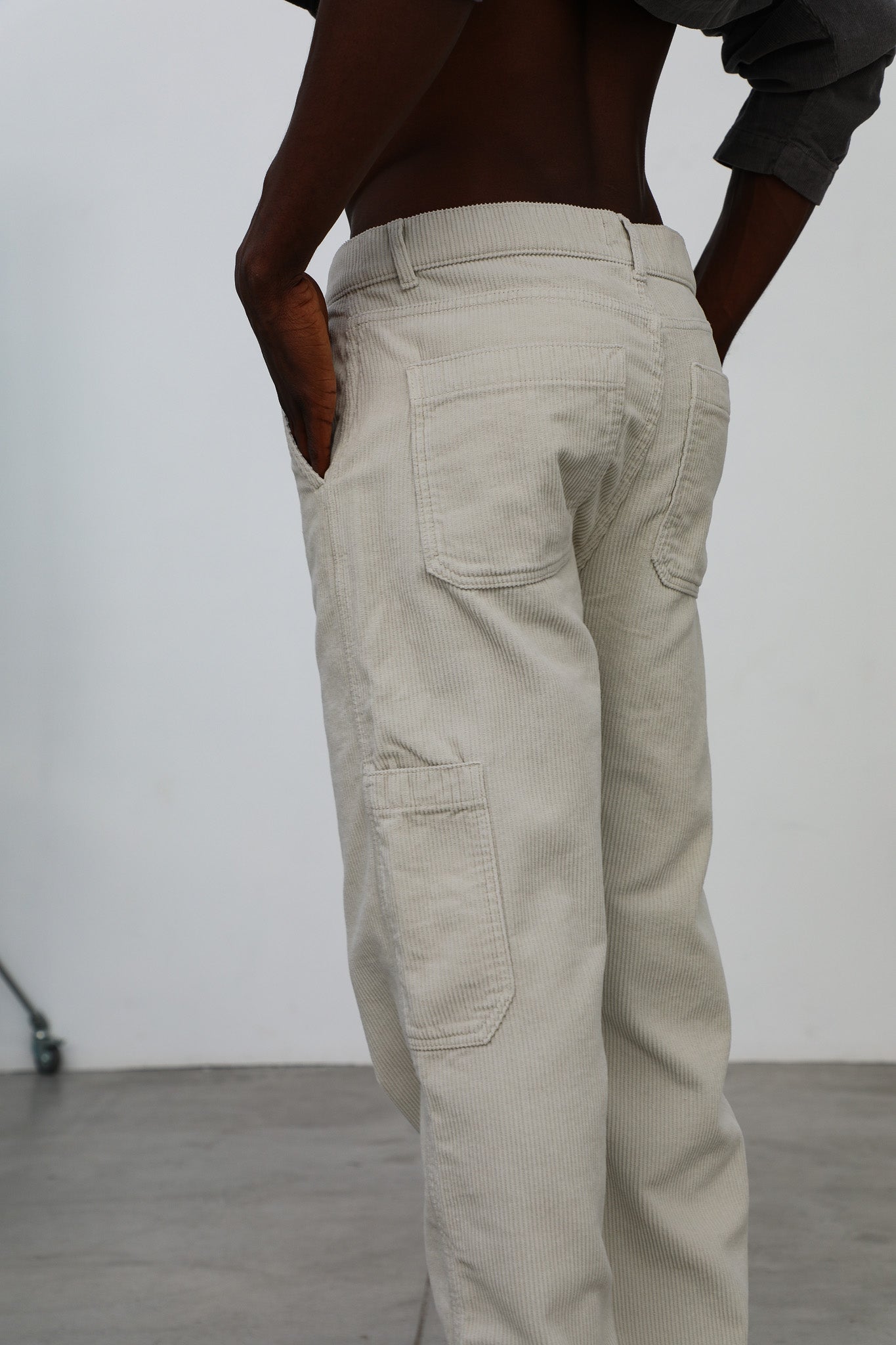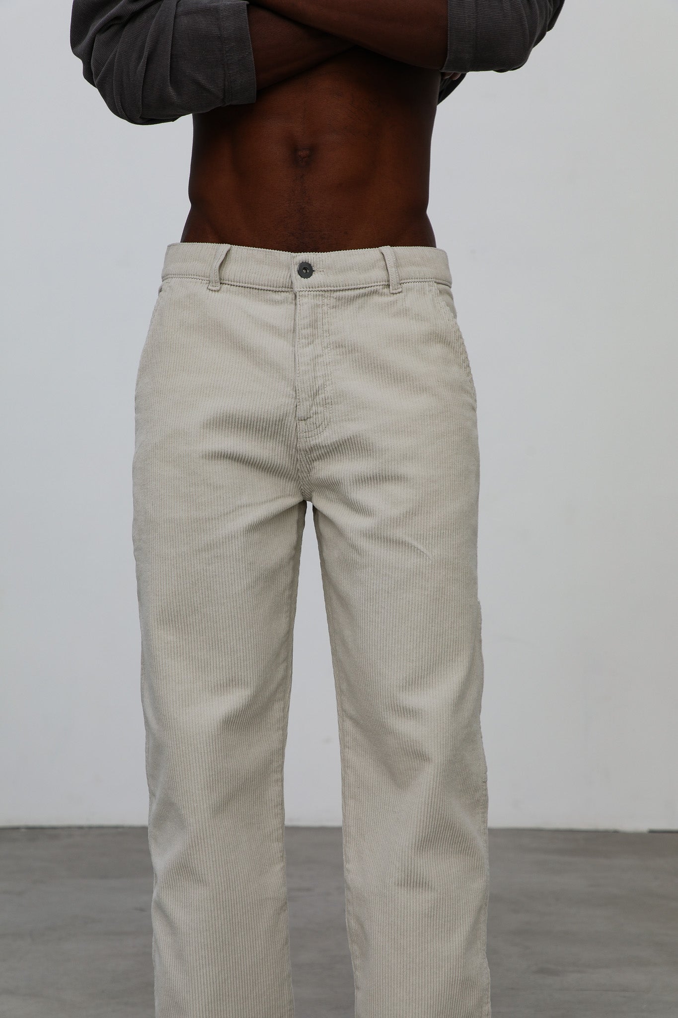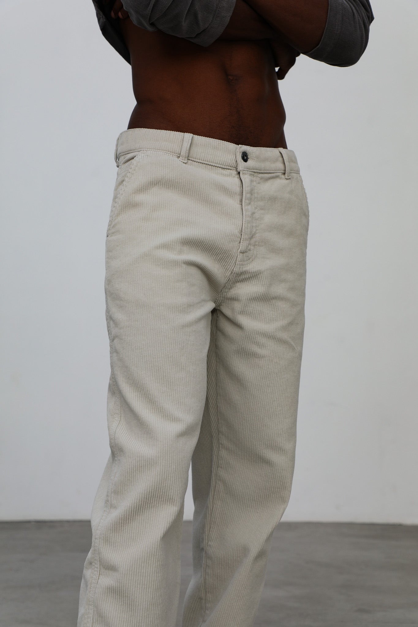 Straight-fit corduroy pants in a natural tone, featuring a buttoned waistband, side pockets, and an additional pocket on the leg.
