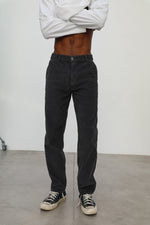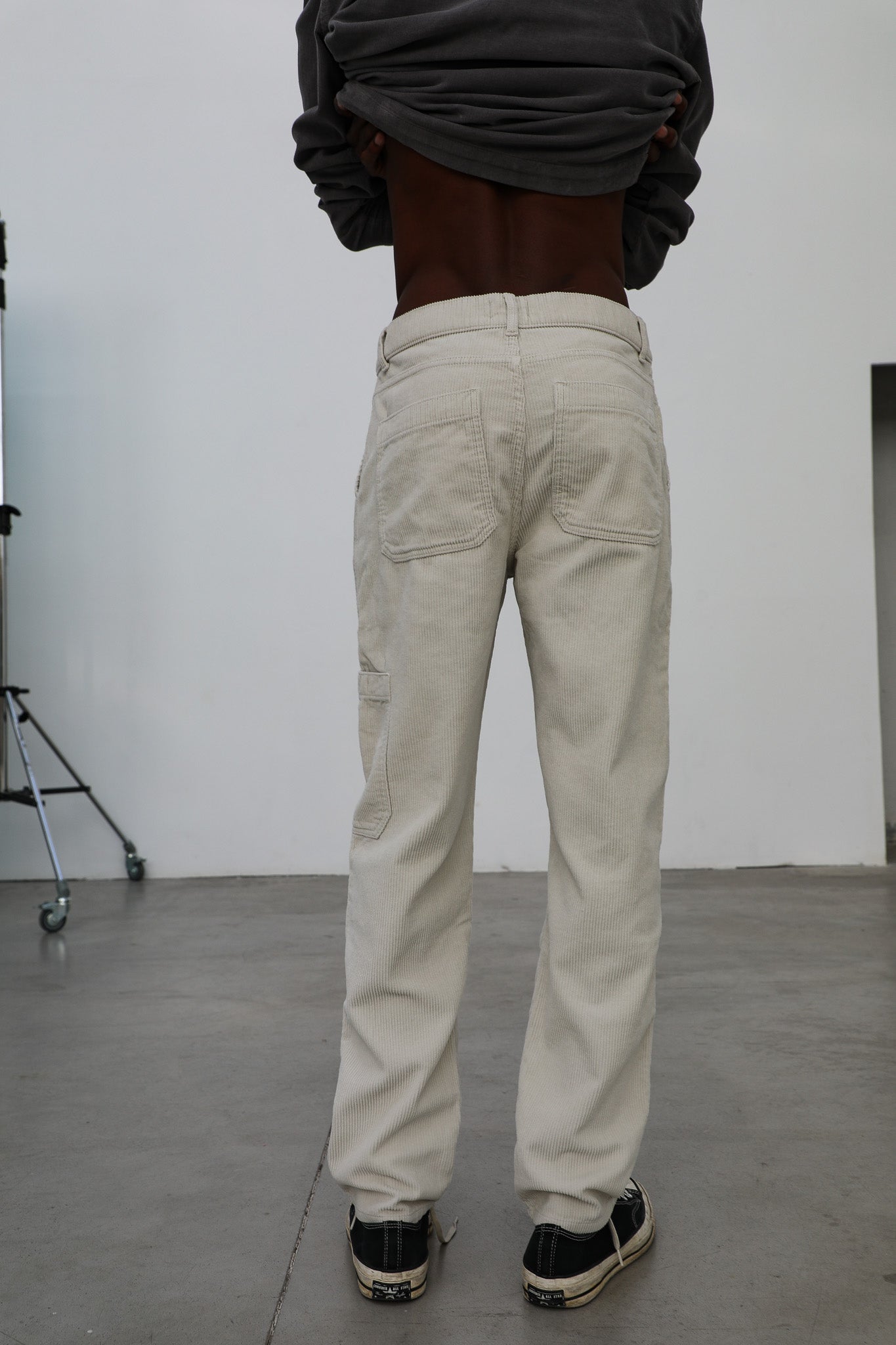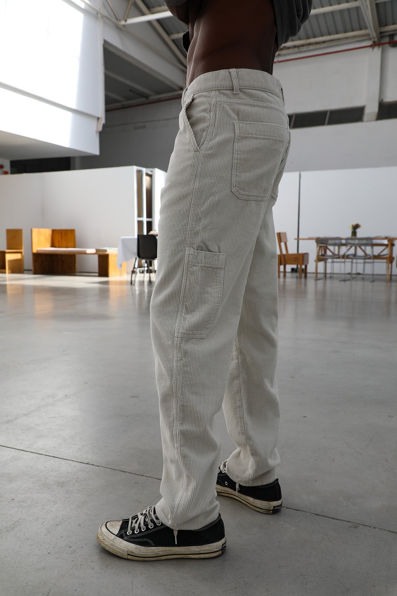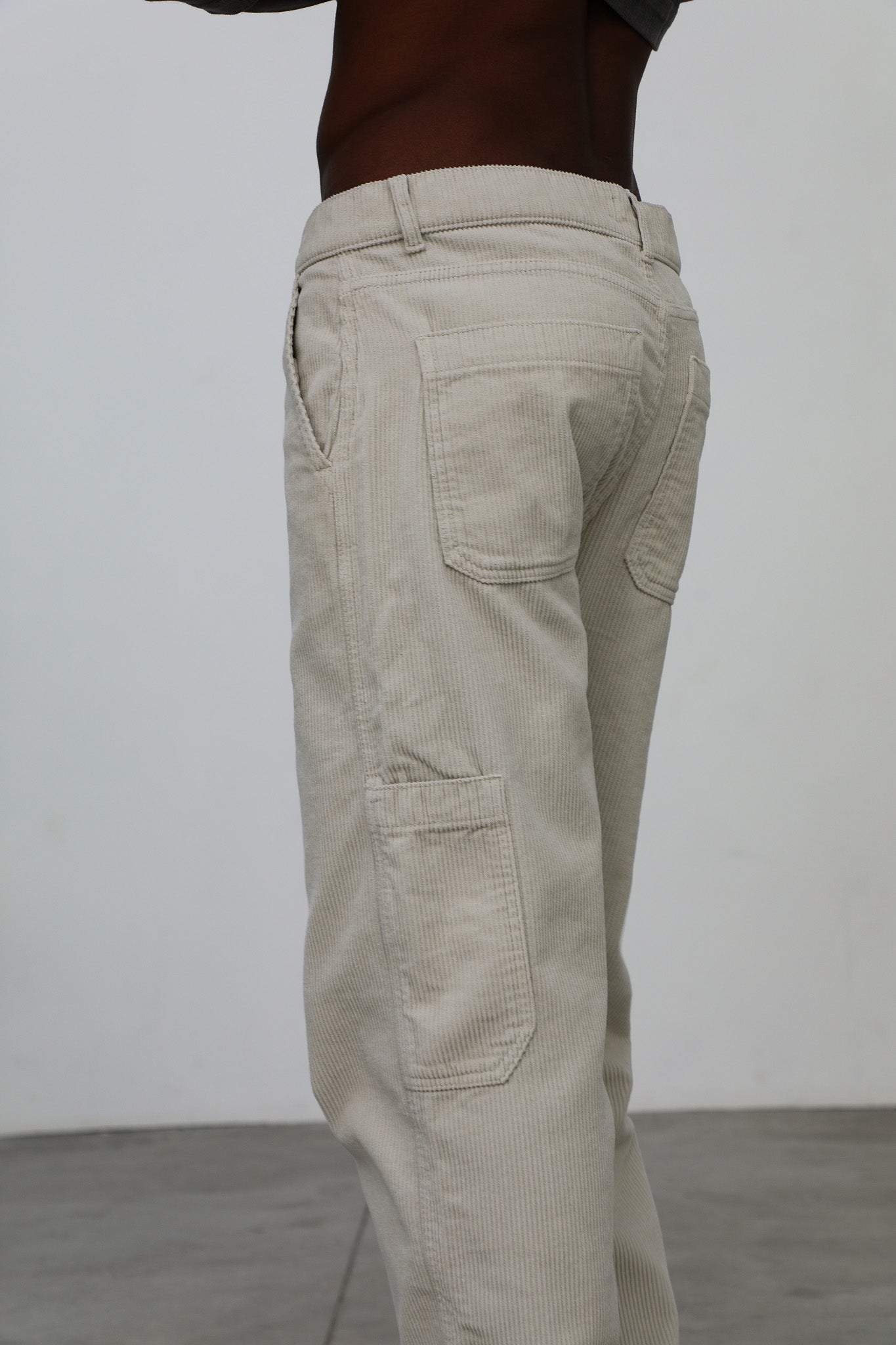 Straight-fit corduroy pants in a natural tone, featuring a buttoned waistband, side pockets, and an additional pocket on the leg.