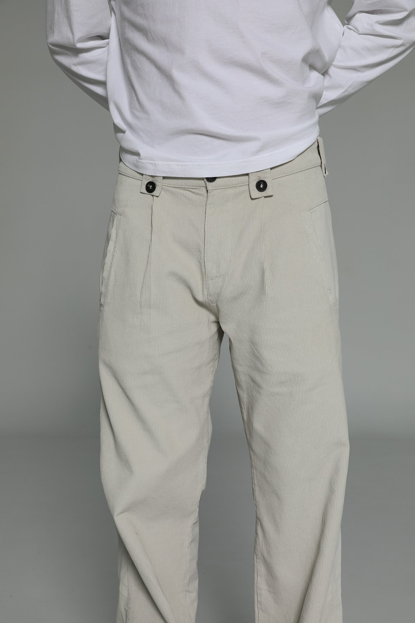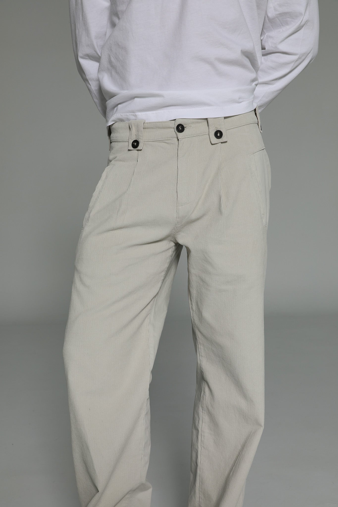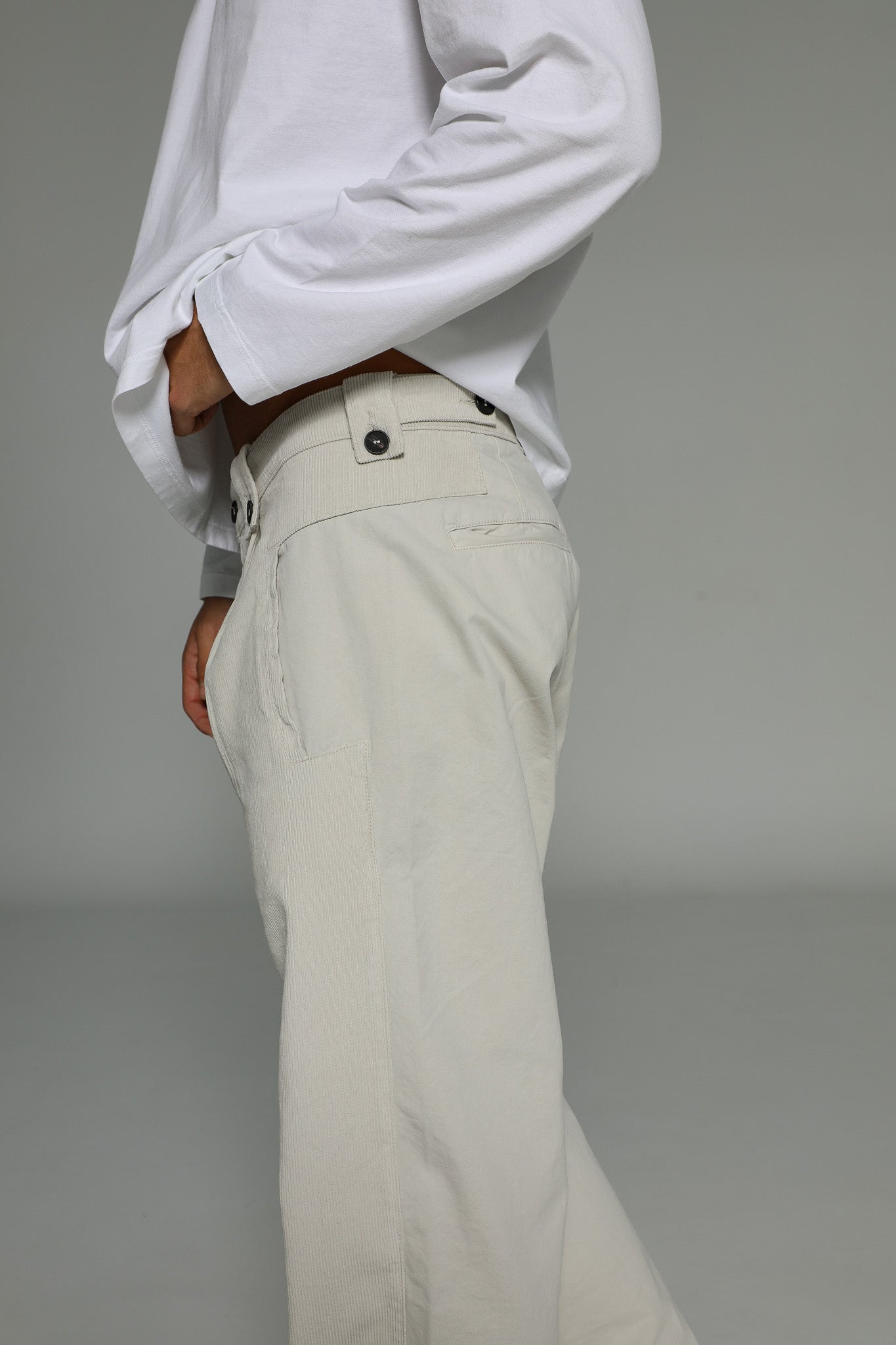 Wide-leg pants featuring natural corduroy on the front and sarga fabric on the back, designed with front darts, a button closure at the waist, and a back detail for a distinctive double-fabric look.