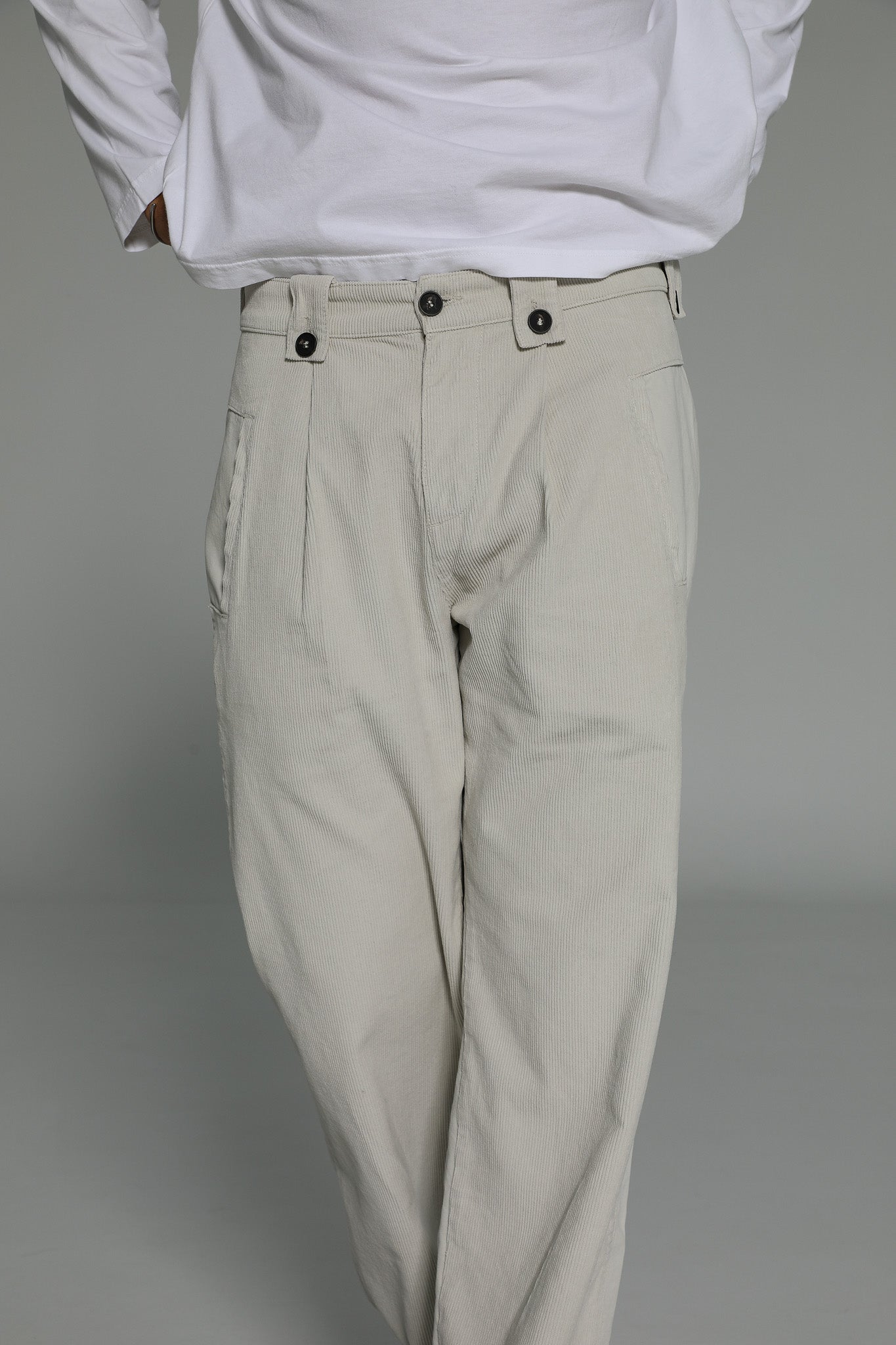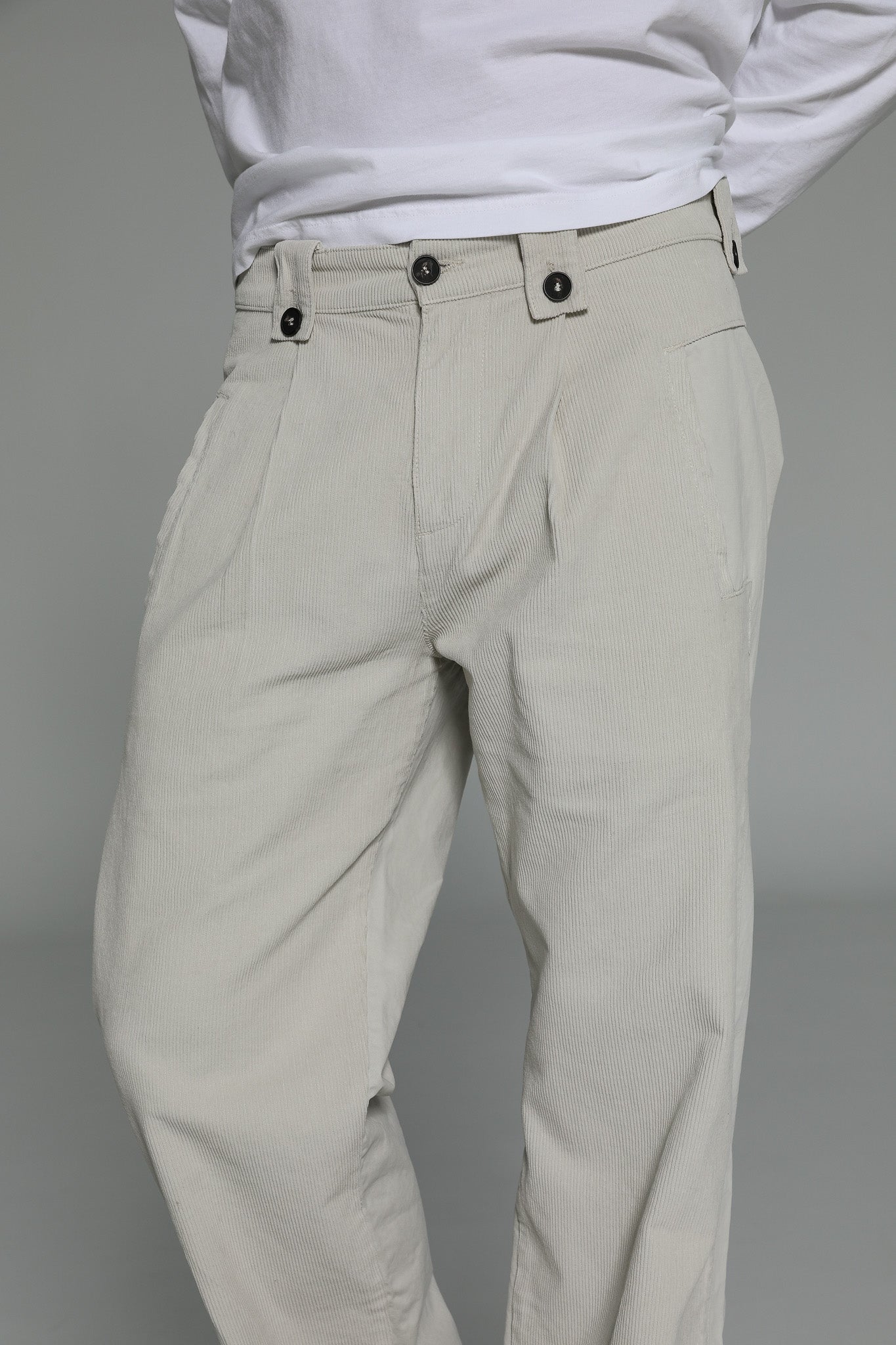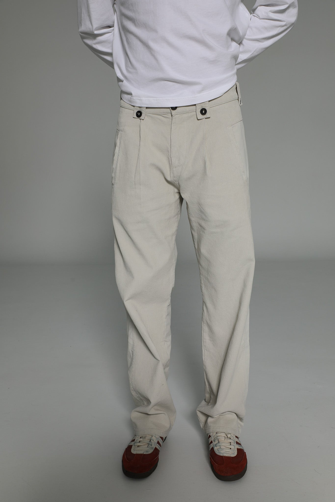 Wide-leg pants featuring natural corduroy on the front and sarga fabric on the back, designed with front darts, a button closure at the waist, and a back detail for a distinctive double-fabric look.