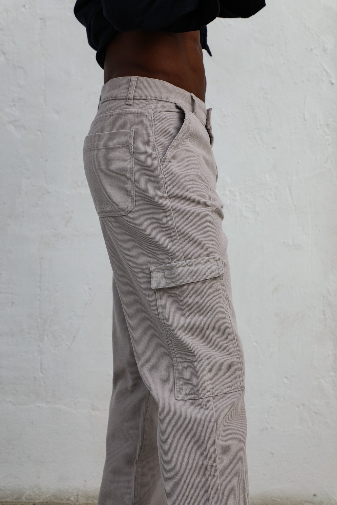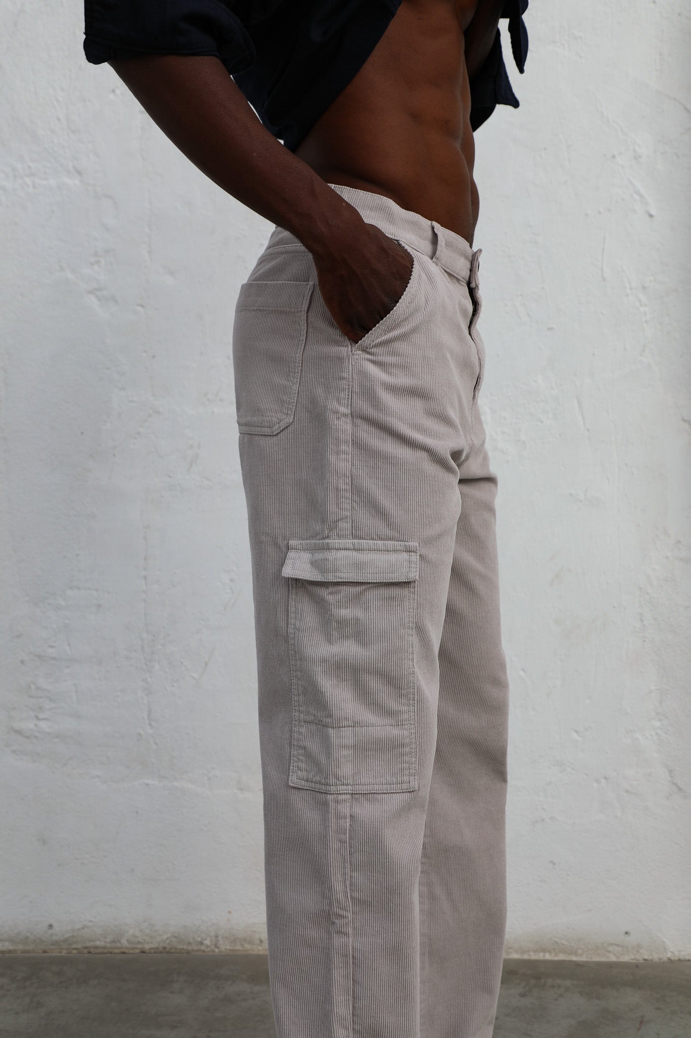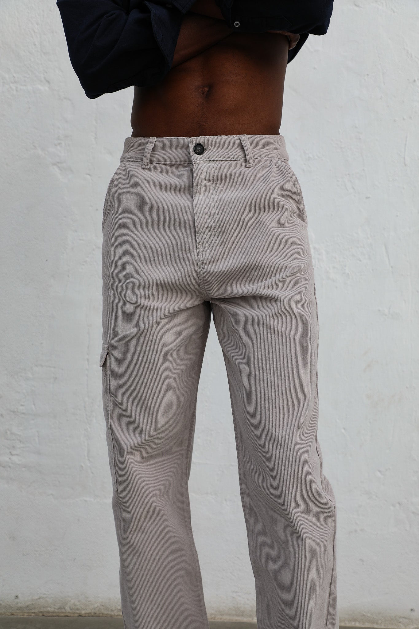 Wide-fit corduroy pants in grey, designed with a button closure at the waist and a large side pocket.