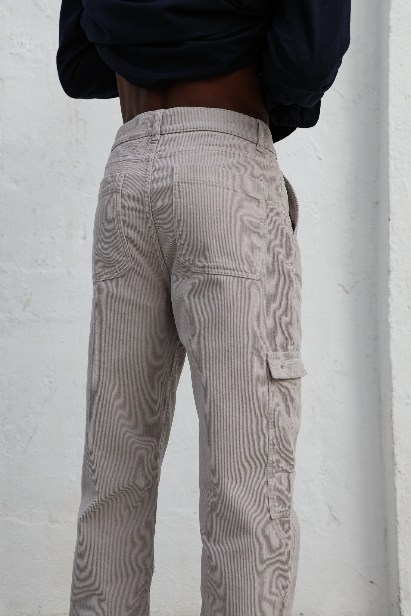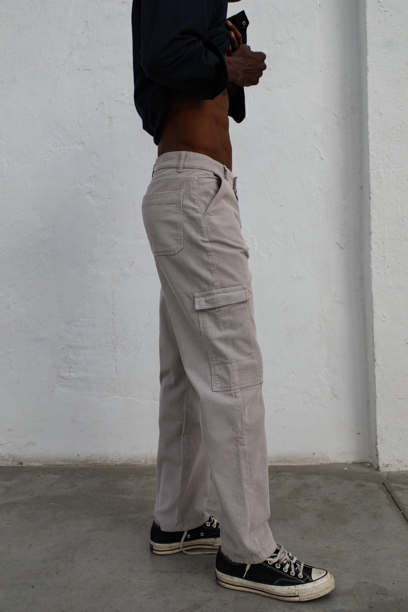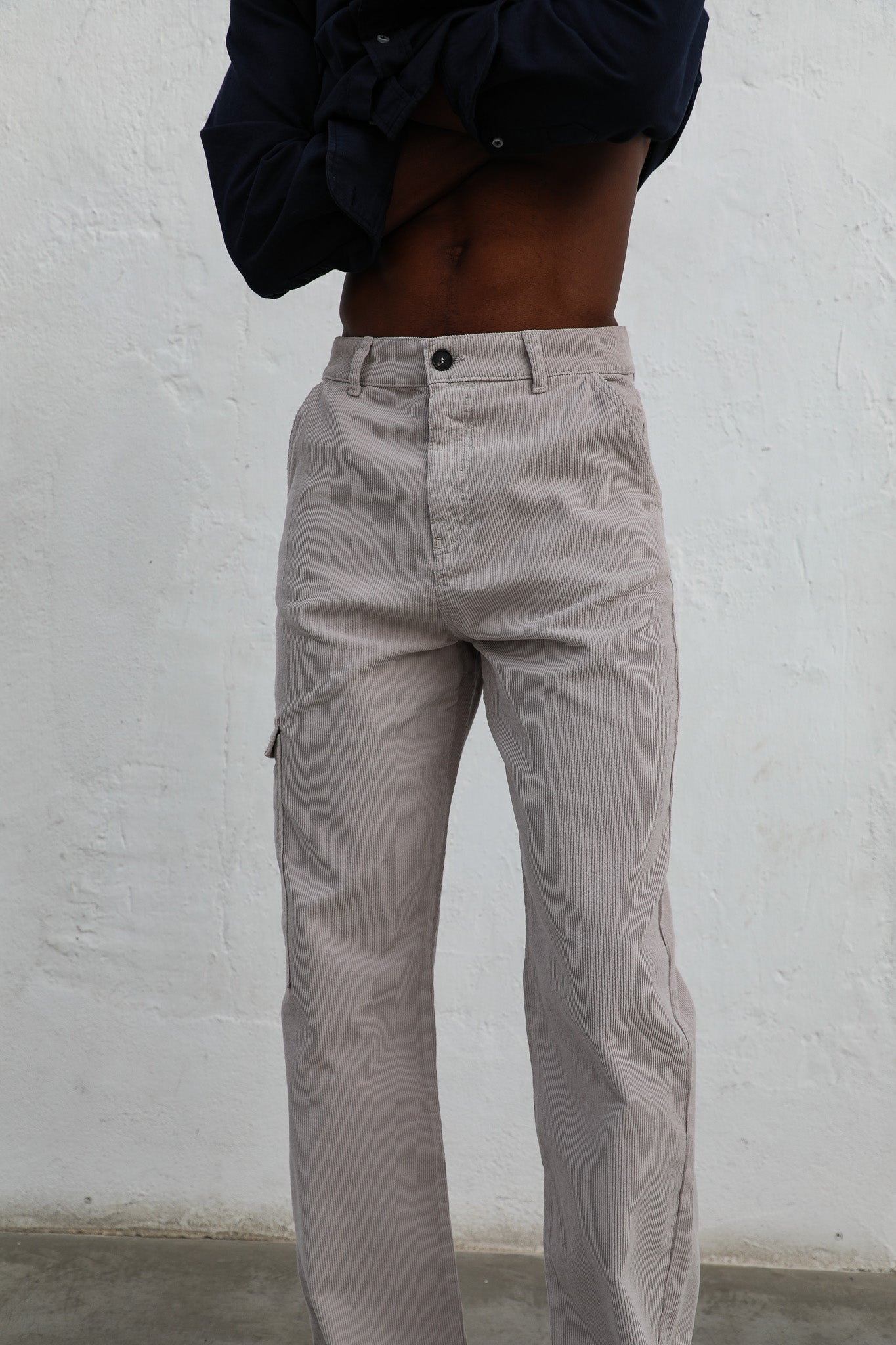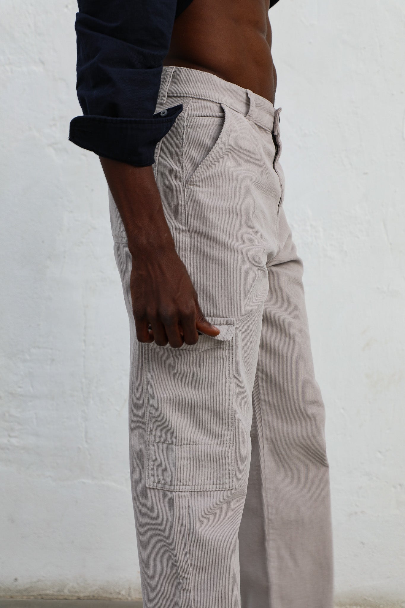 Wide-fit corduroy pants in grey, designed with a button closure at the waist and a large side pocket.