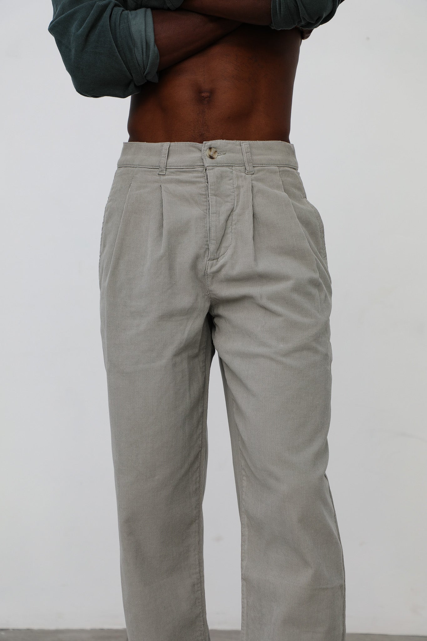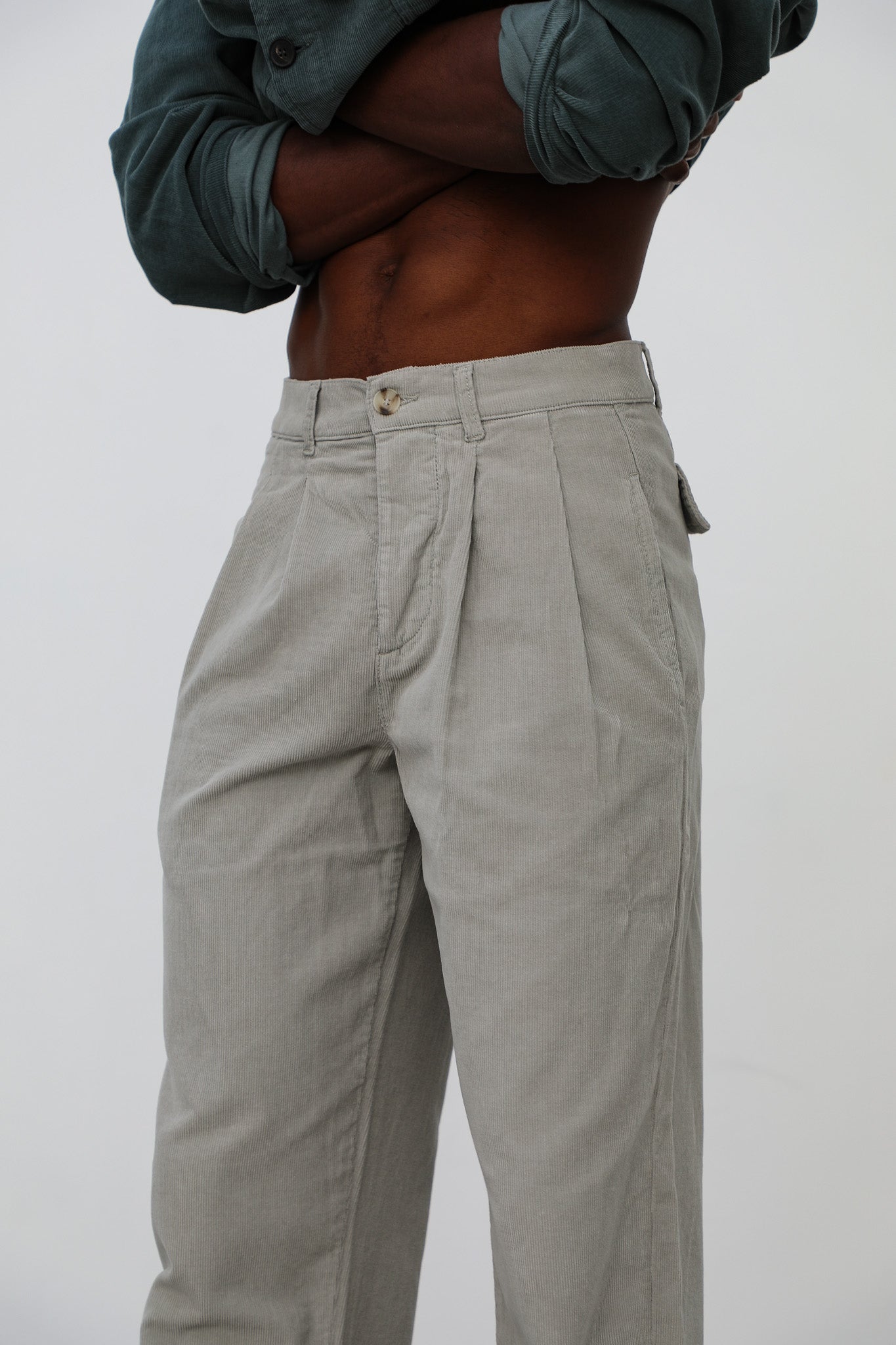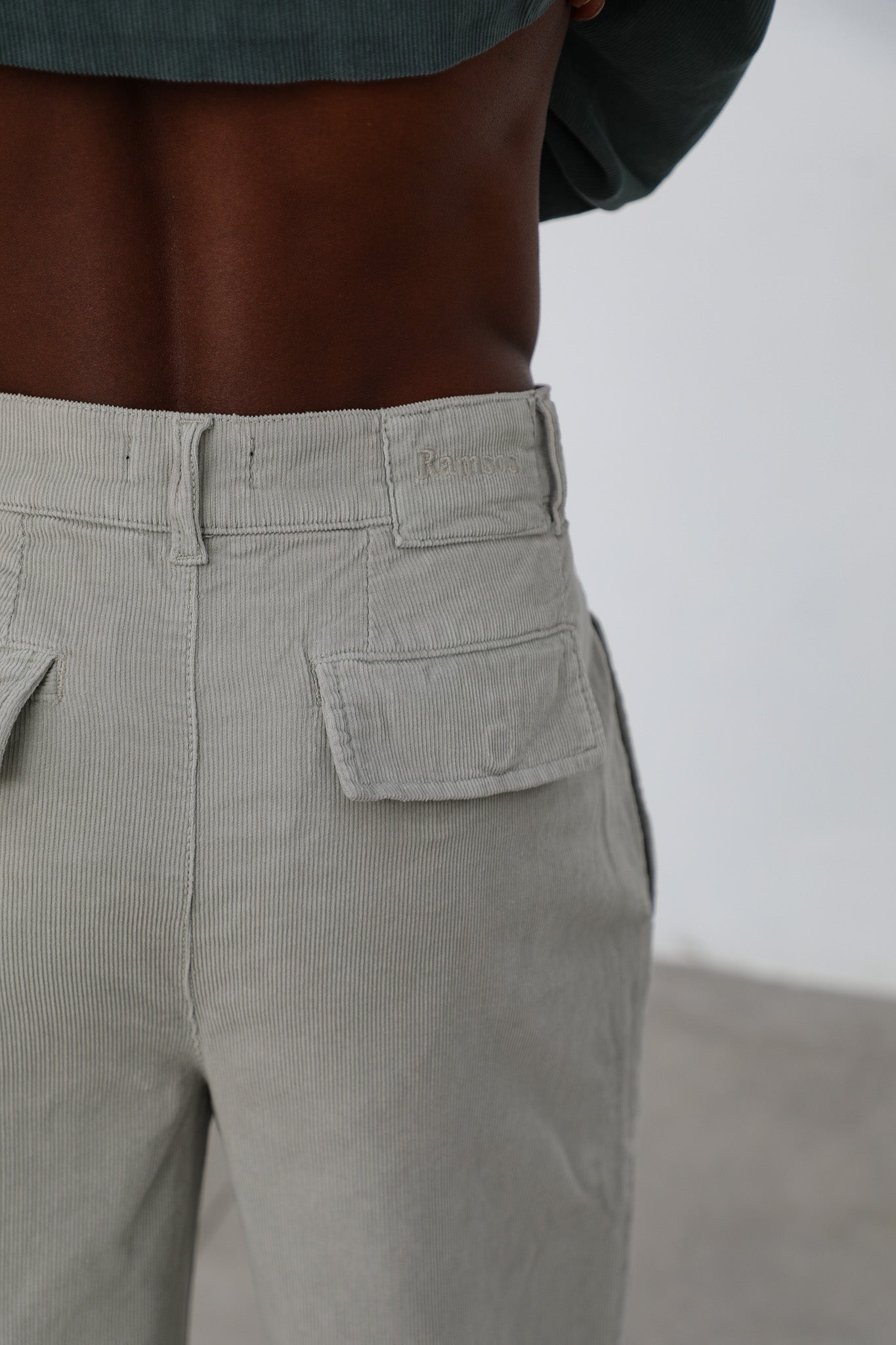 Wide corduroy pants with darts in beige, button at the waist and back logo detail.