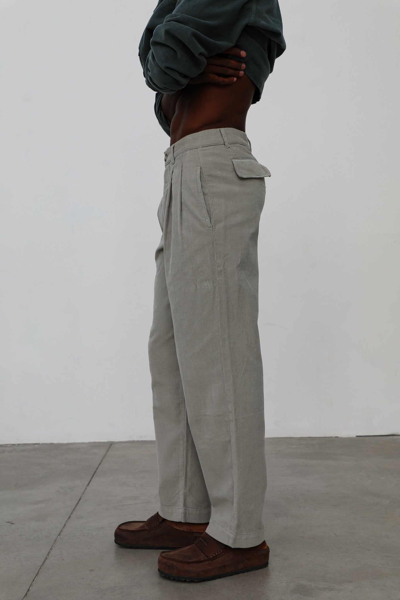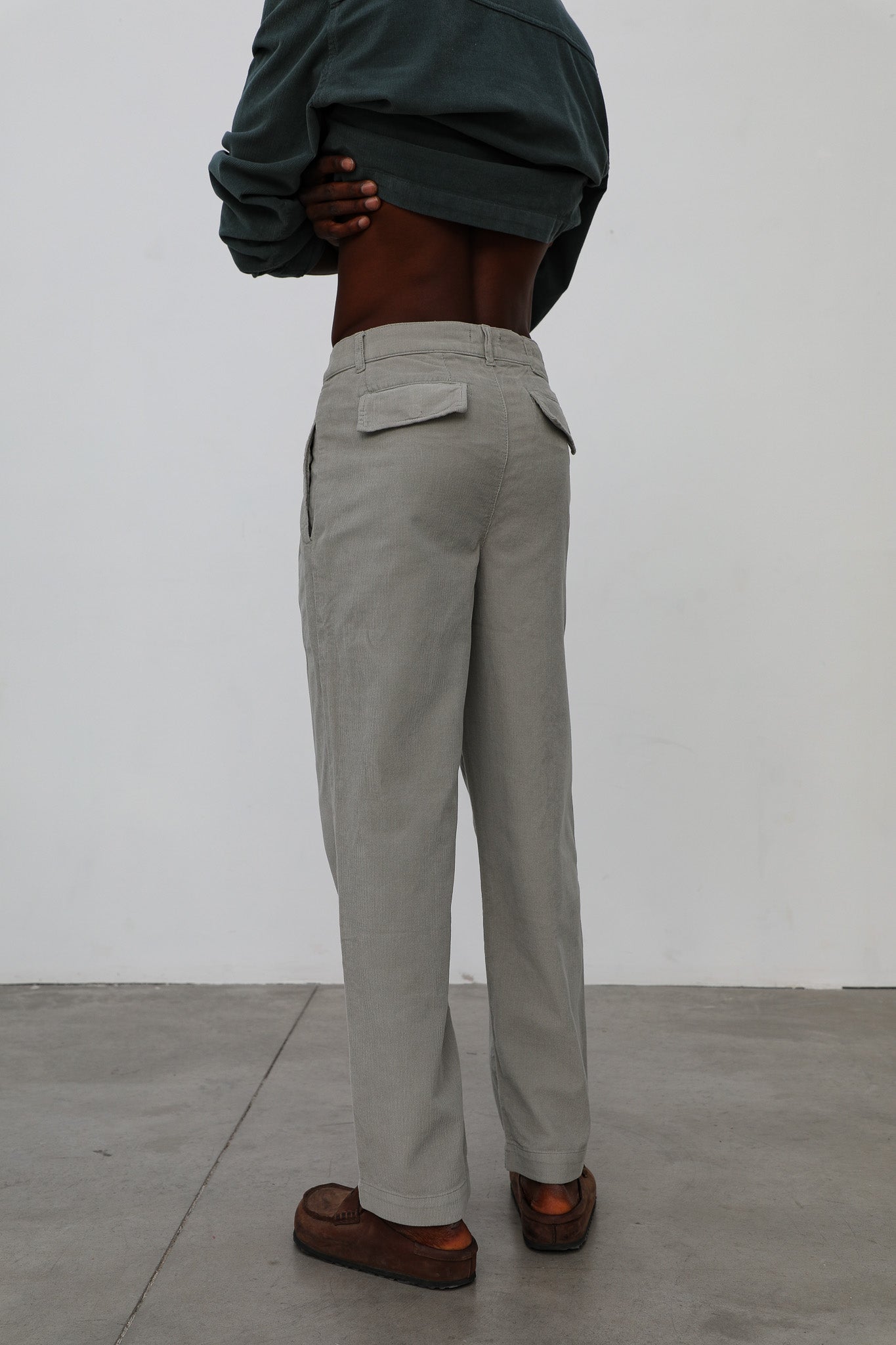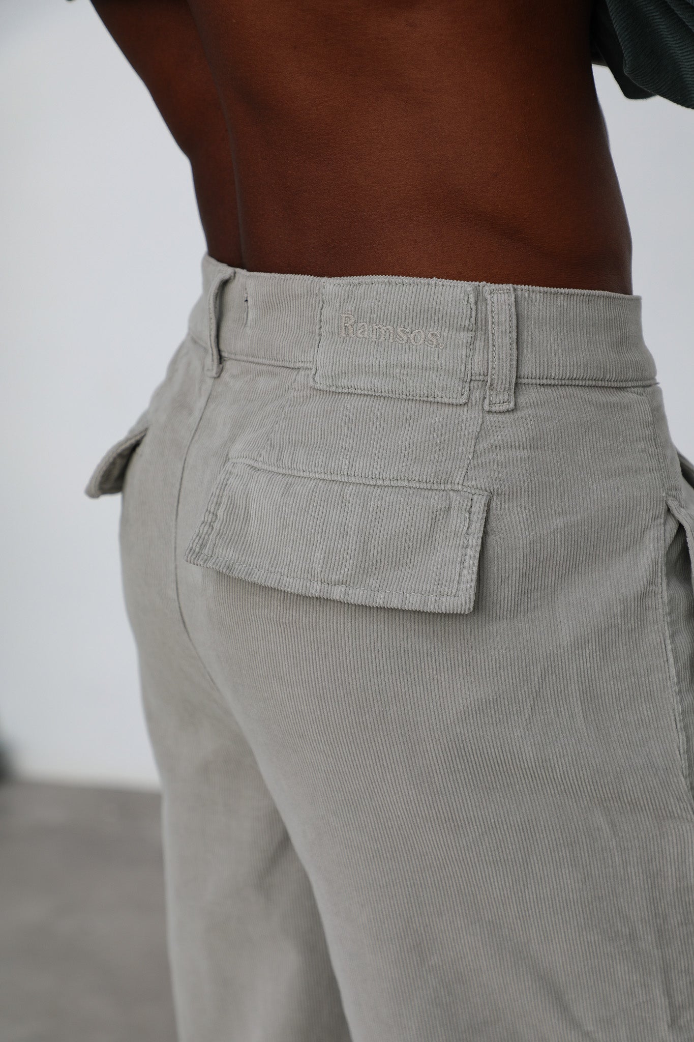 Wide corduroy pants with darts in beige, button at the waist and back logo detail.