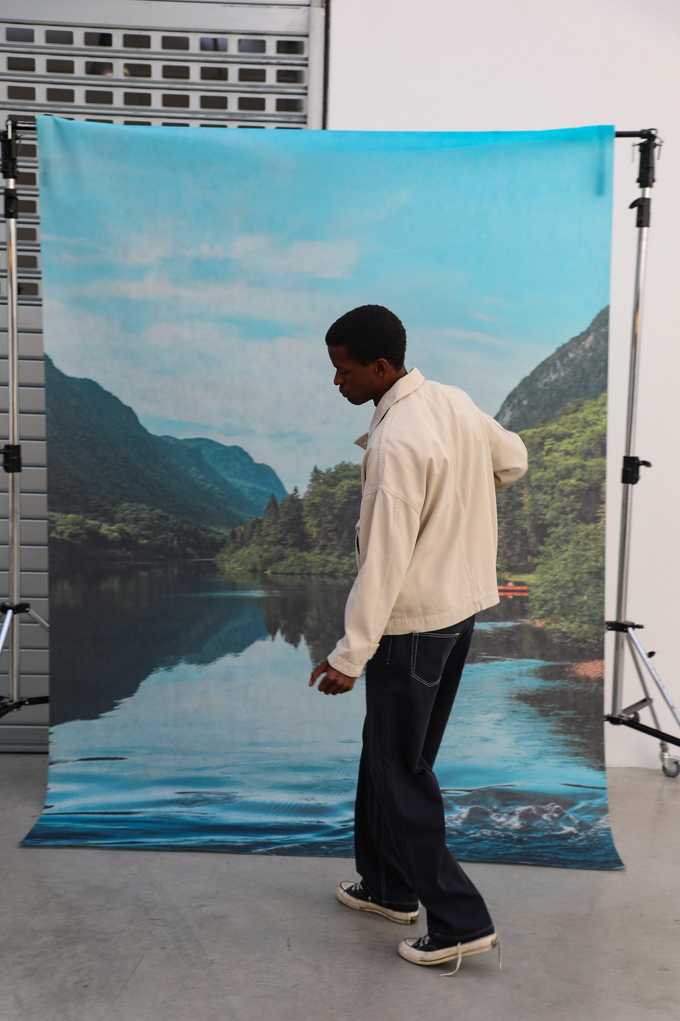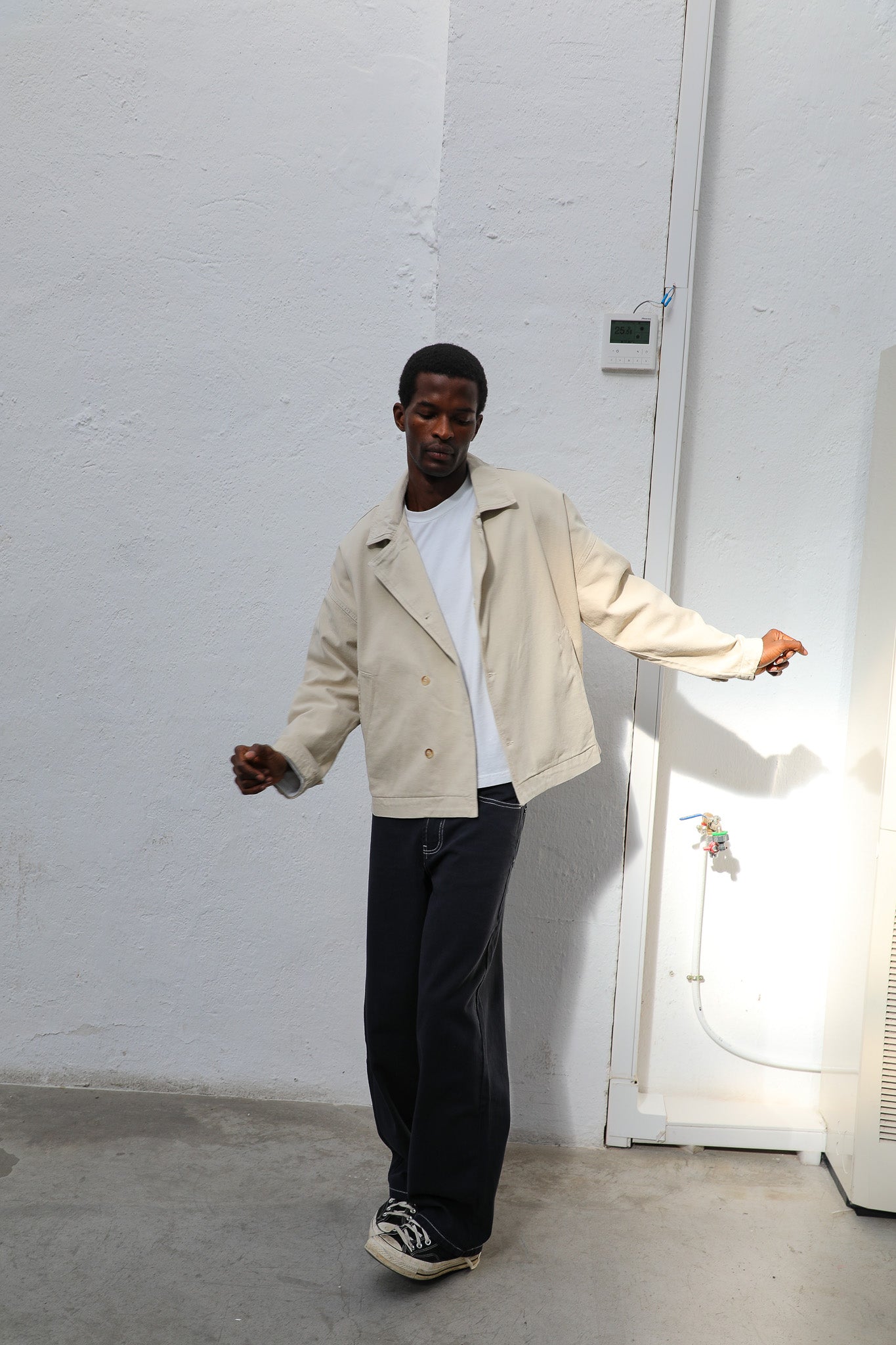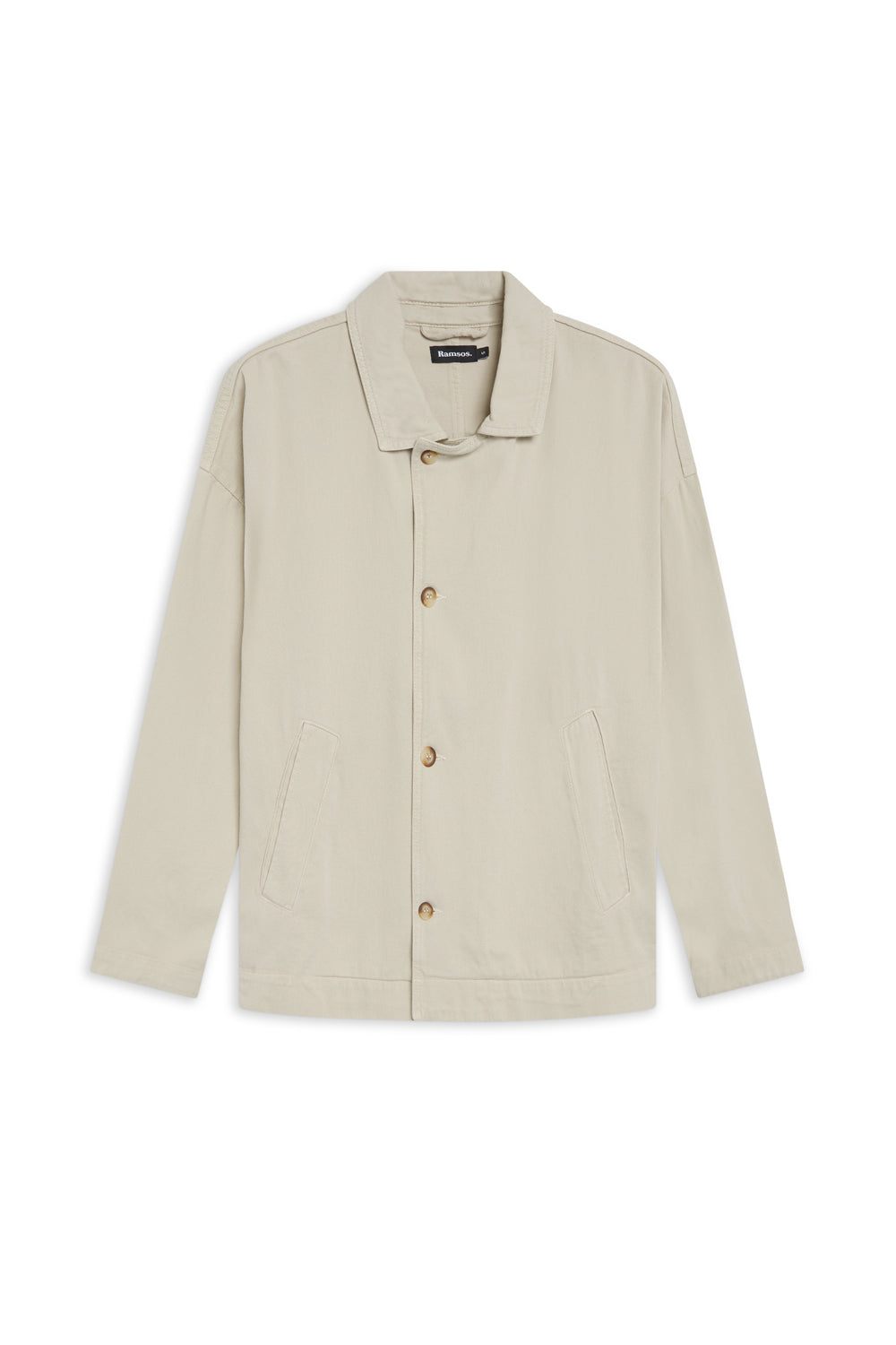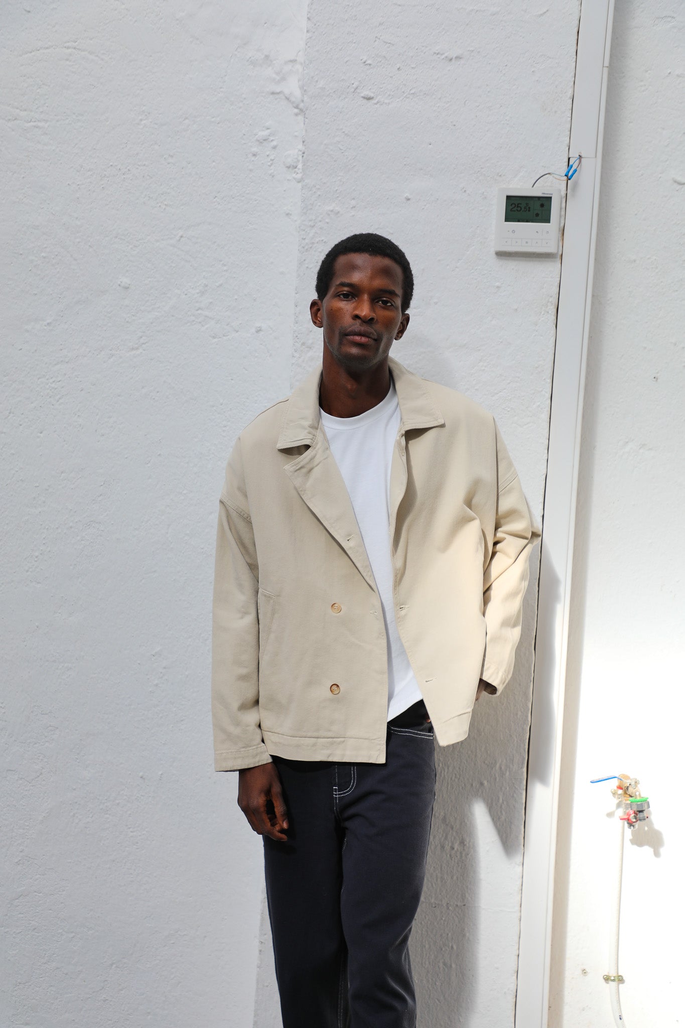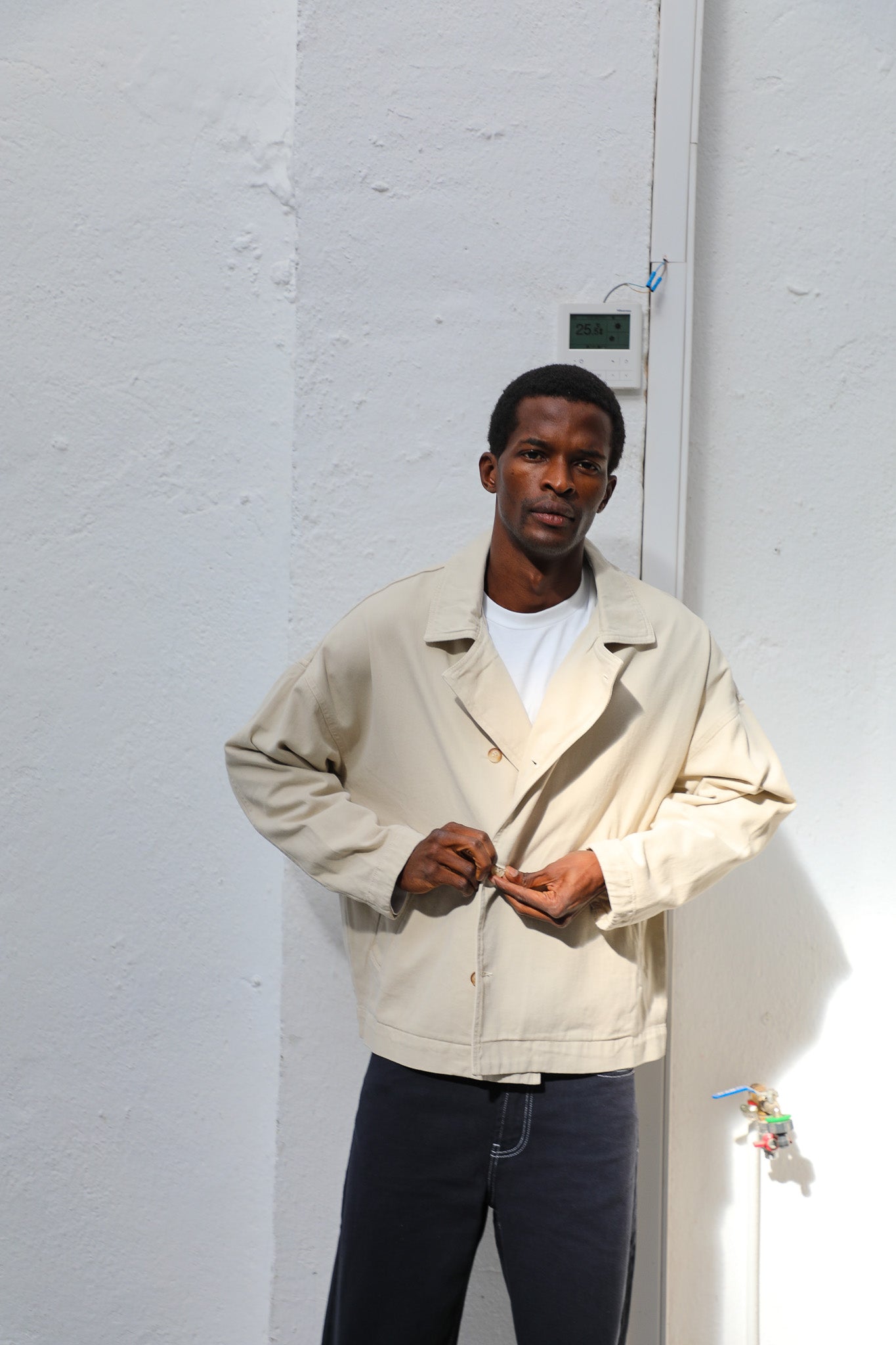 Beige jacket featuring an asymmetric button closure and a modern, boxy fit.