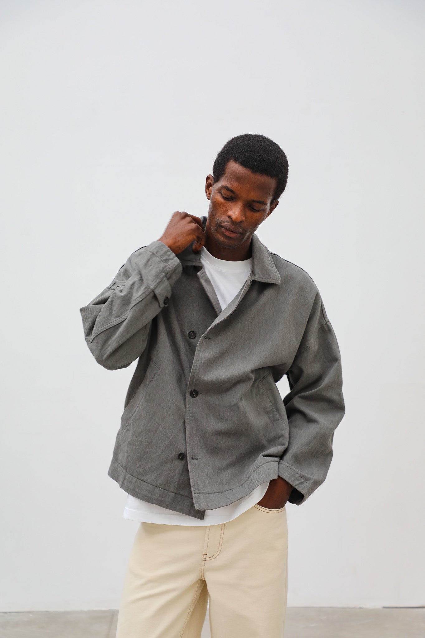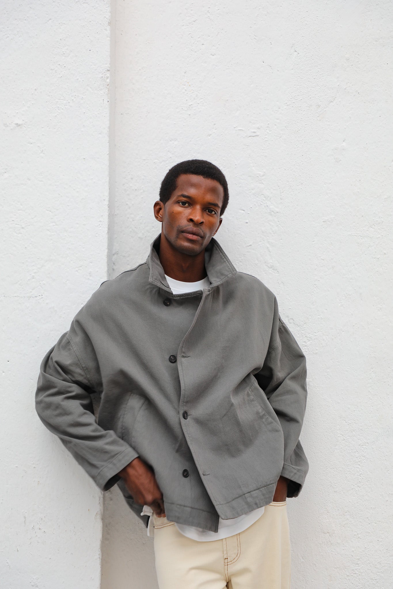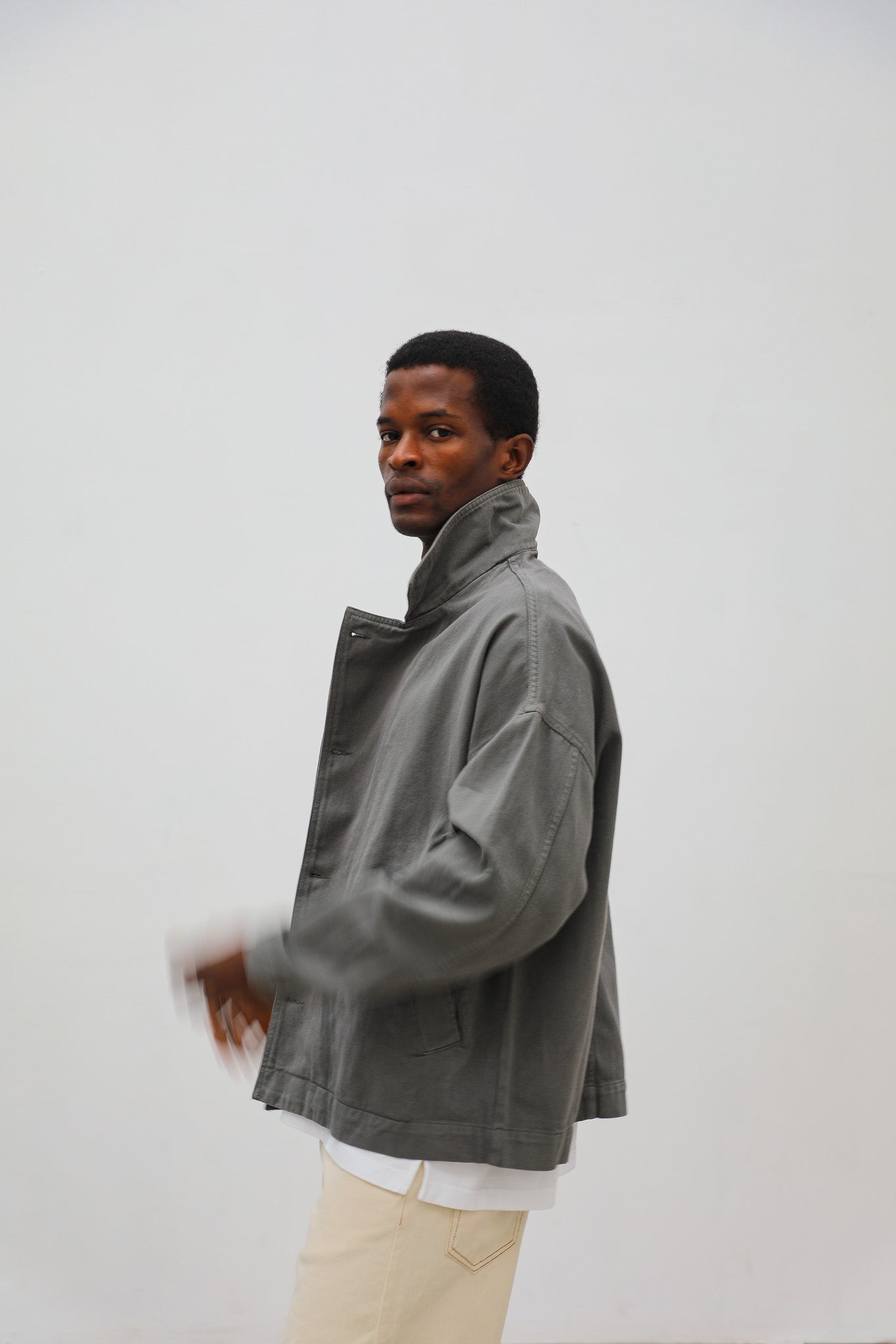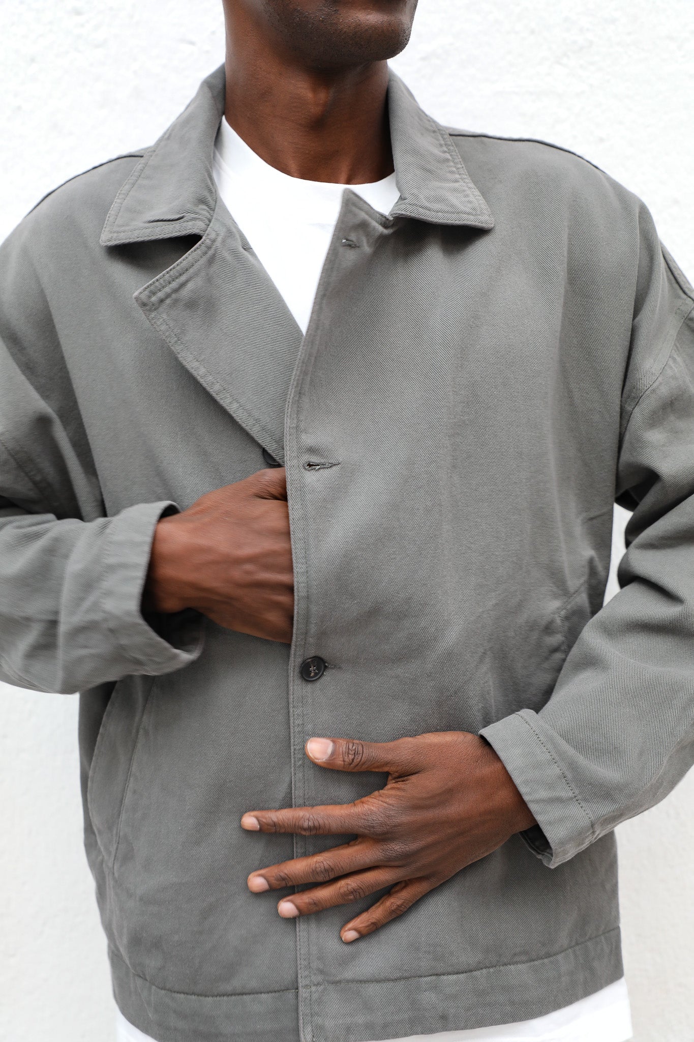 Green jacket featuring an asymmetric button closure and a modern, boxy fit.