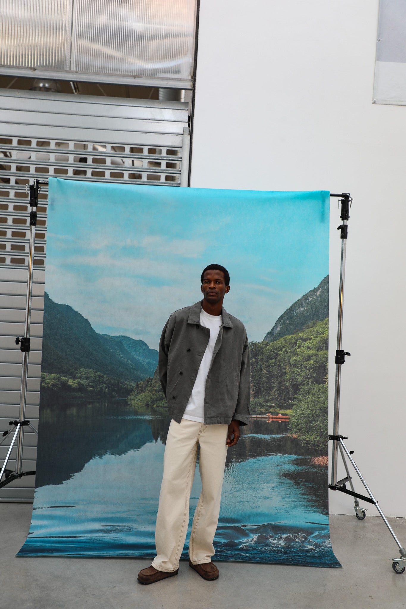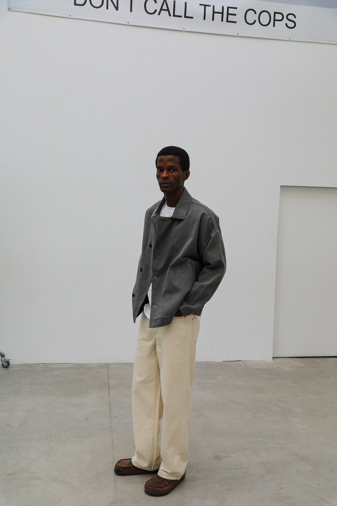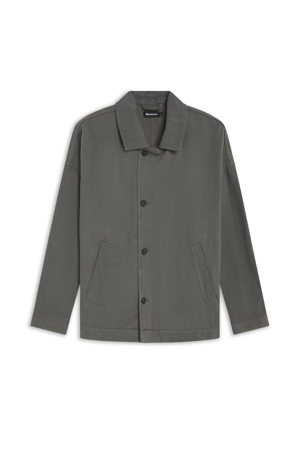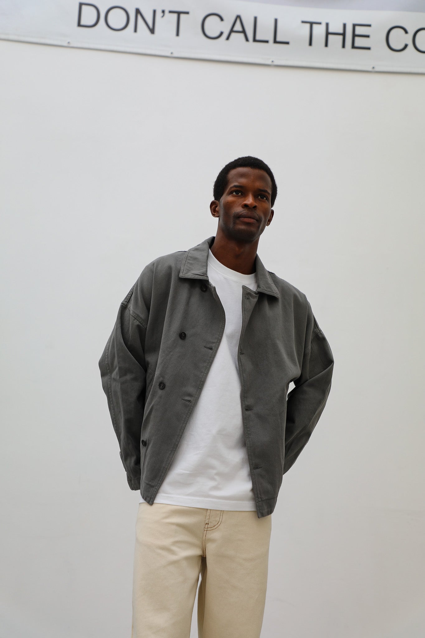 Green jacket featuring an asymmetric button closure and a modern, boxy fit.