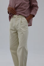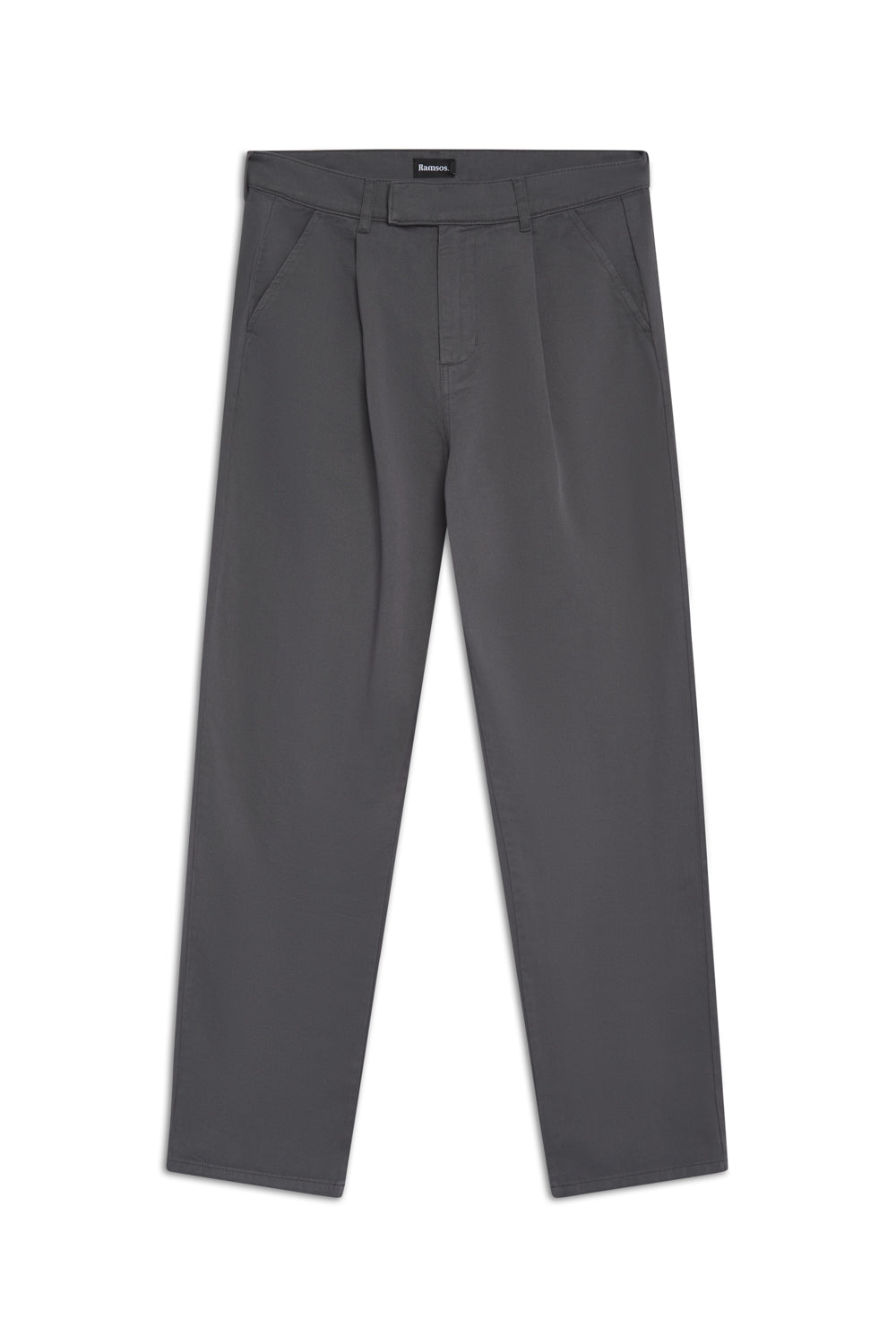 Wide-leg dark grey trousers with front pleats and a side-crossed button closure at the waist.
