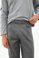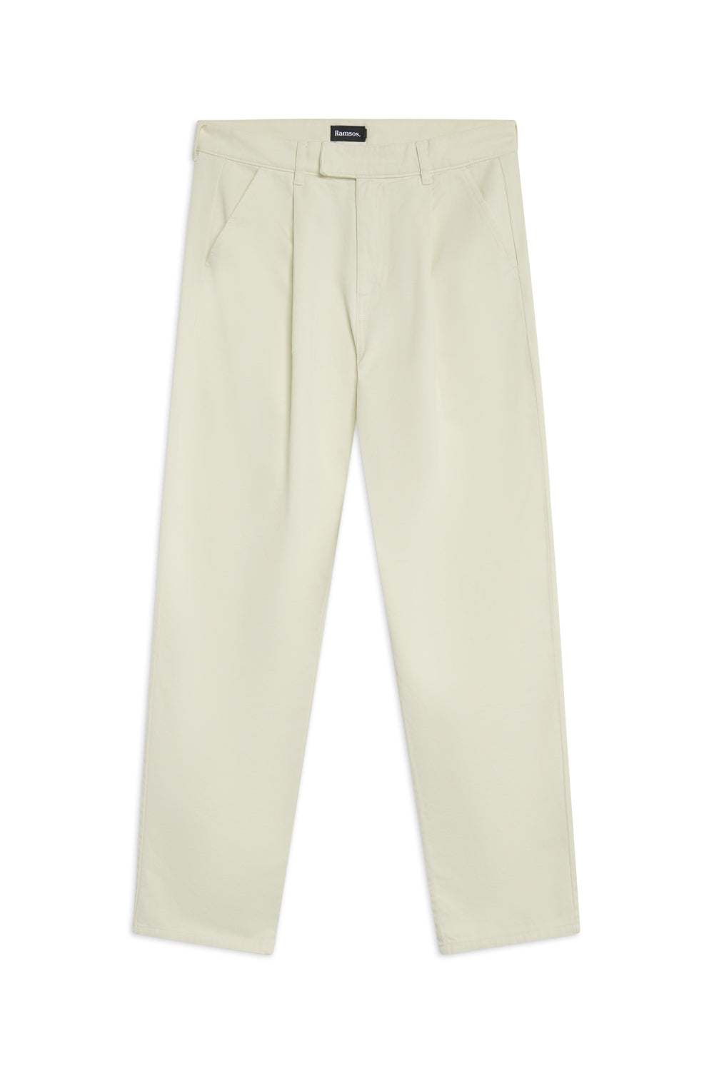 Wide-leg natural trousers with front pleats and a side-crossed button closure at the waist.