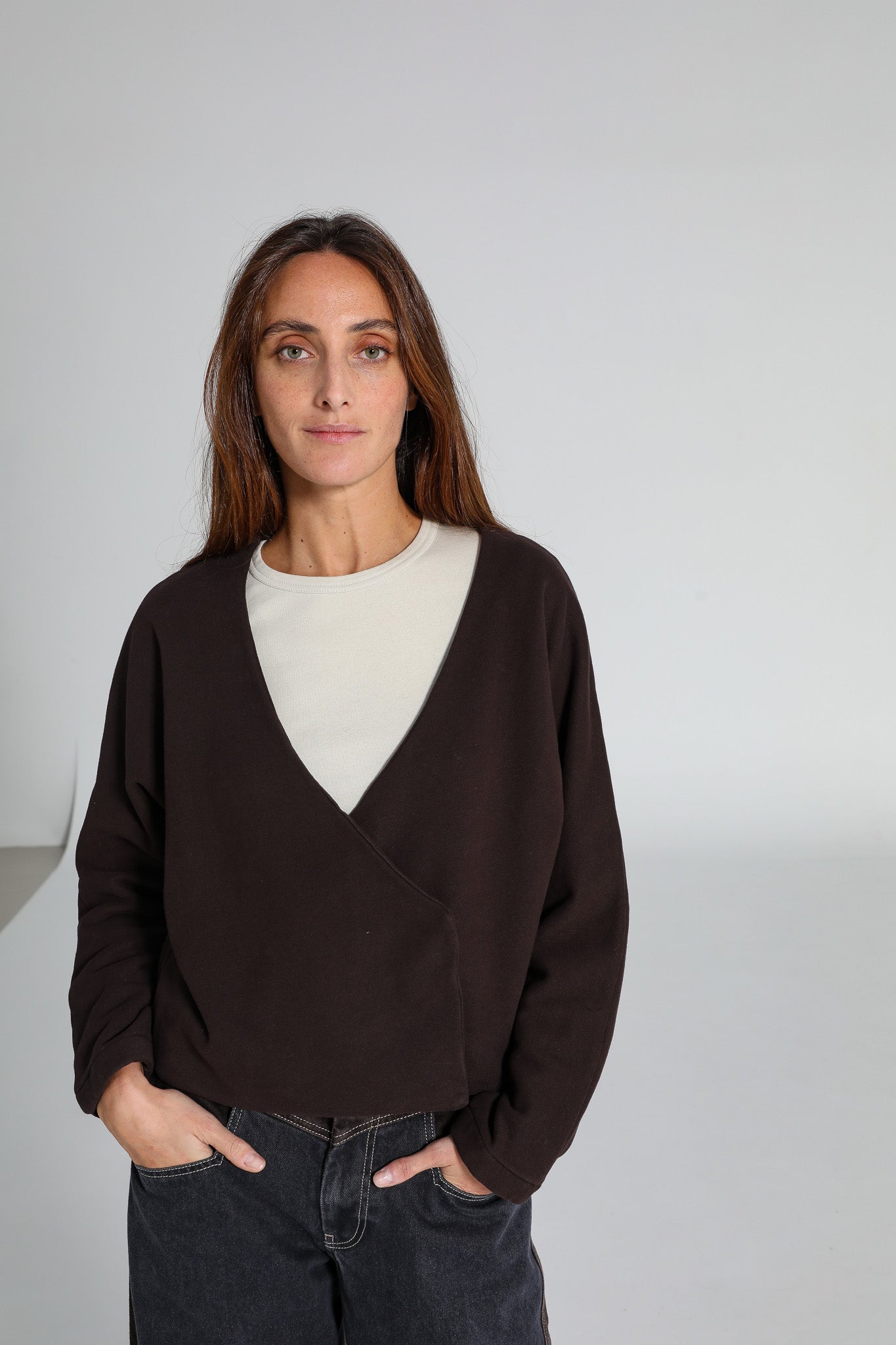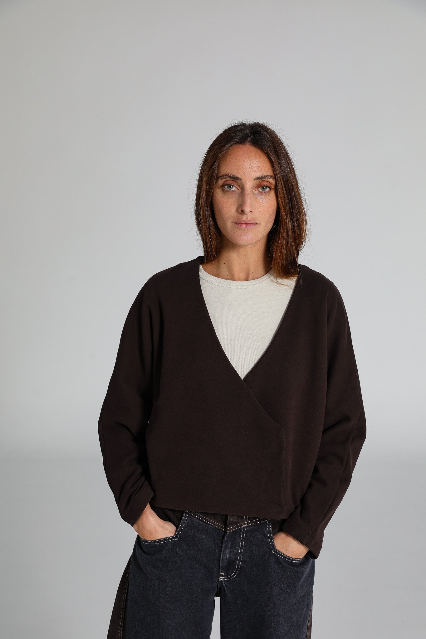 Brown V-neck top featuring a crossed front design with a pronounced neckline and a short, fitted cut