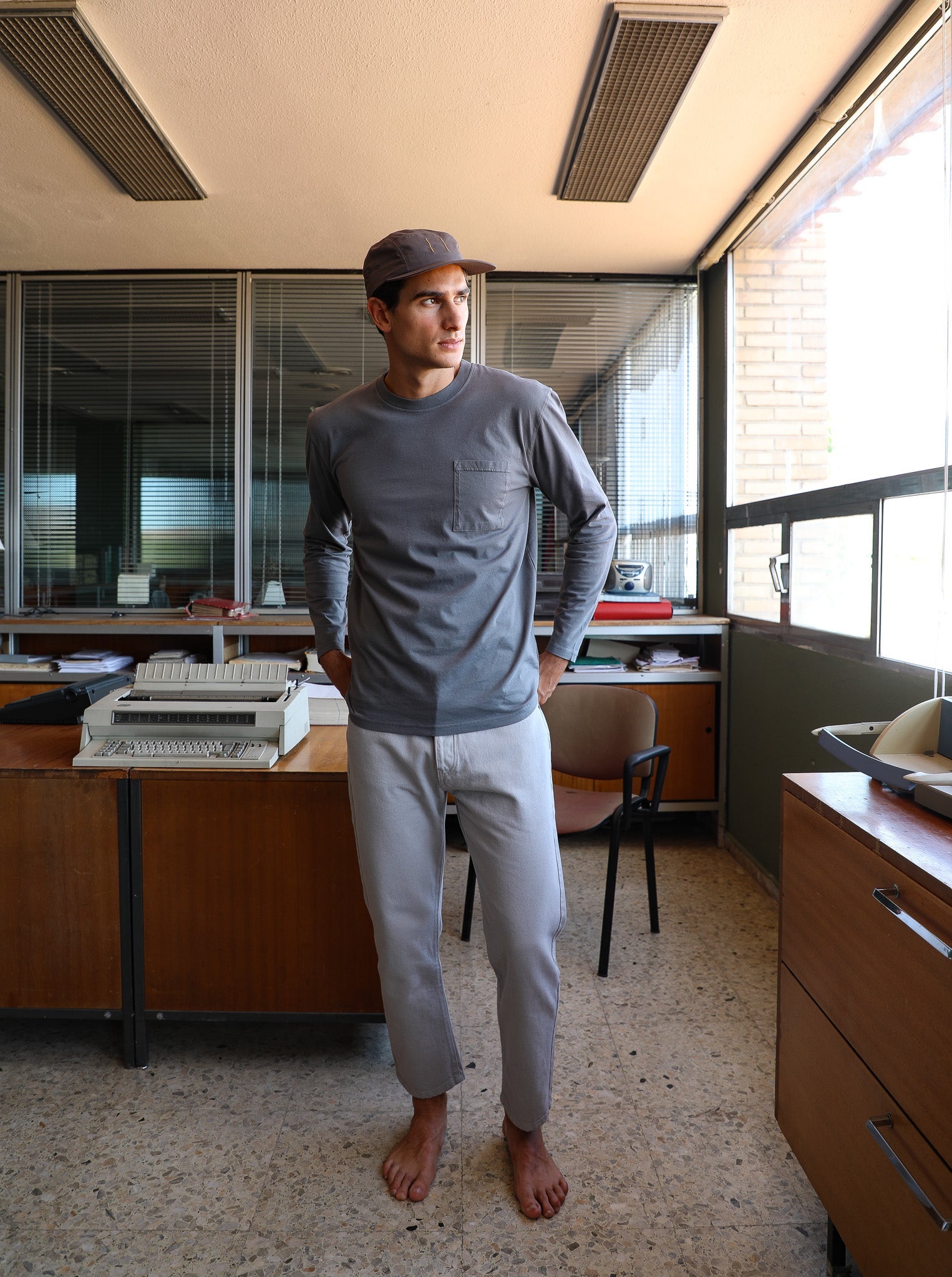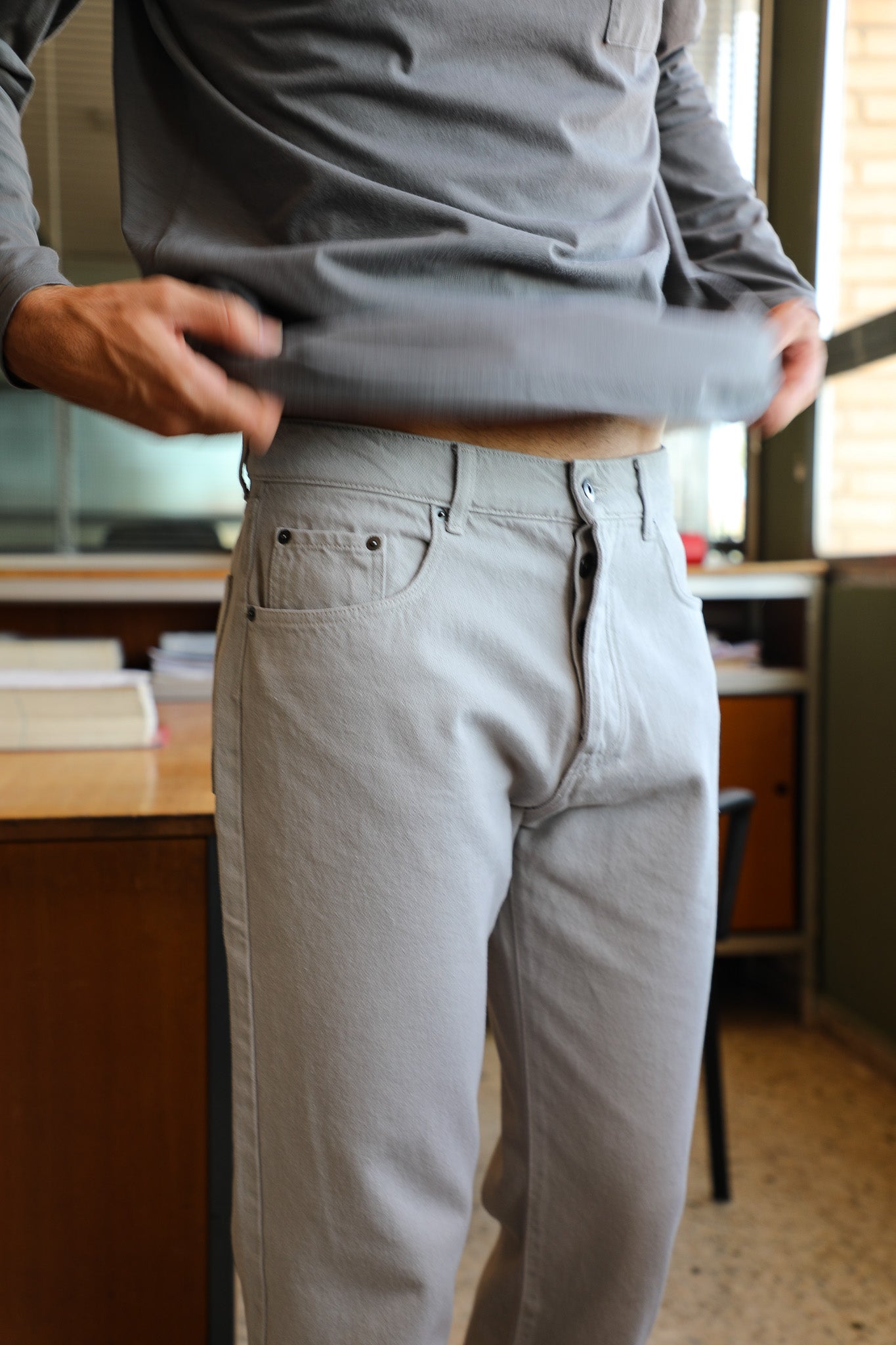Discover our wide-fit men's pants made from soft organic cotton denim in a stylish light grey color. Featuring a front button and zipper closure, these pants are designed with stud details on the side pockets and two spacious open pockets at the back, adding a modern and functional touch to your wardrobe.