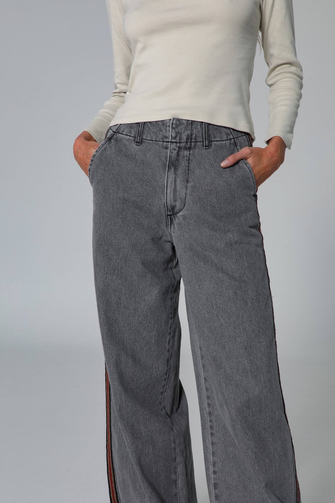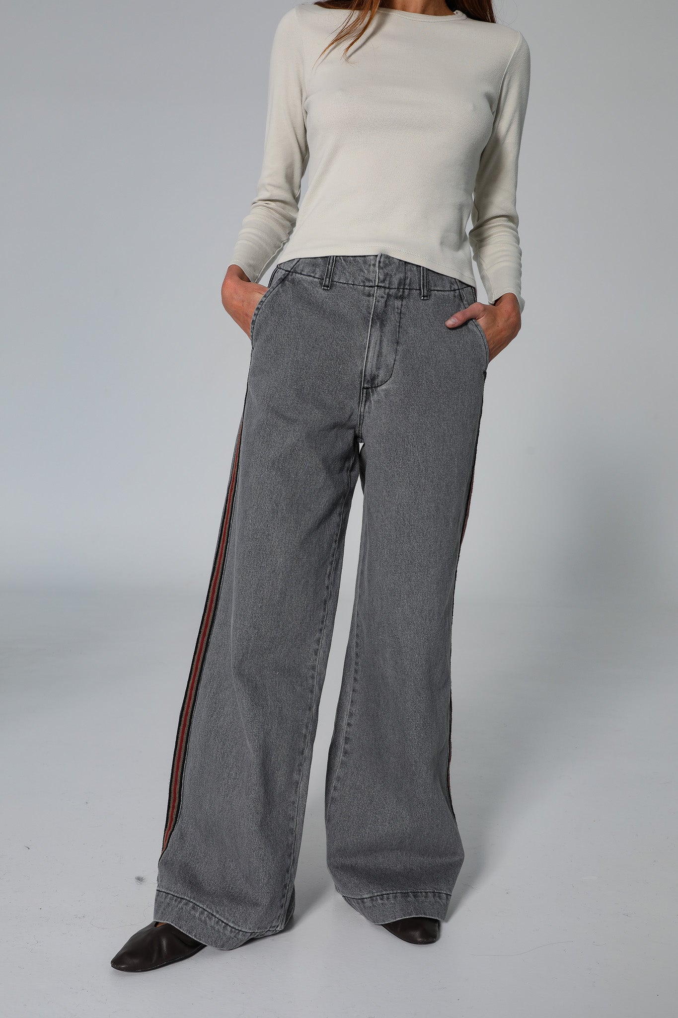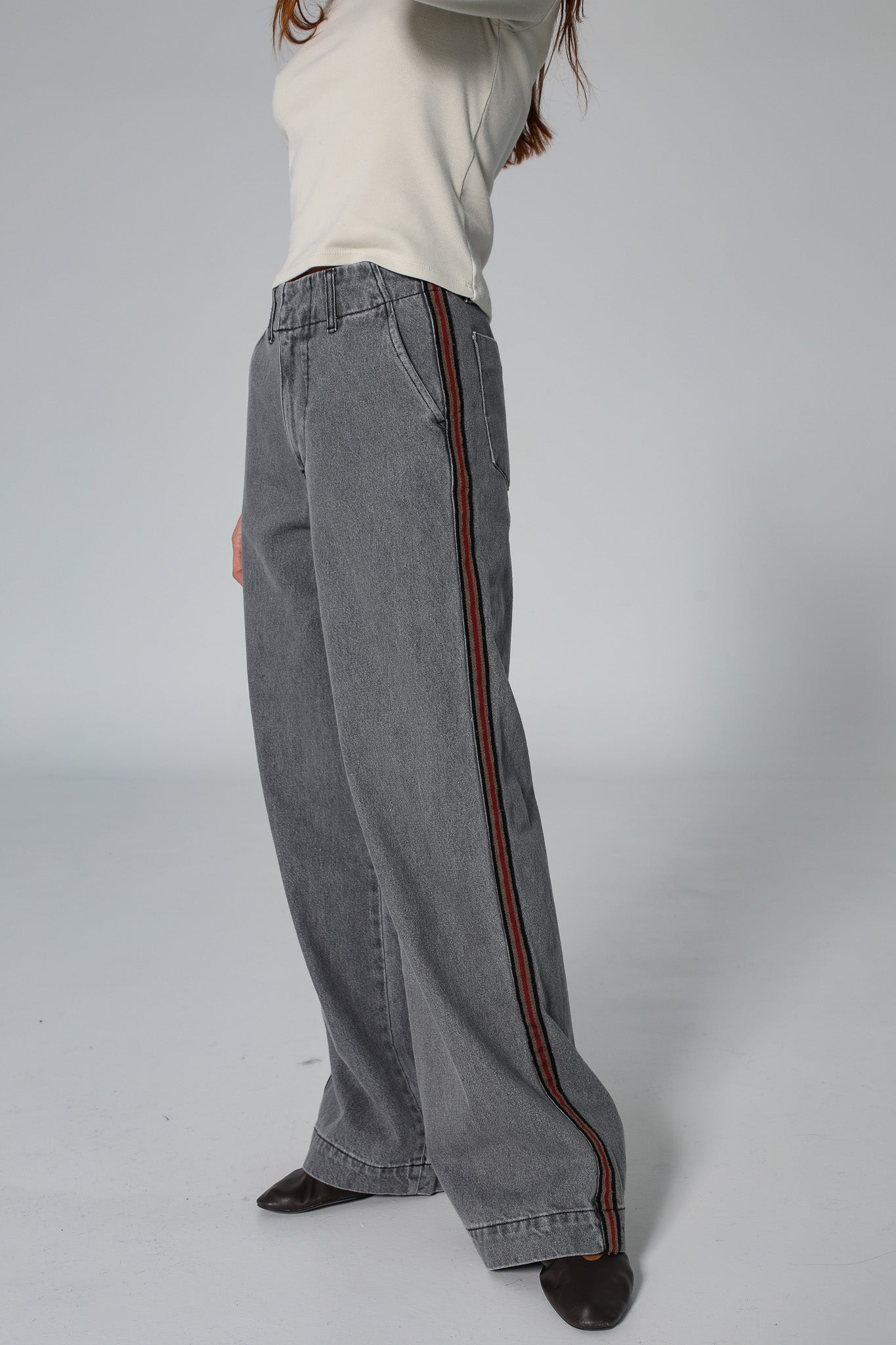 Wide-fit denim pants in grey with a stripe detail on the sides.