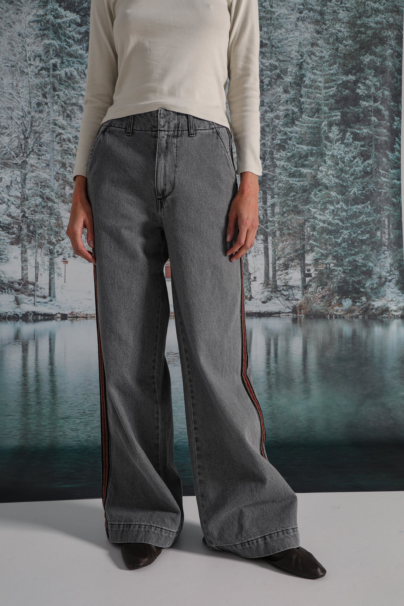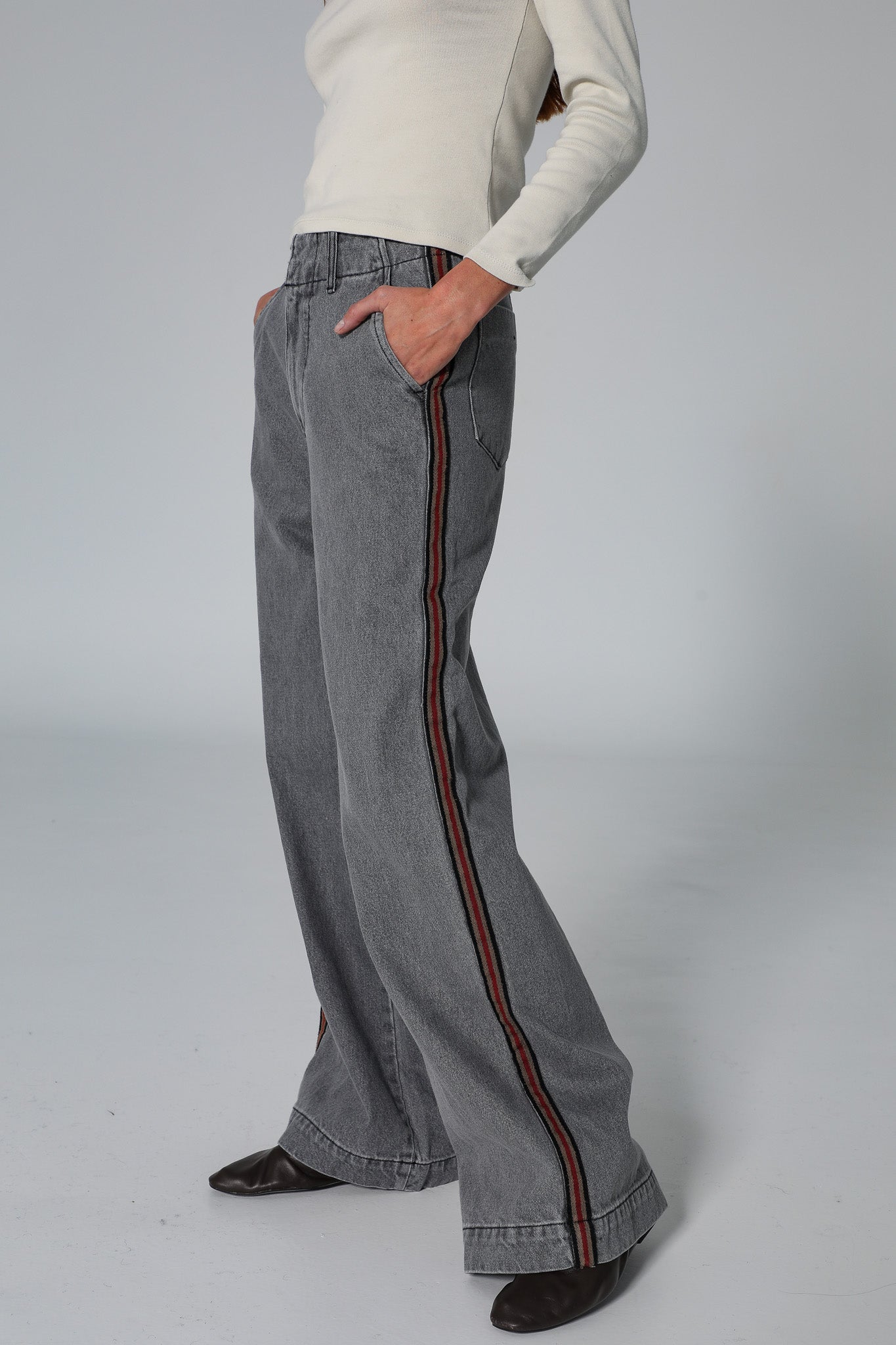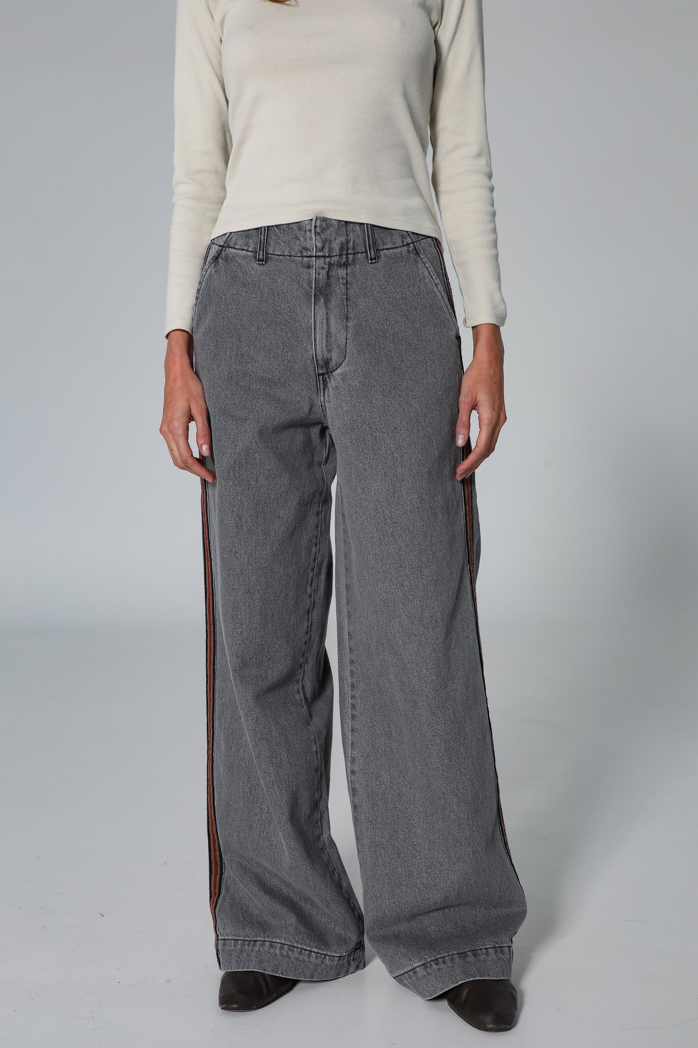 Wide-fit denim pants in grey with a stripe detail on the sides.