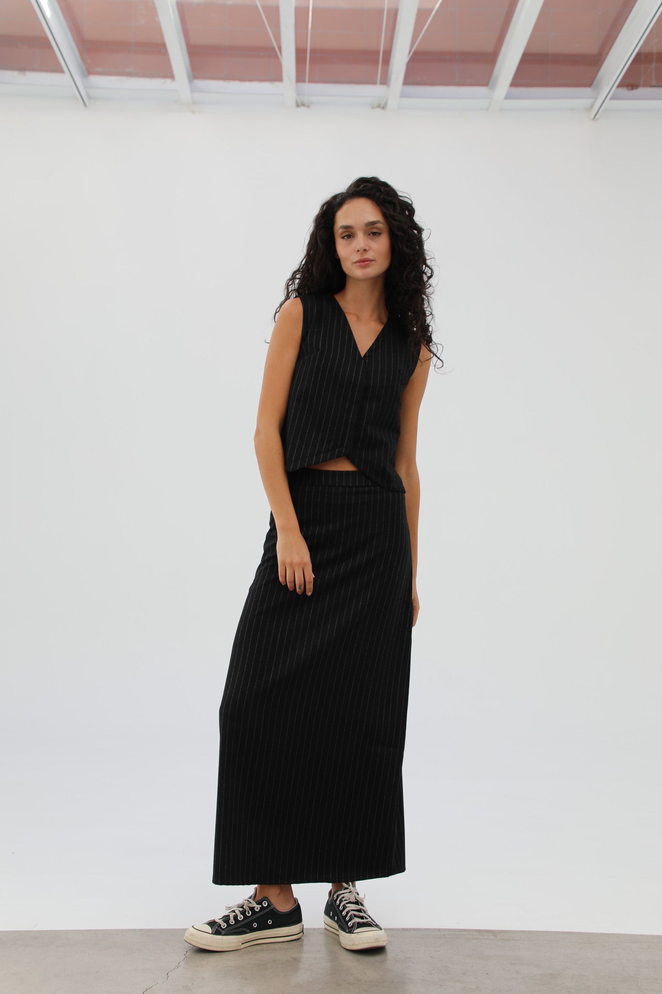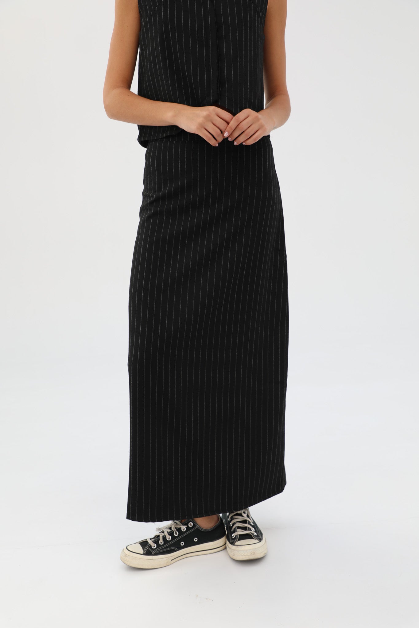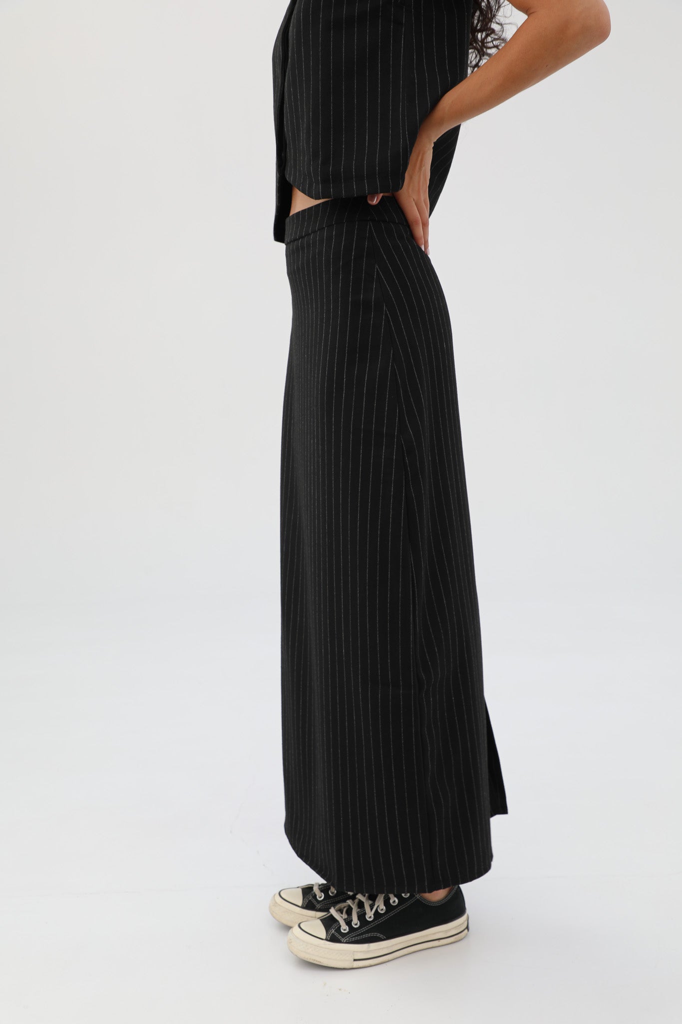 Diplomatic stripes skirt in black with grey stripes. Pair with our Diplomatic Stripes Vest Black & Grey to complete the look.