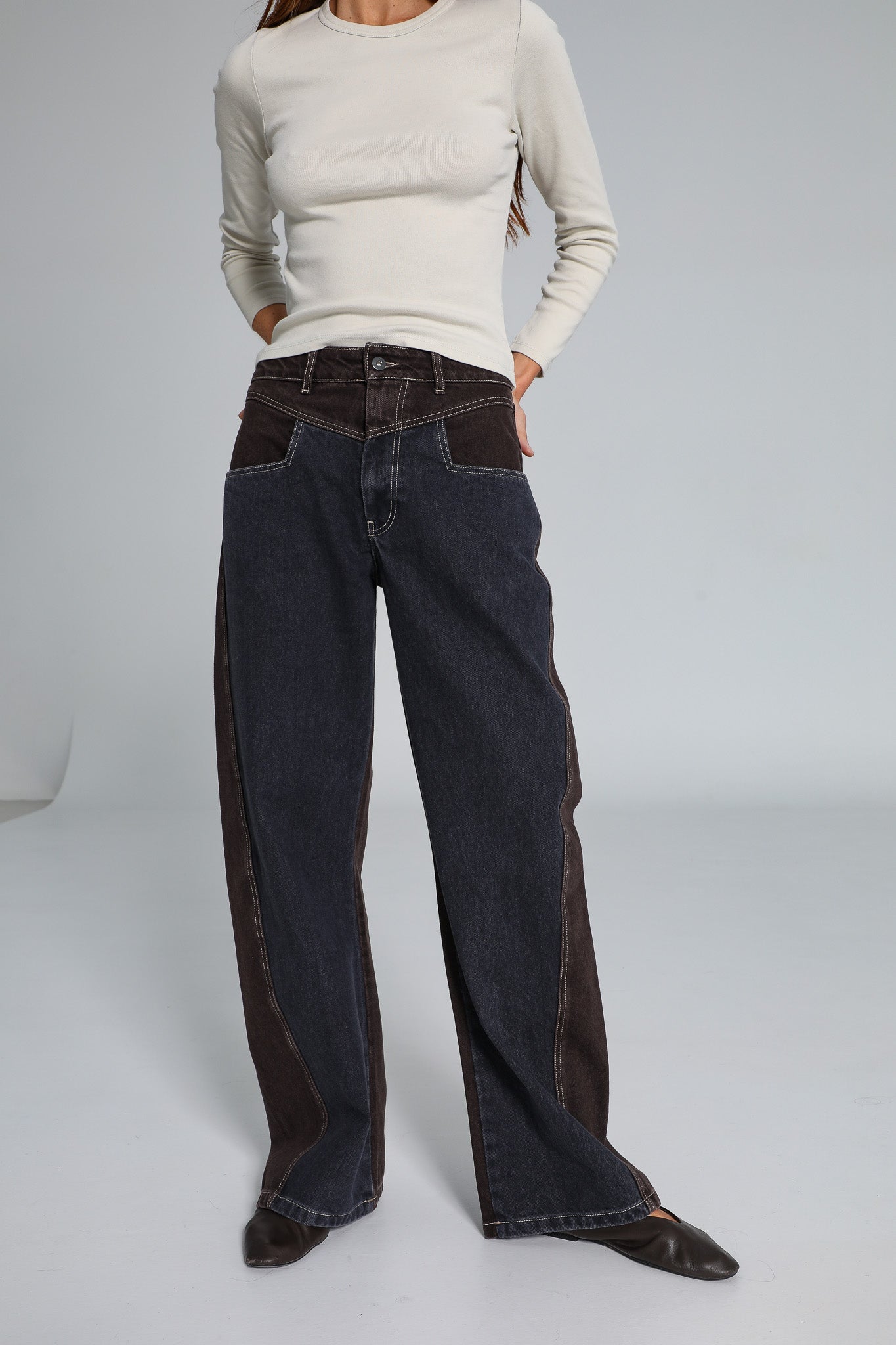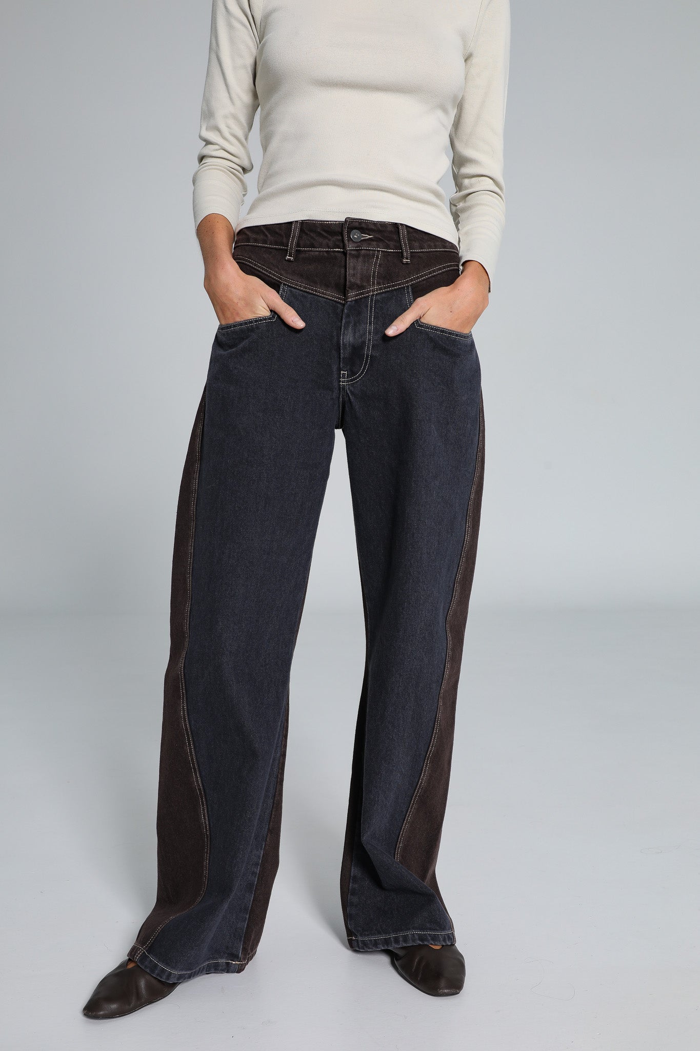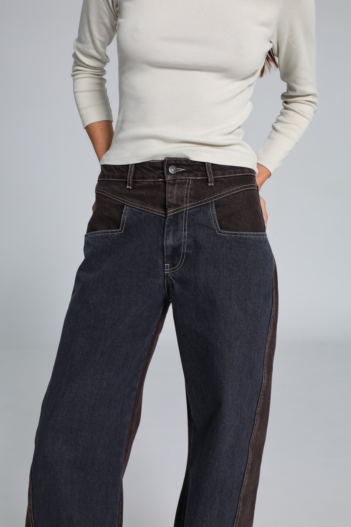 Wide-fit two-tone jeans, featuring denim blue at the back and brown at the front, finished with contrast pockets.