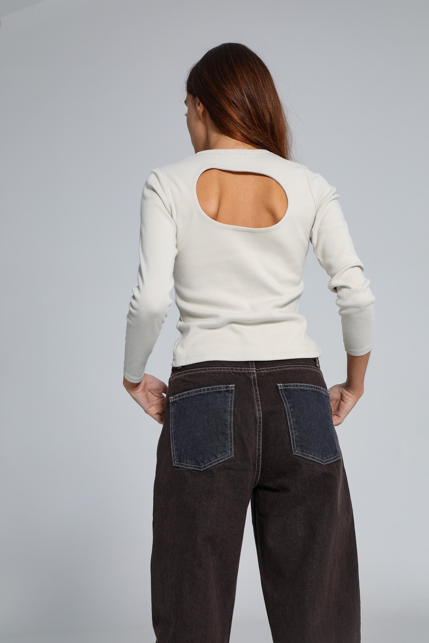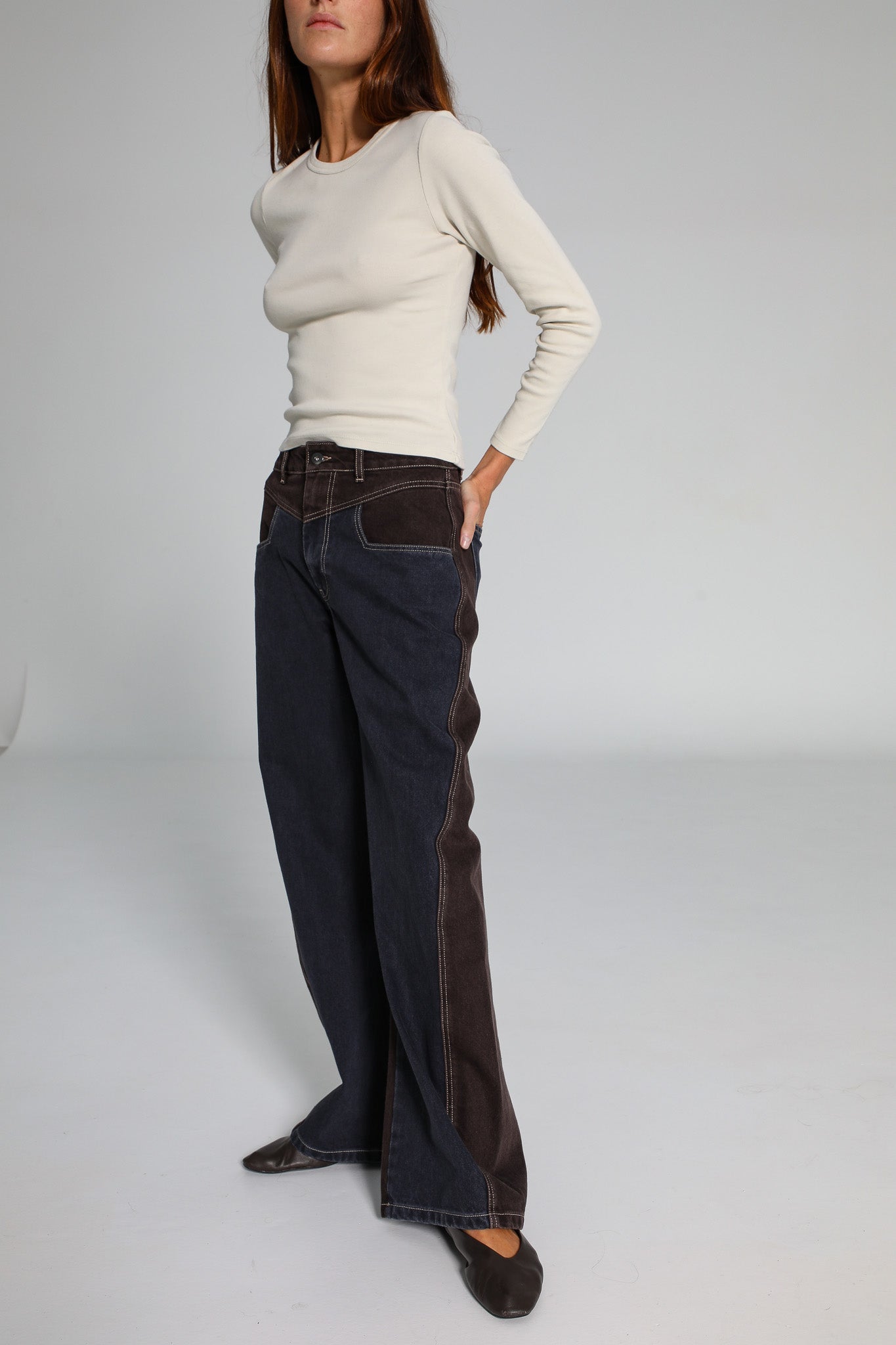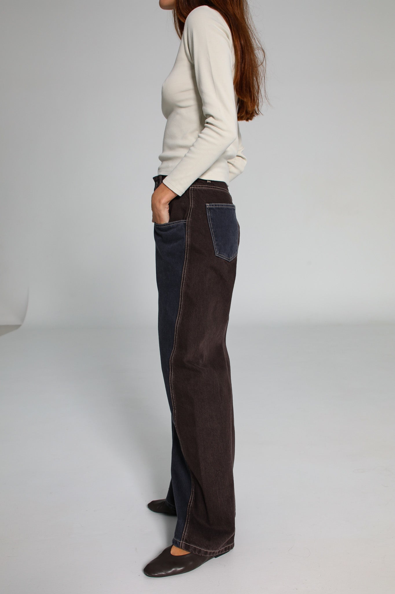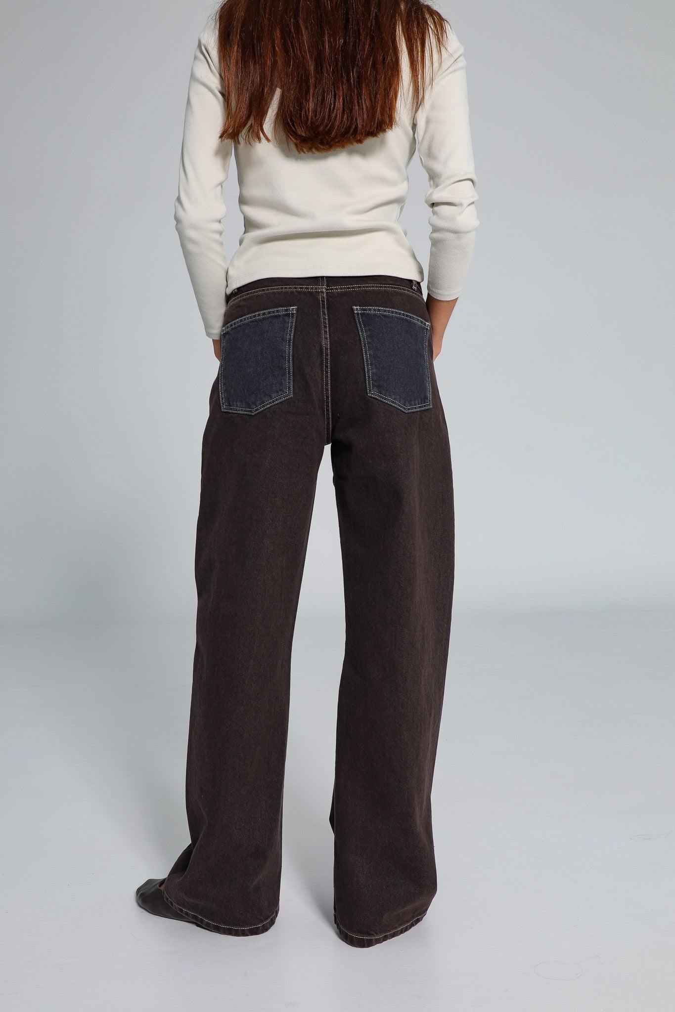 Wide-fit two-tone jeans, featuring denim blue at the back and brown at the front, finished with contrast pockets.
