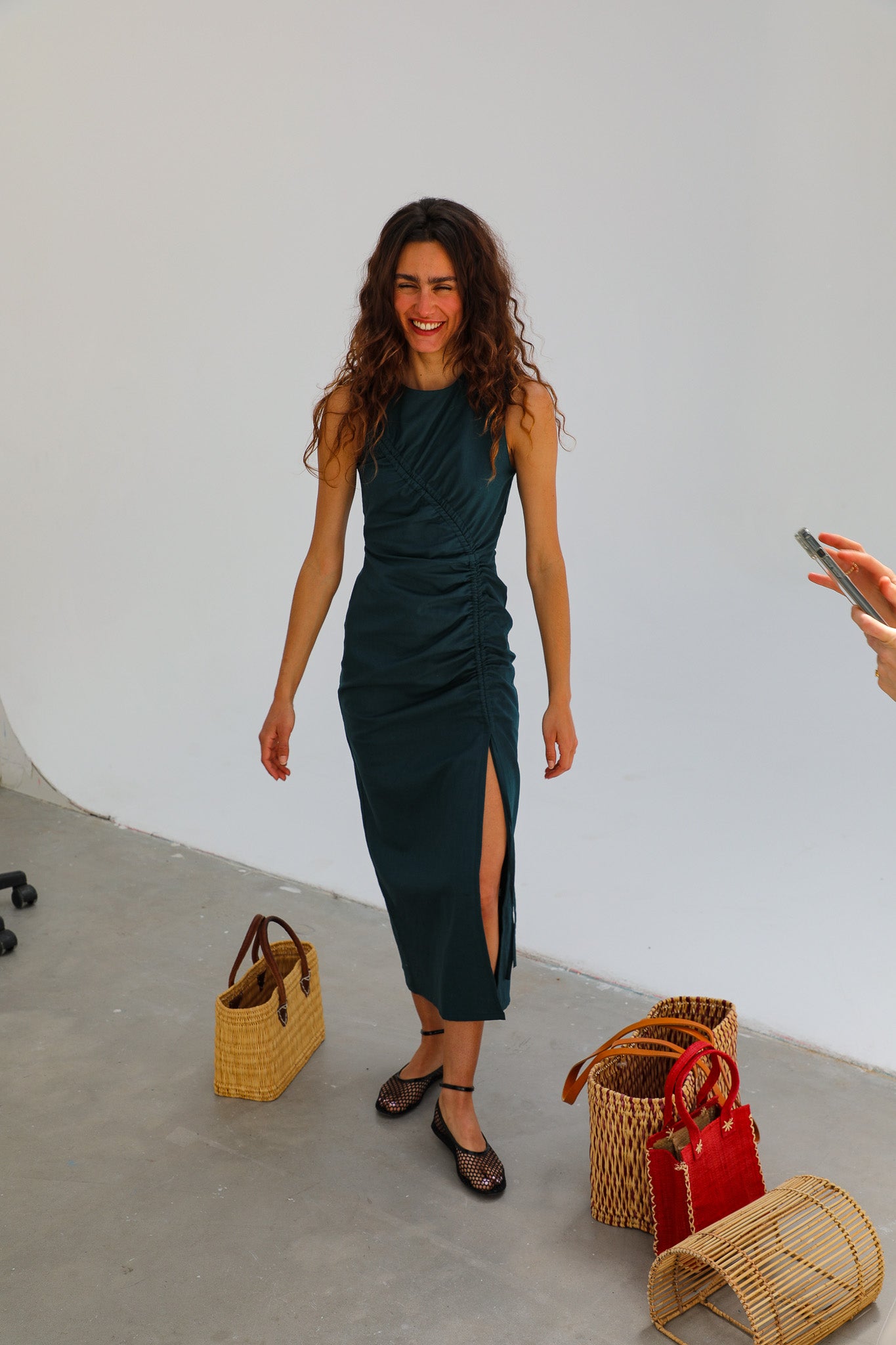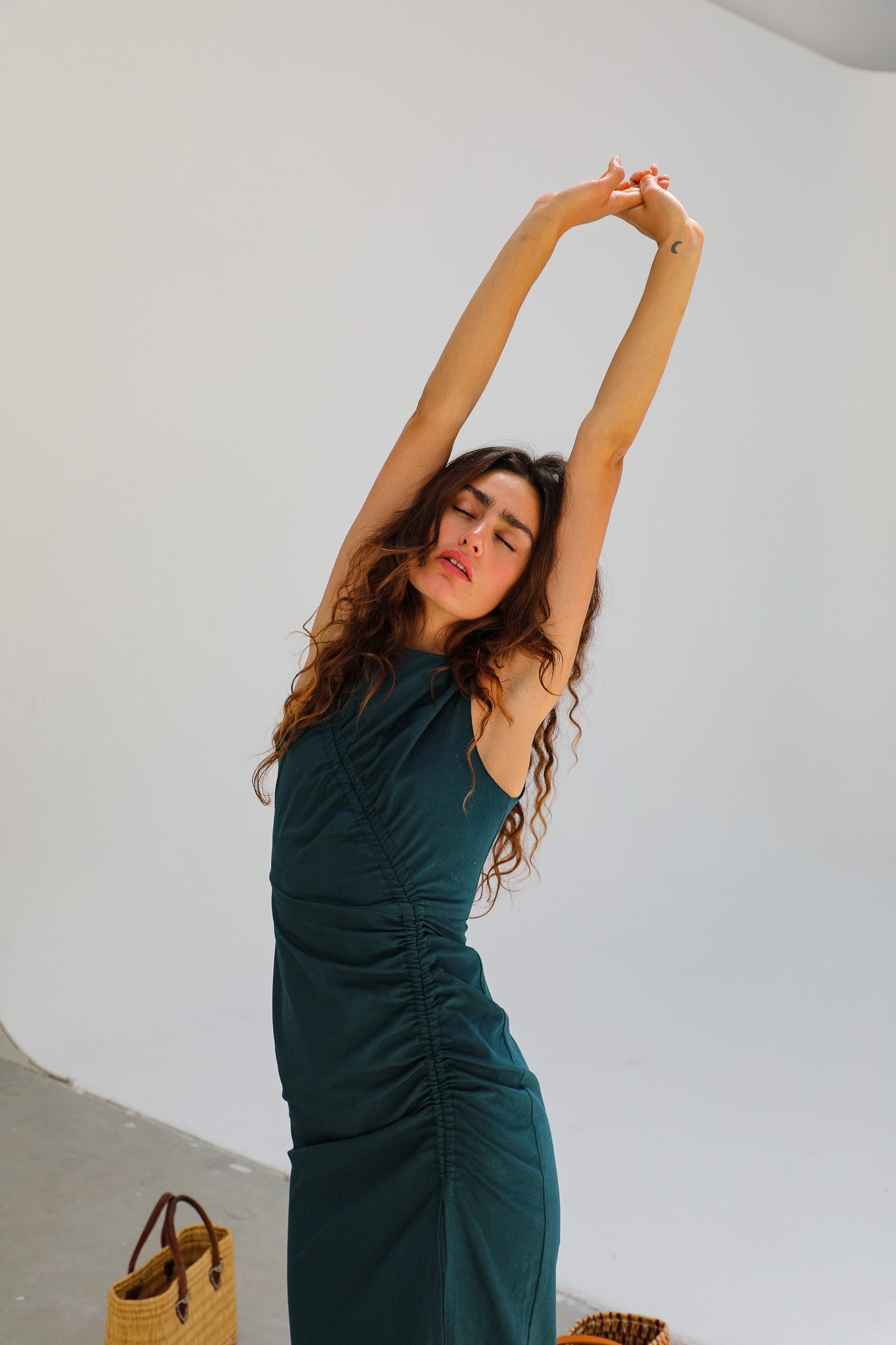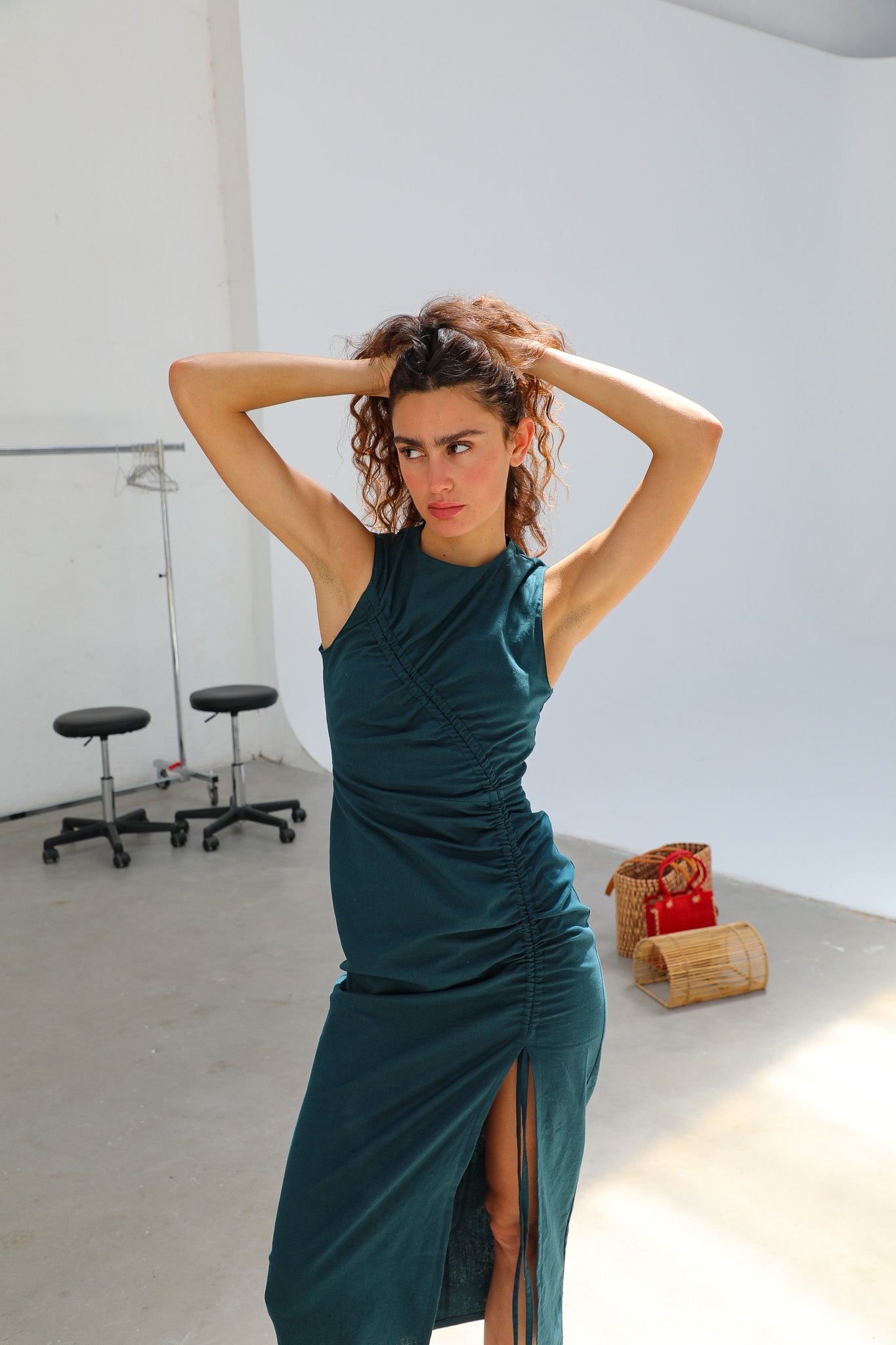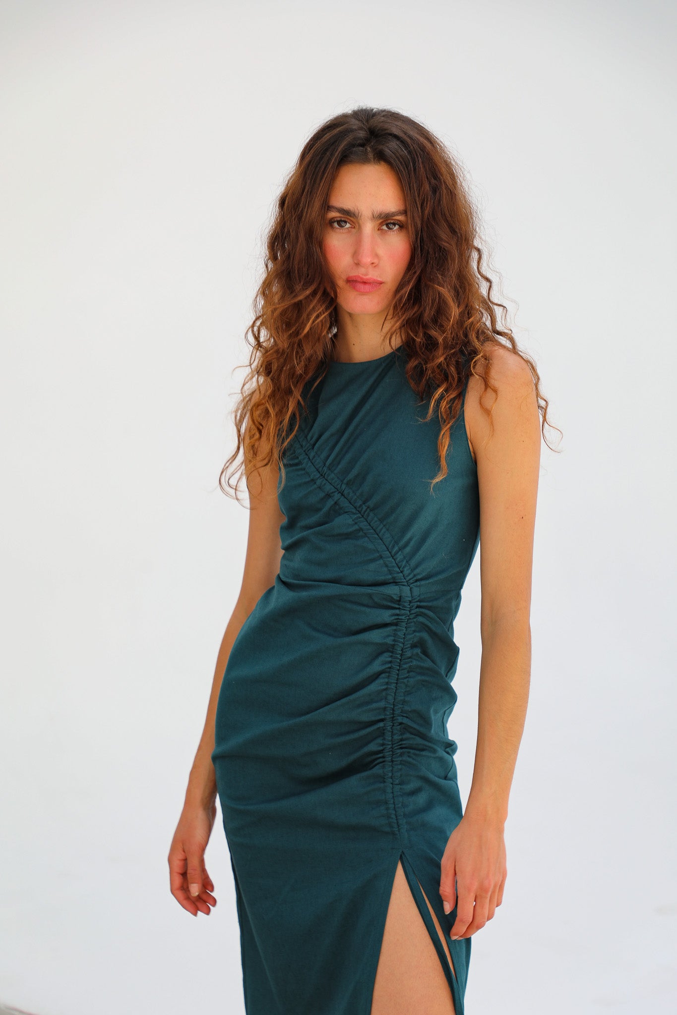Long linen dress in green, featuring a gathered adjustable drawstring detail running from the shoulder down to the leg slit opening.