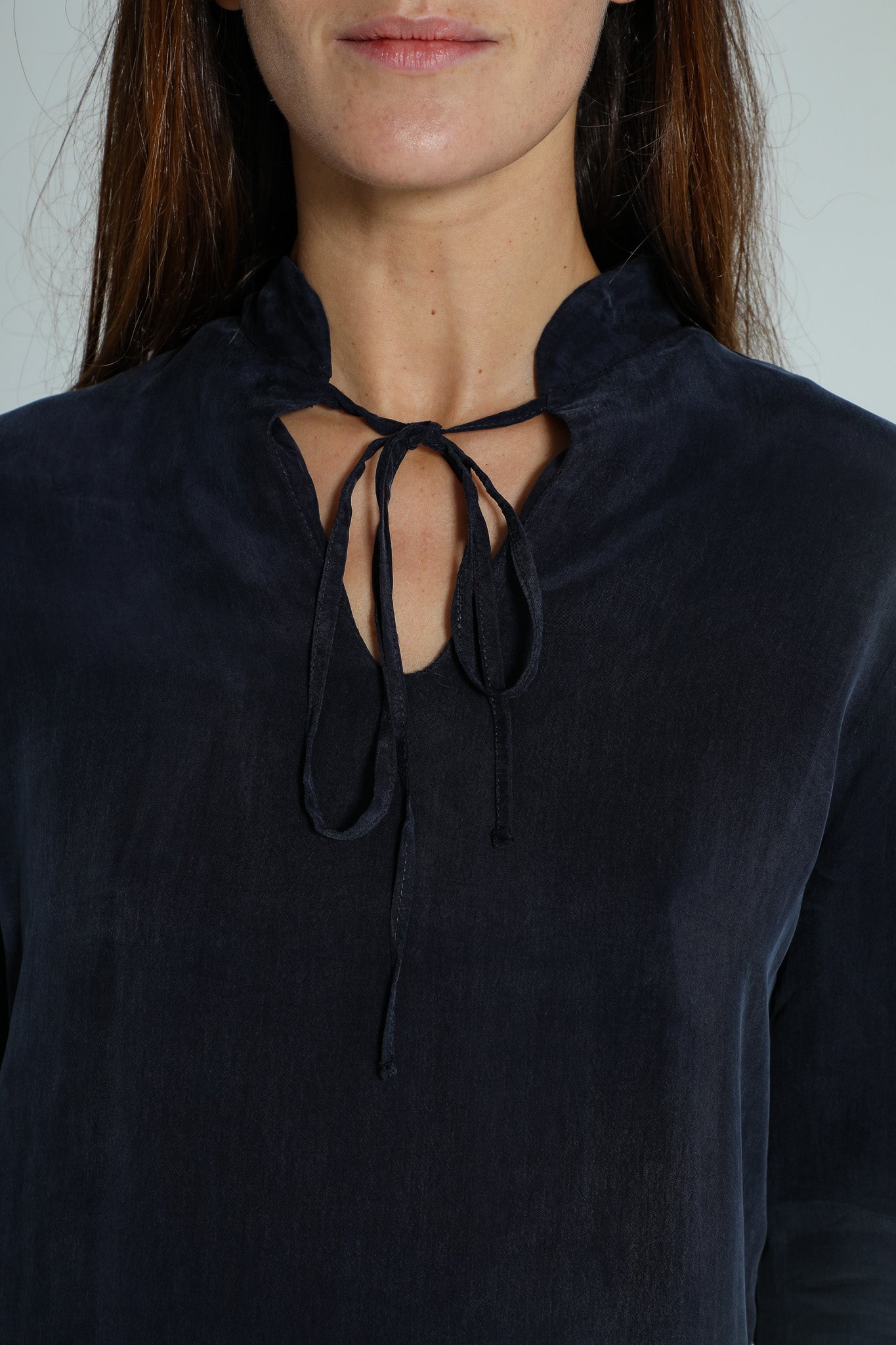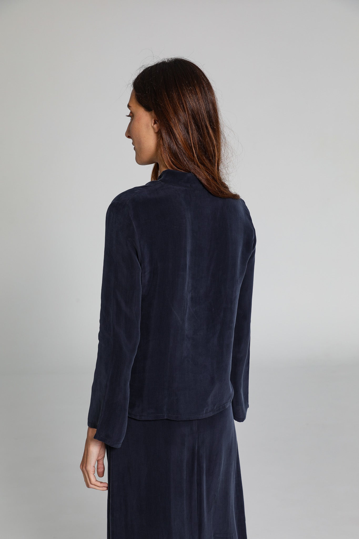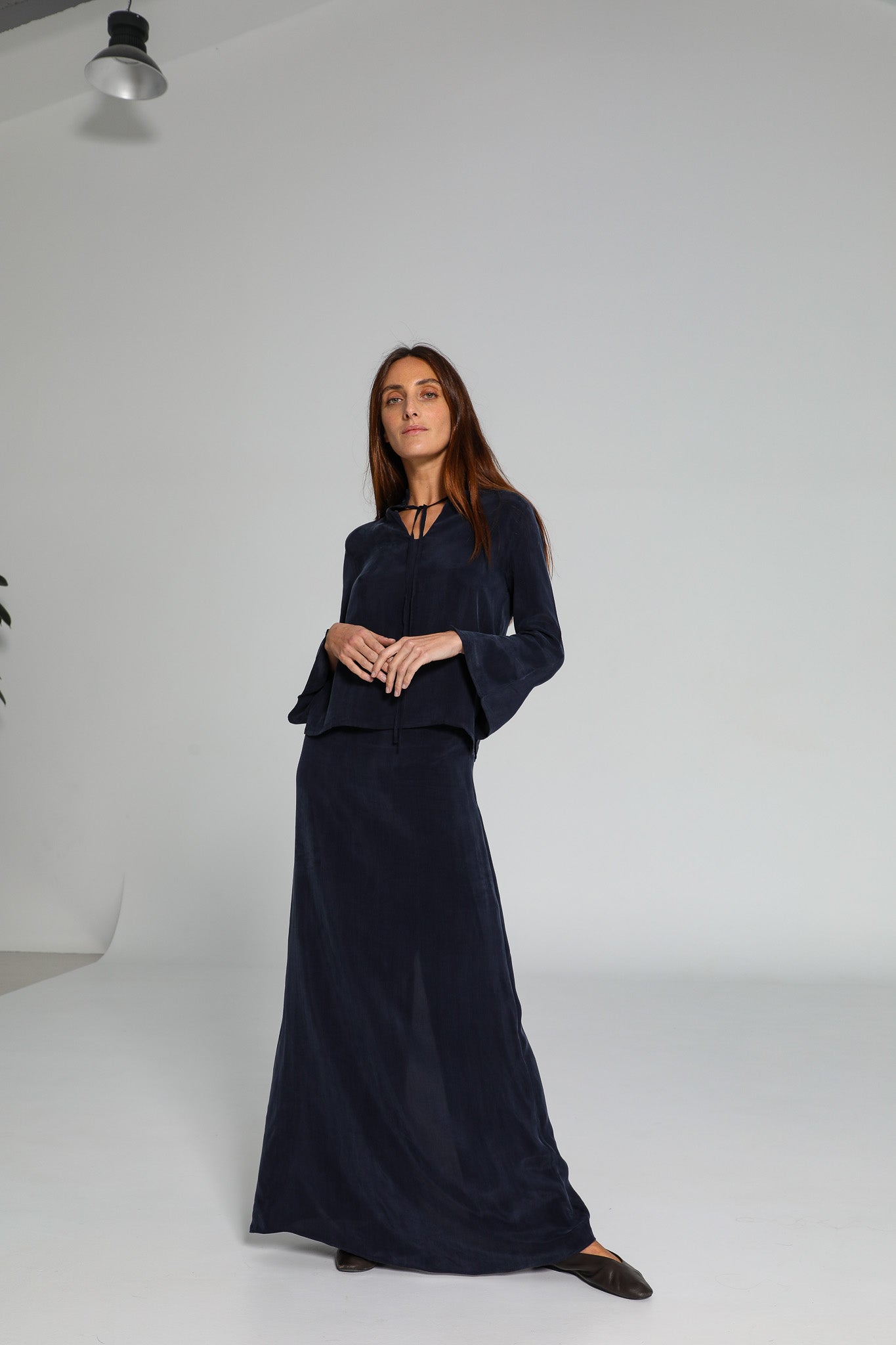 Long-sleeve cupro blouse in burgundy, featuring a V-neckline and a front slit that opens down to the belly button for a bold, elegant touch. Complete the look with the Flow Cupro Pants Burgundy.