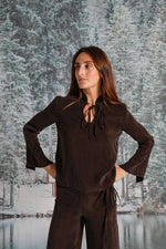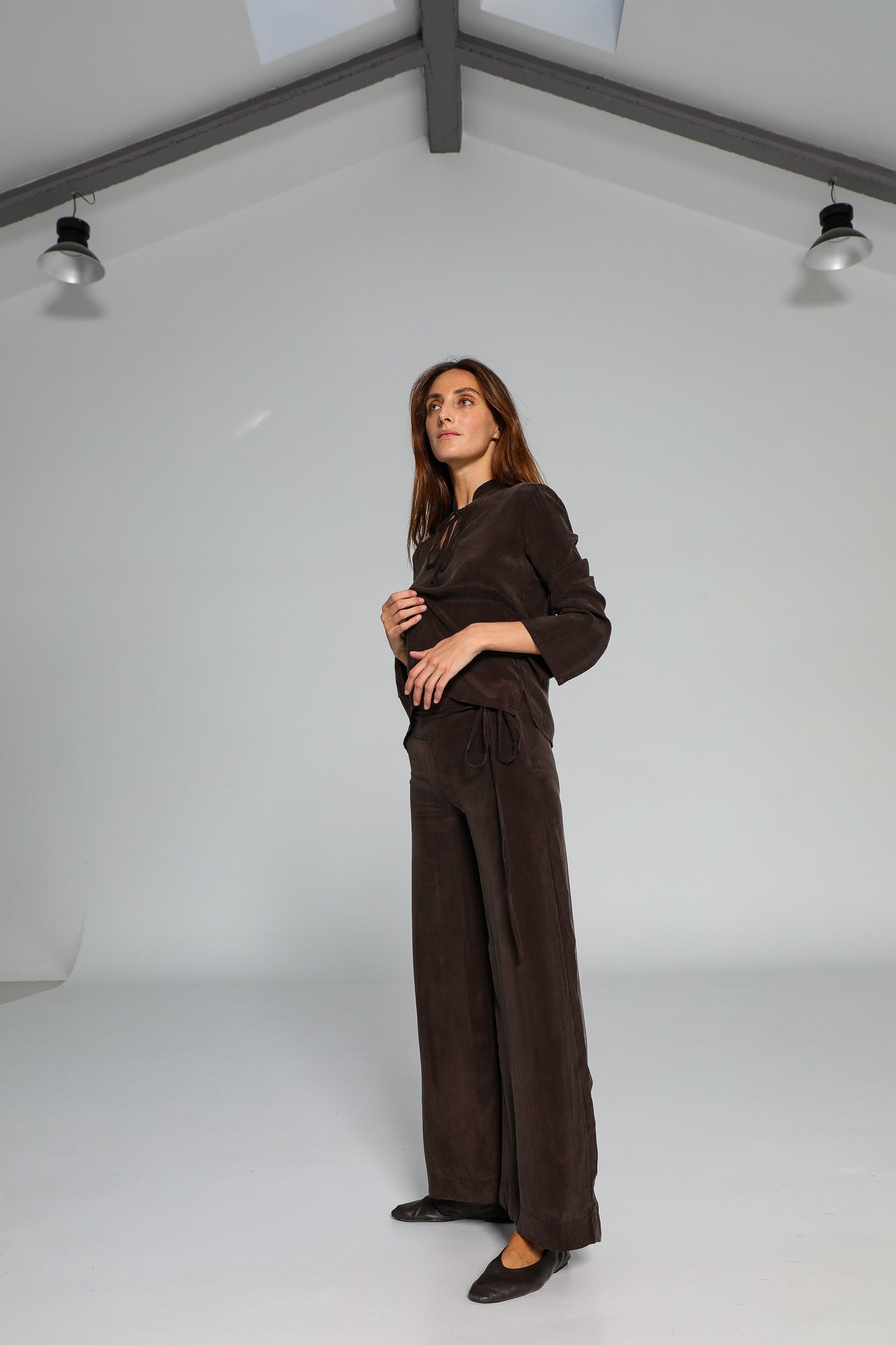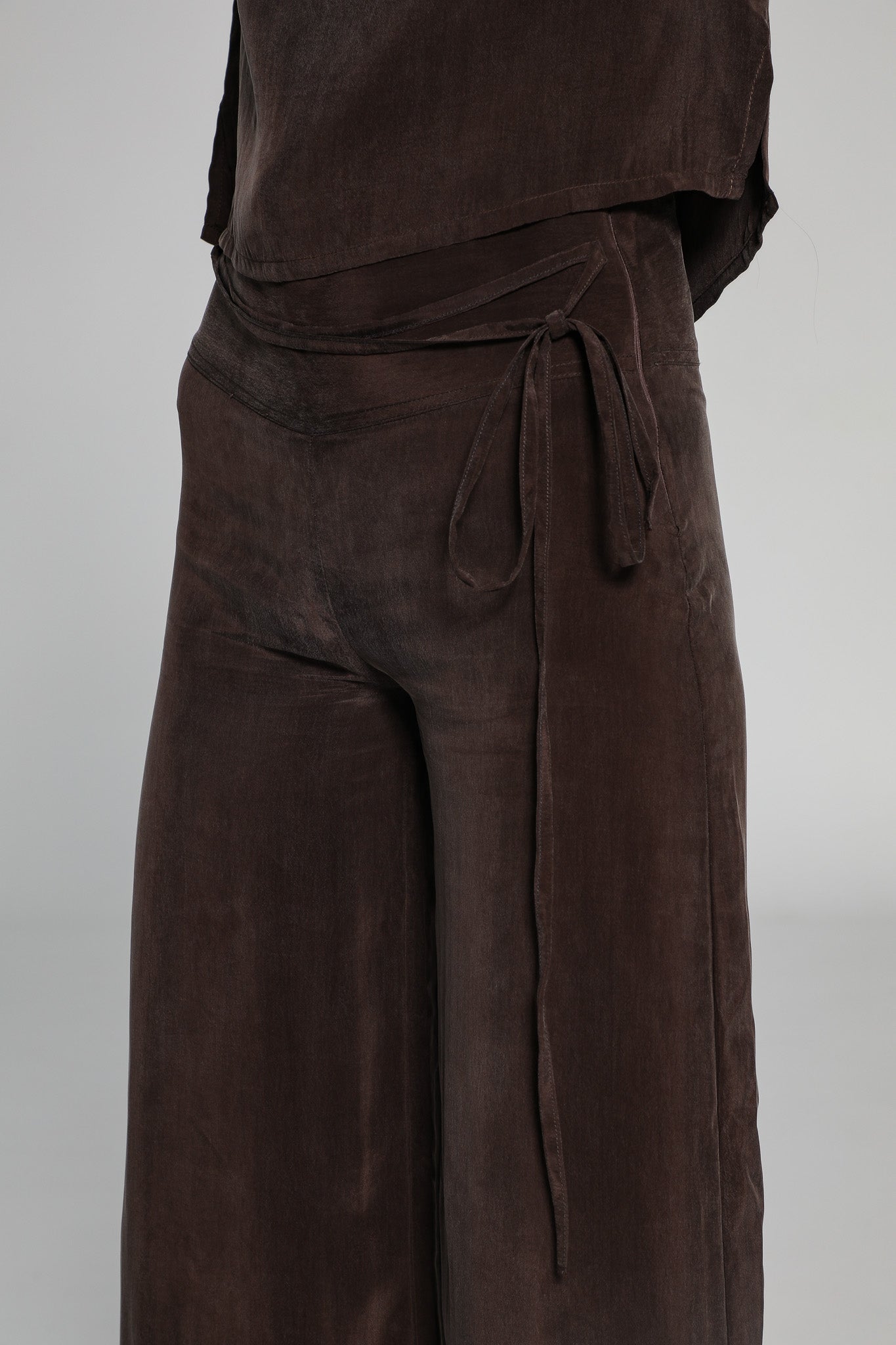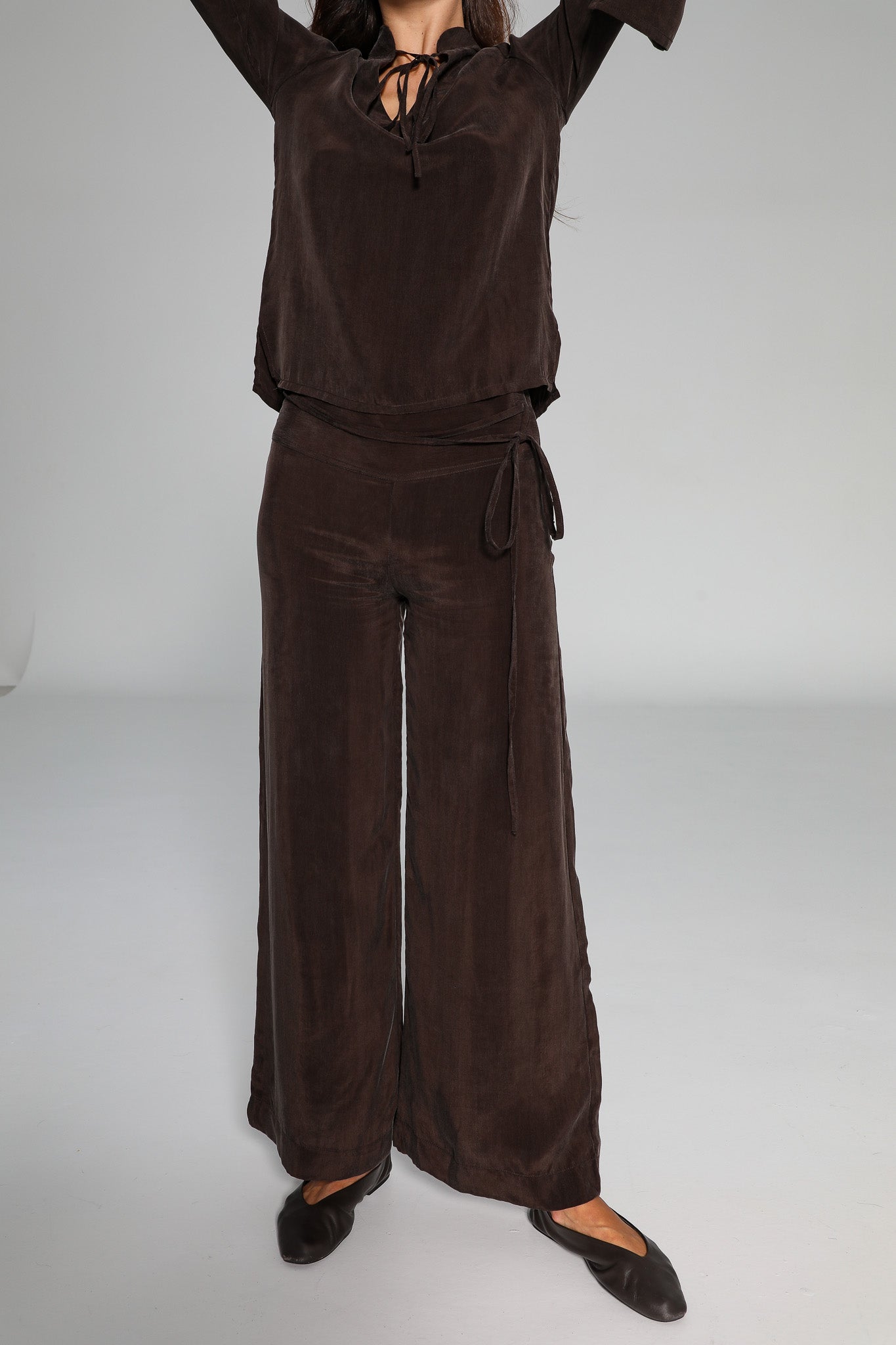 High-waisted wide-leg pants in brown cupro-silk, featuring a fluid drape, a discreet side zip closure, and a tie detail around the waist. Pair them with the Laces Cupro Blouse in Brown for a refined, coordinated look.