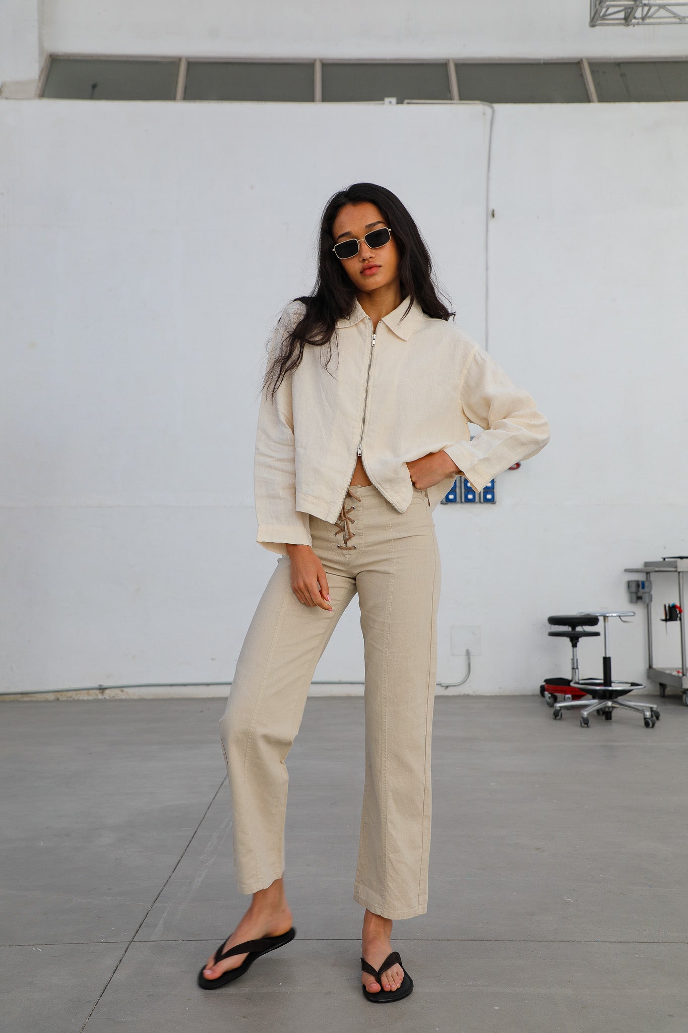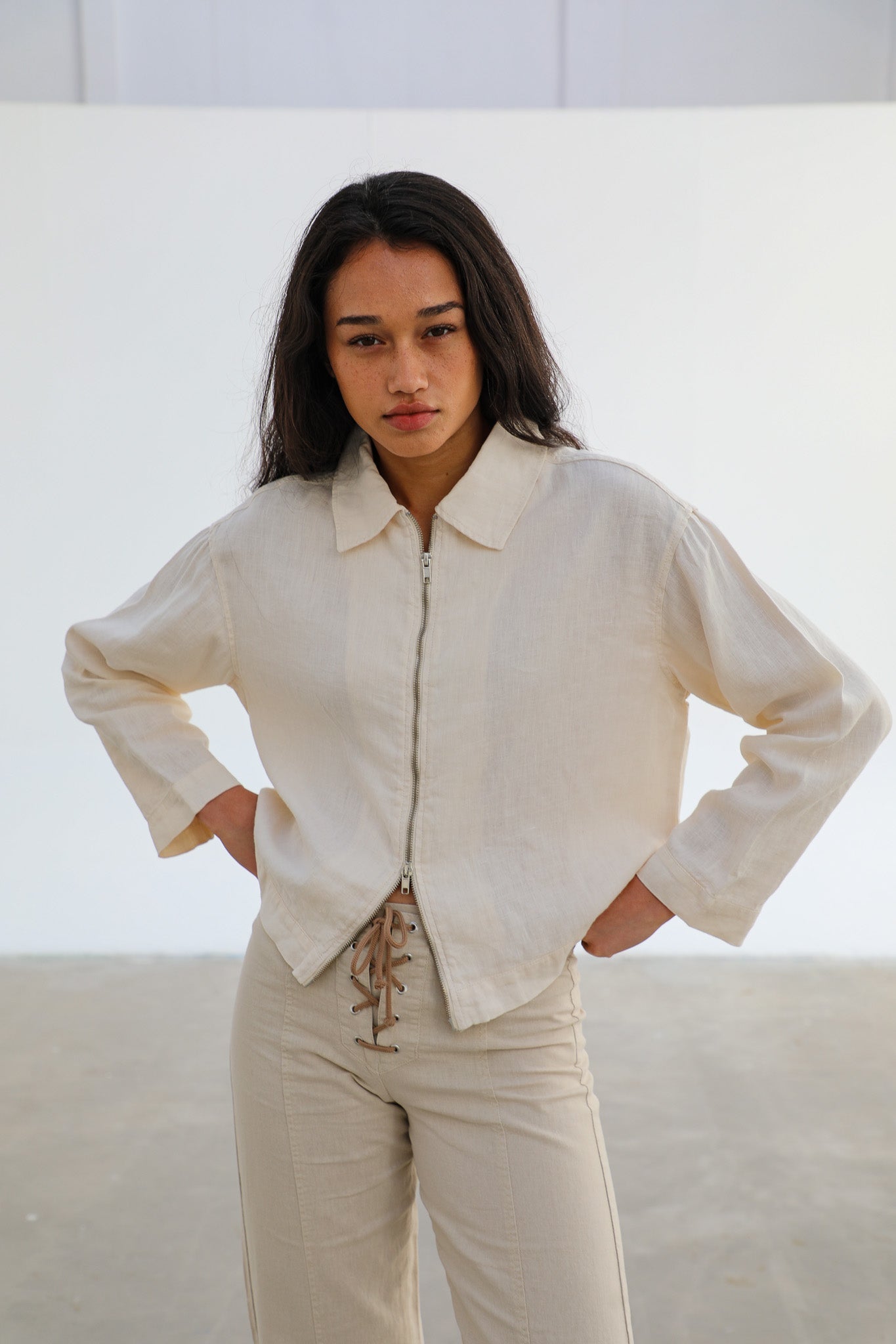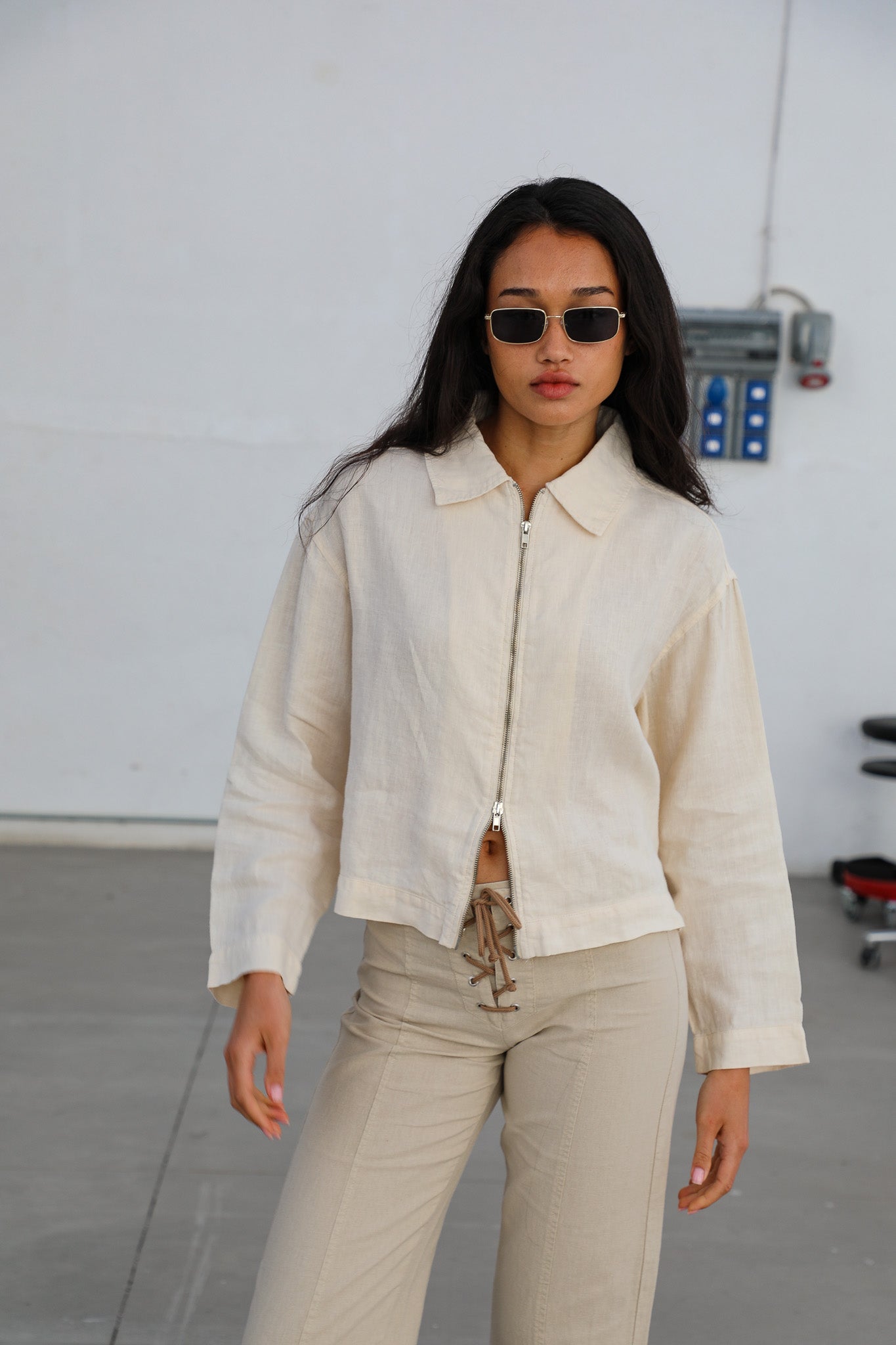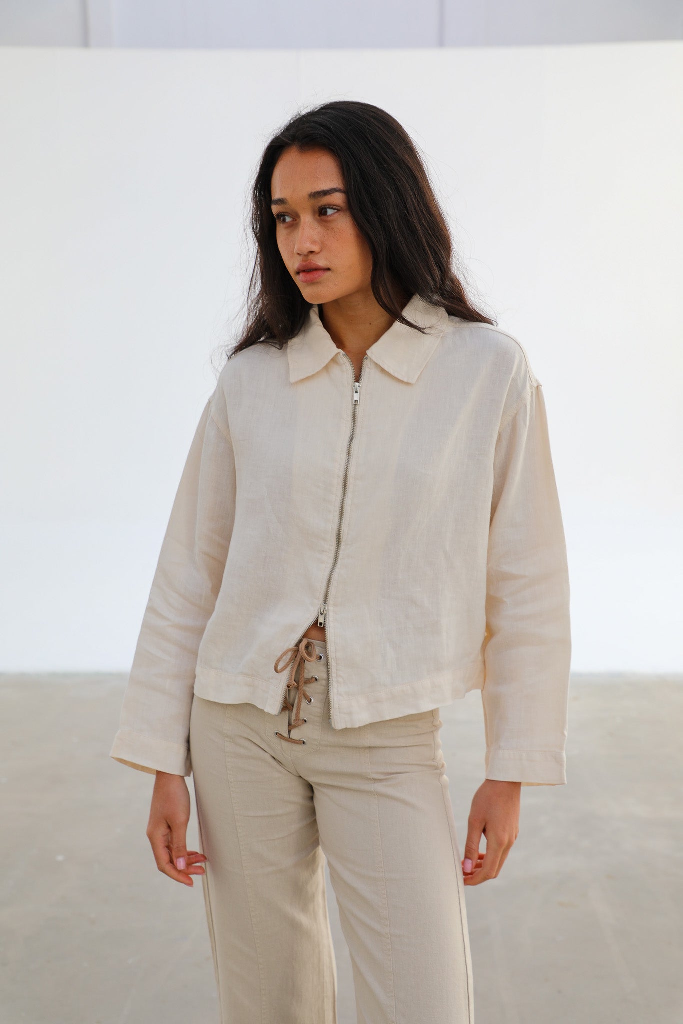 Linen zip-up jacket in a natural hue, featuring a double-ended zipper for versatile styling.