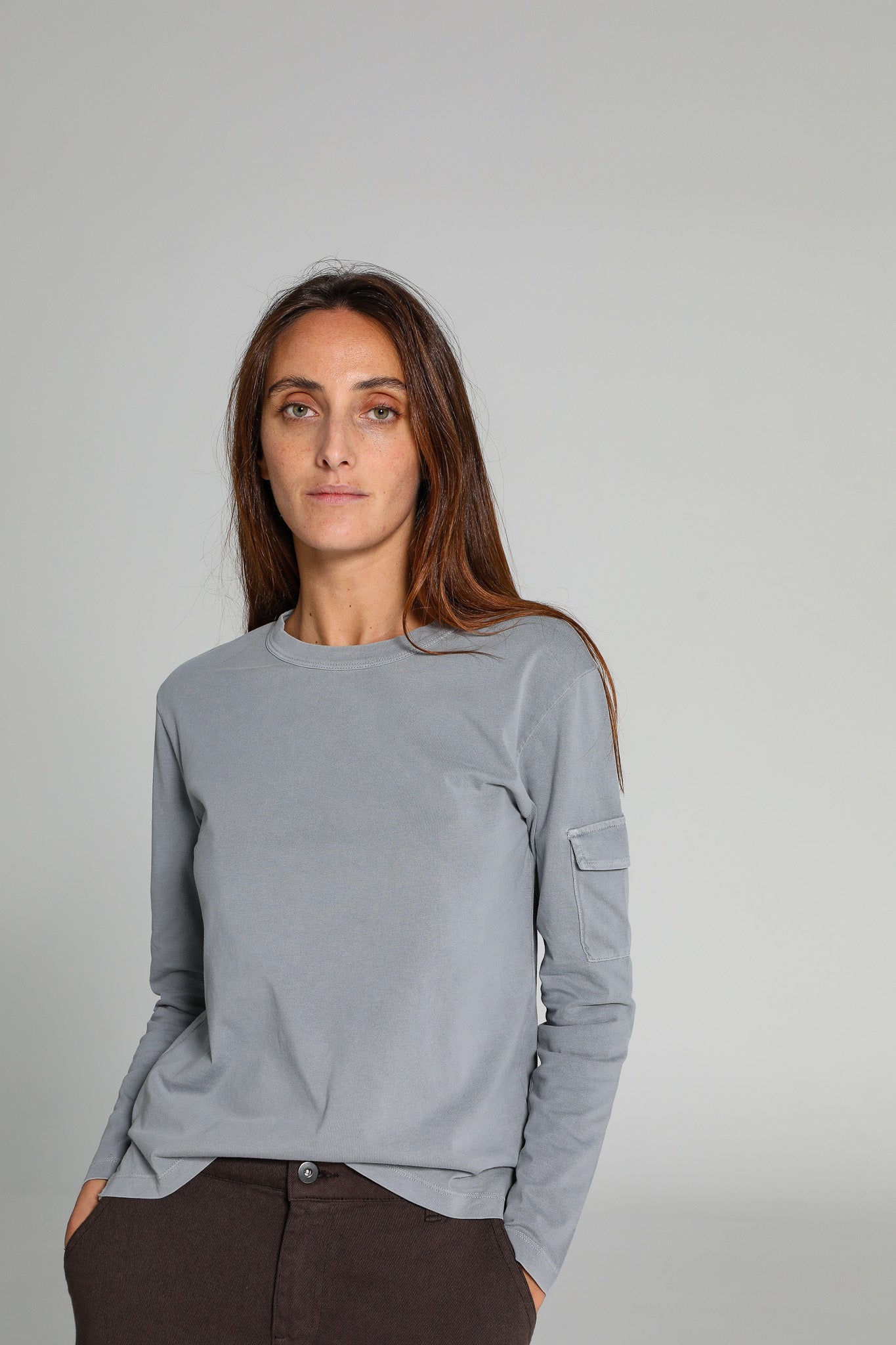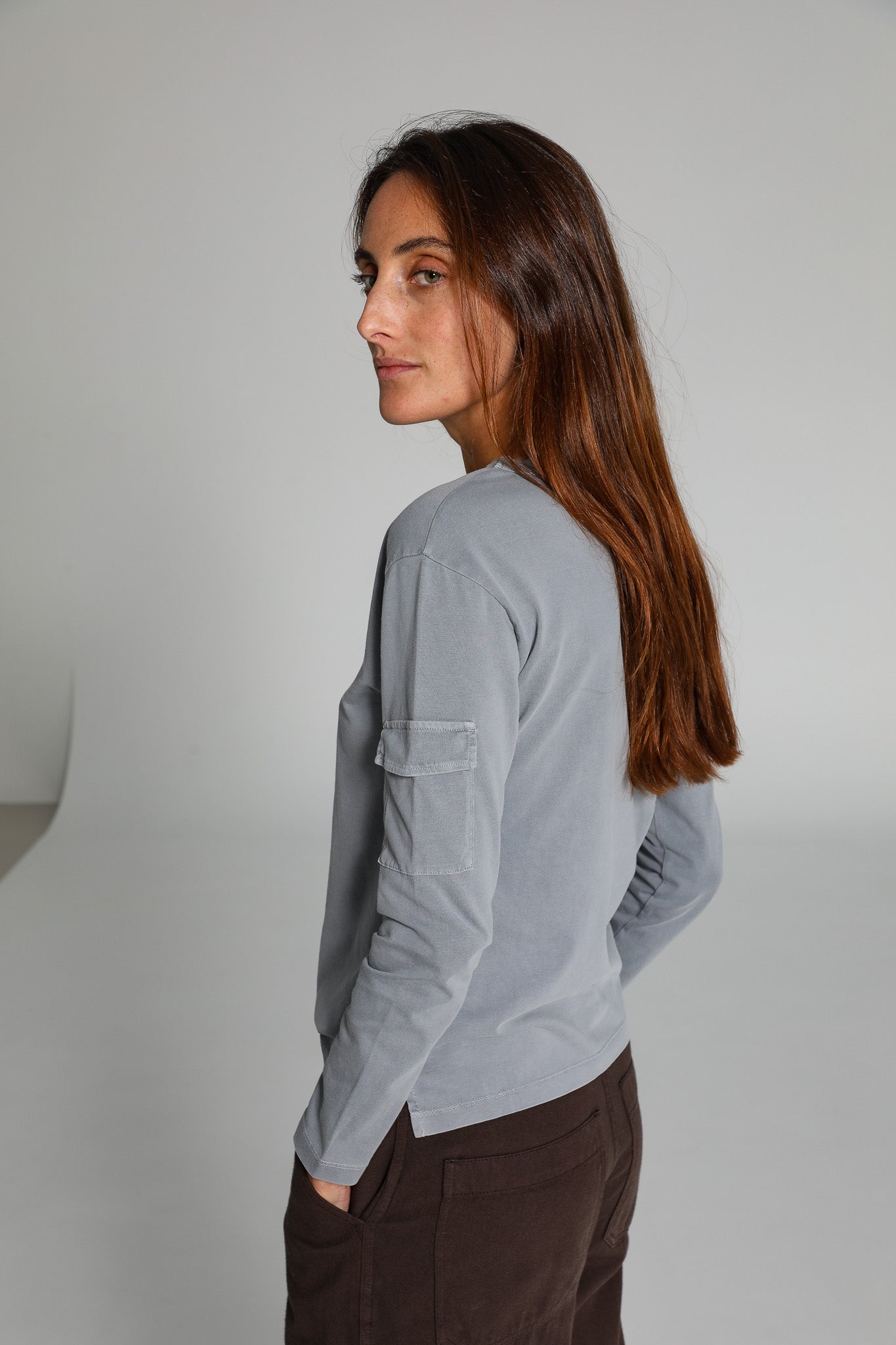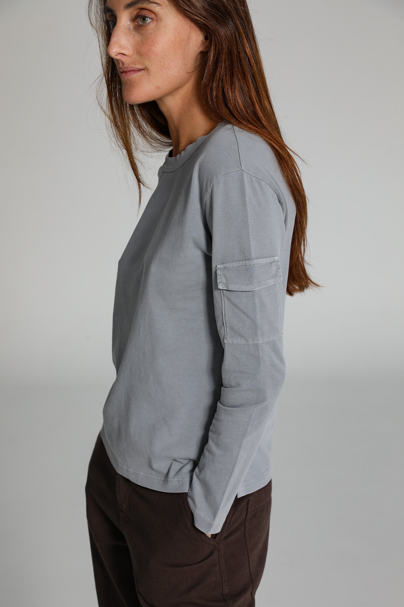 Light grey long-sleeve tee with a sleeve pocket and washed finish.