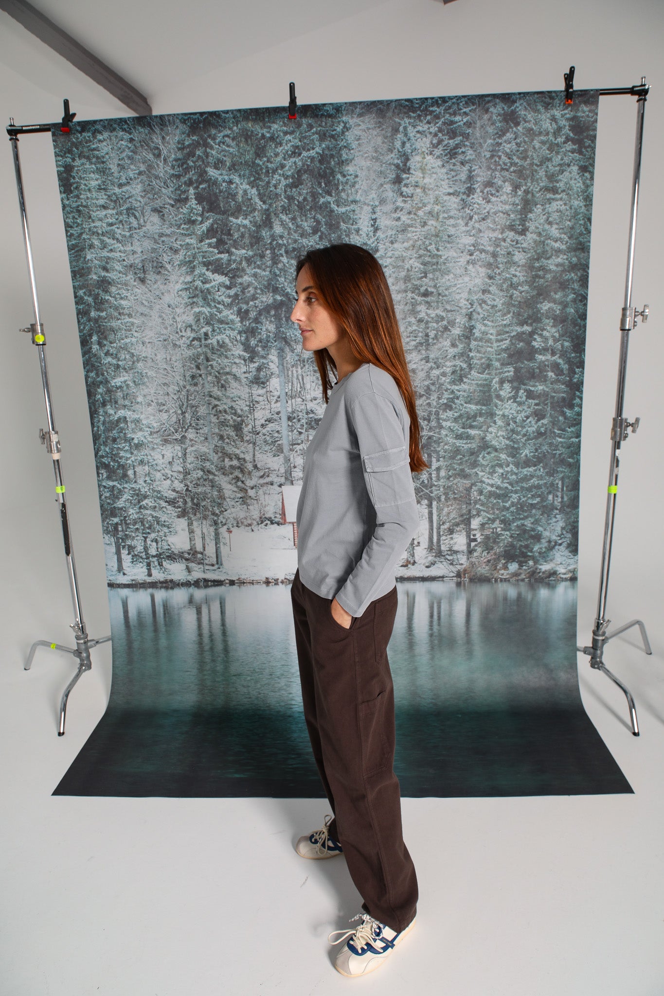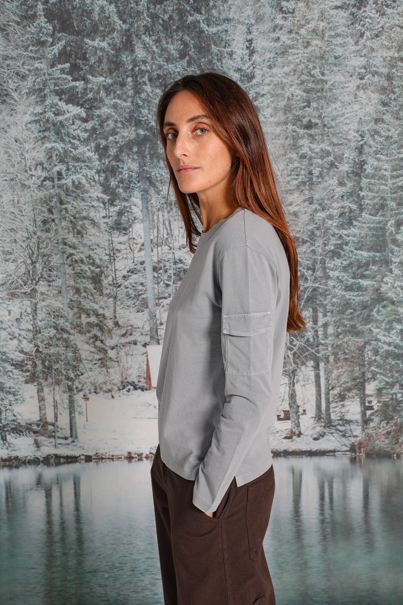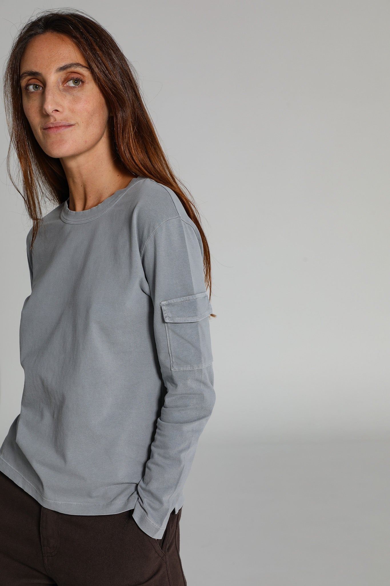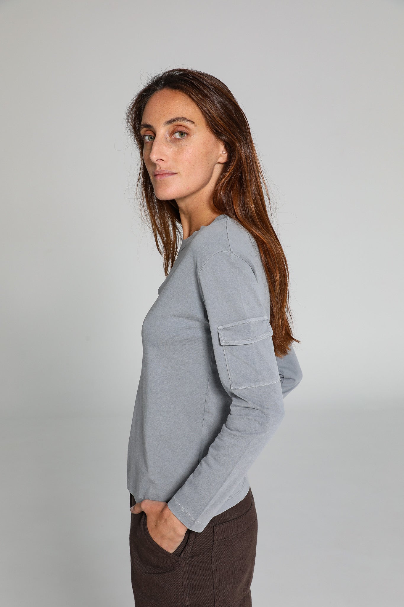 Light grey long-sleeve tee with a sleeve pocket and washed finish.