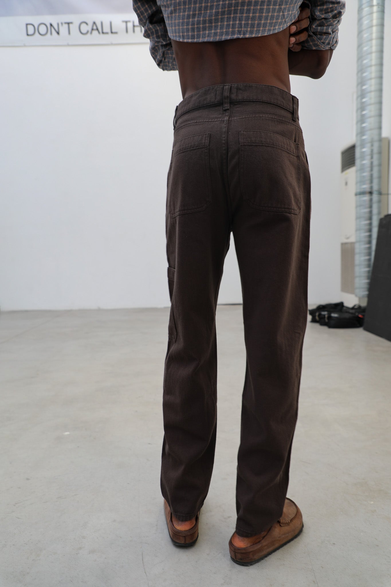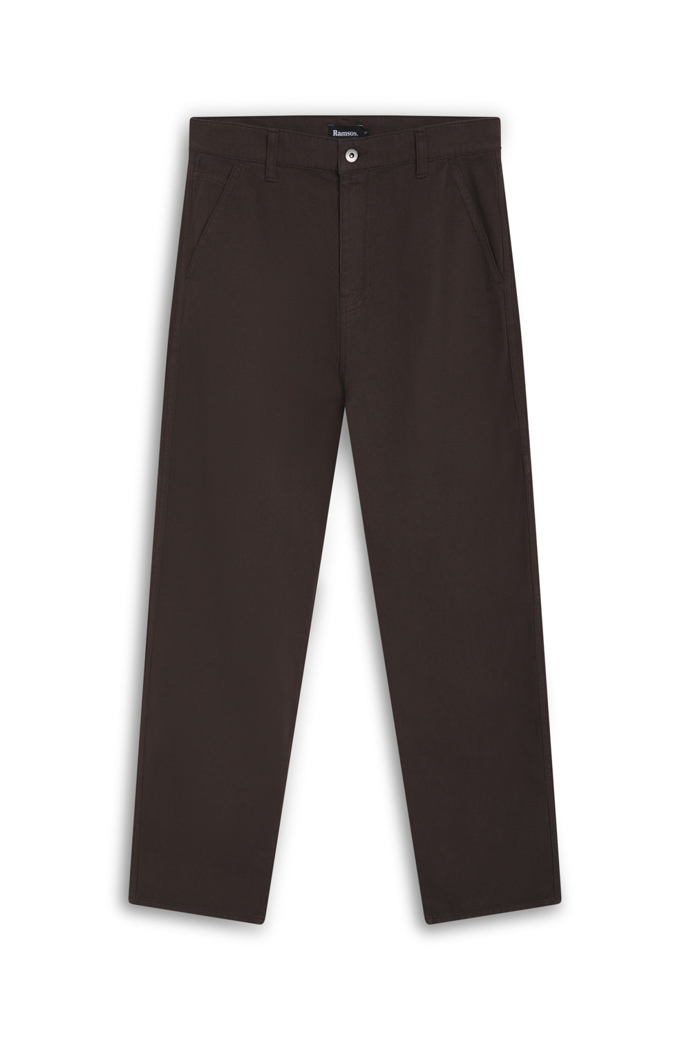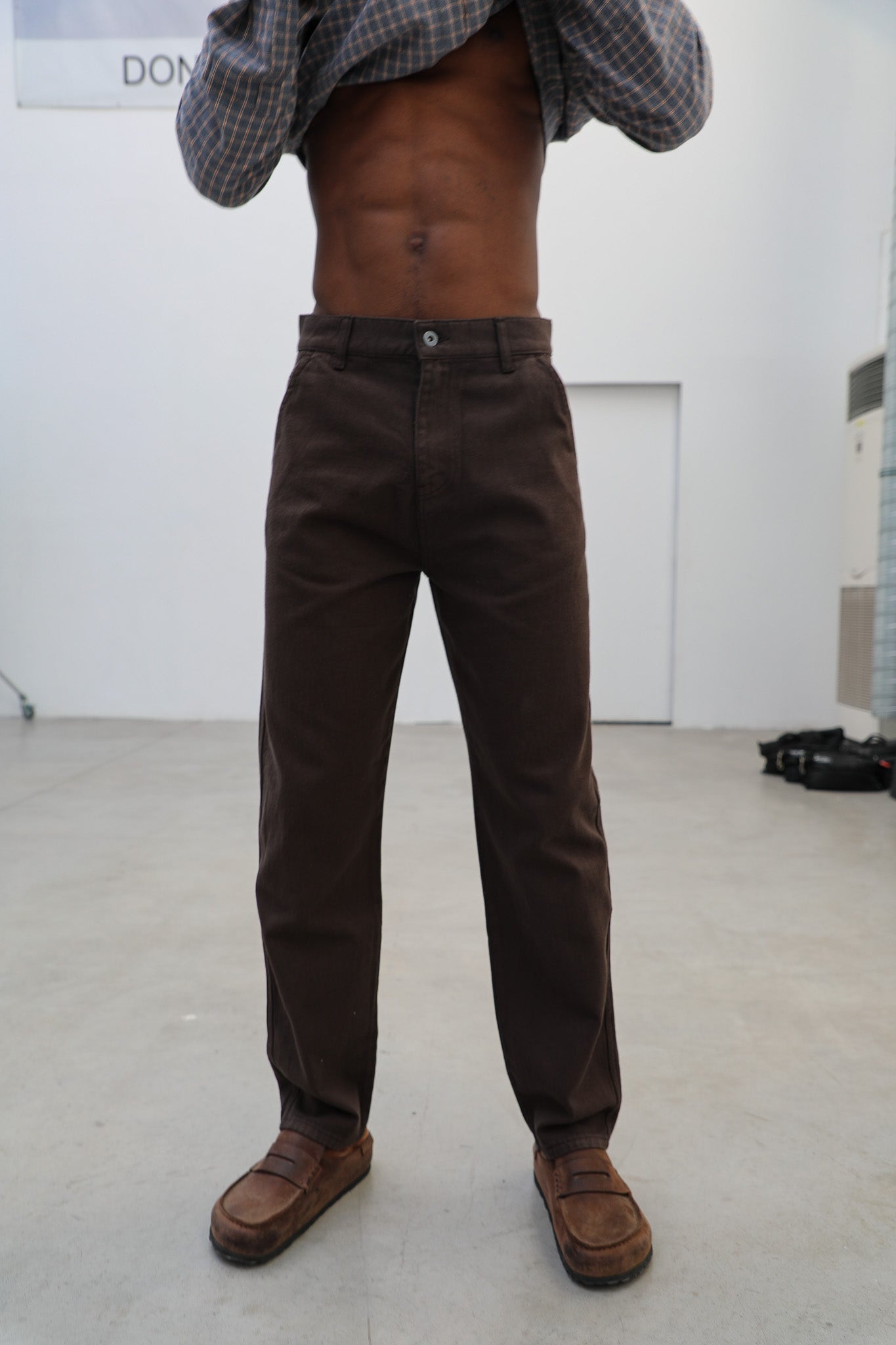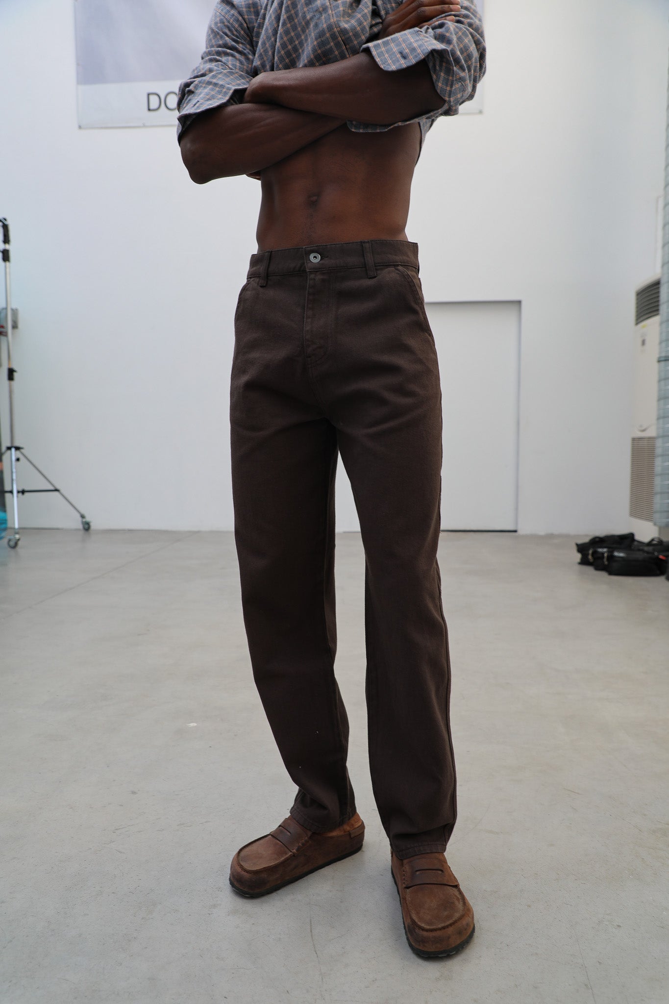 Brown straight-fit pants with button at the waist and side pockets, with side pocket along the leg and two open back pockets.