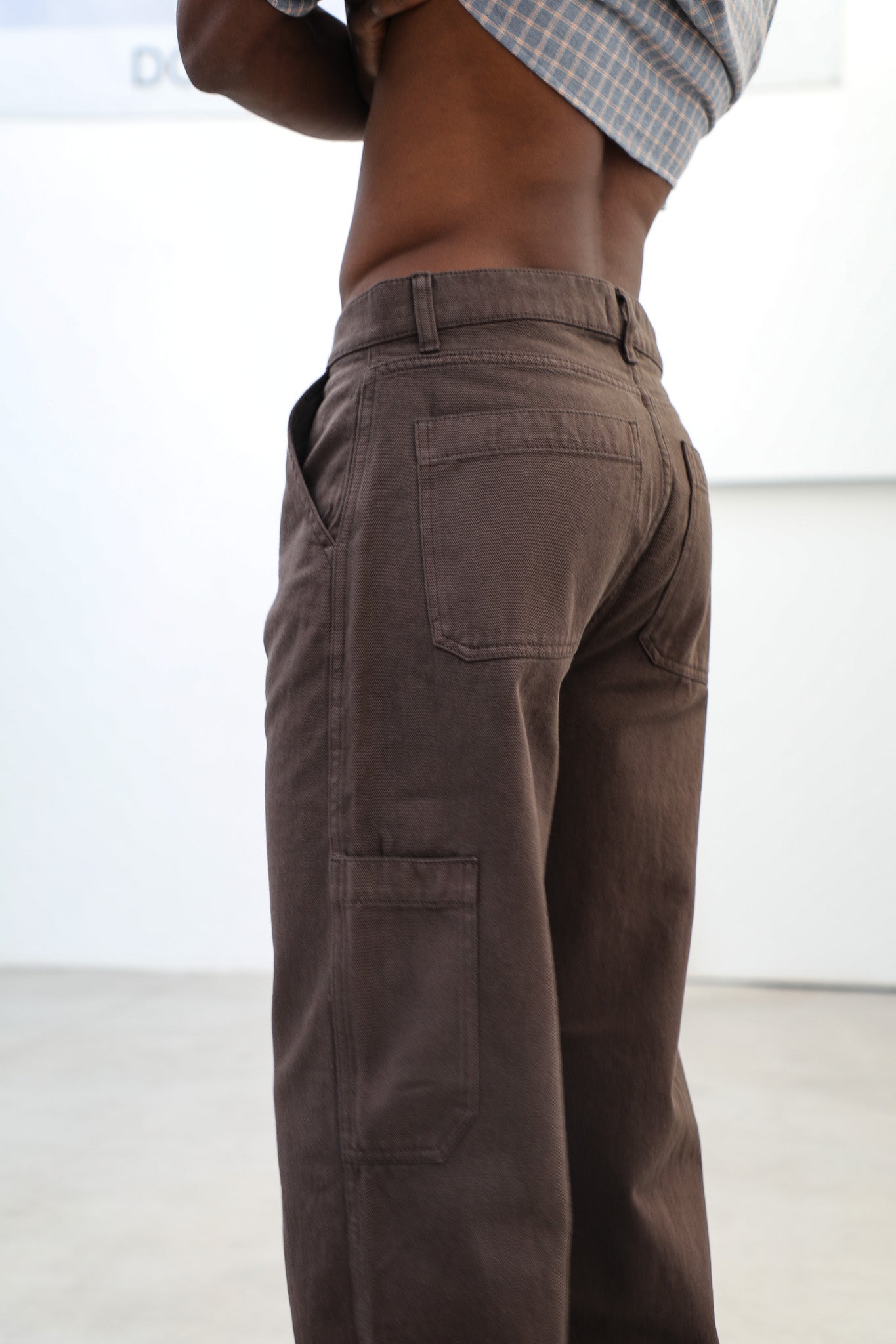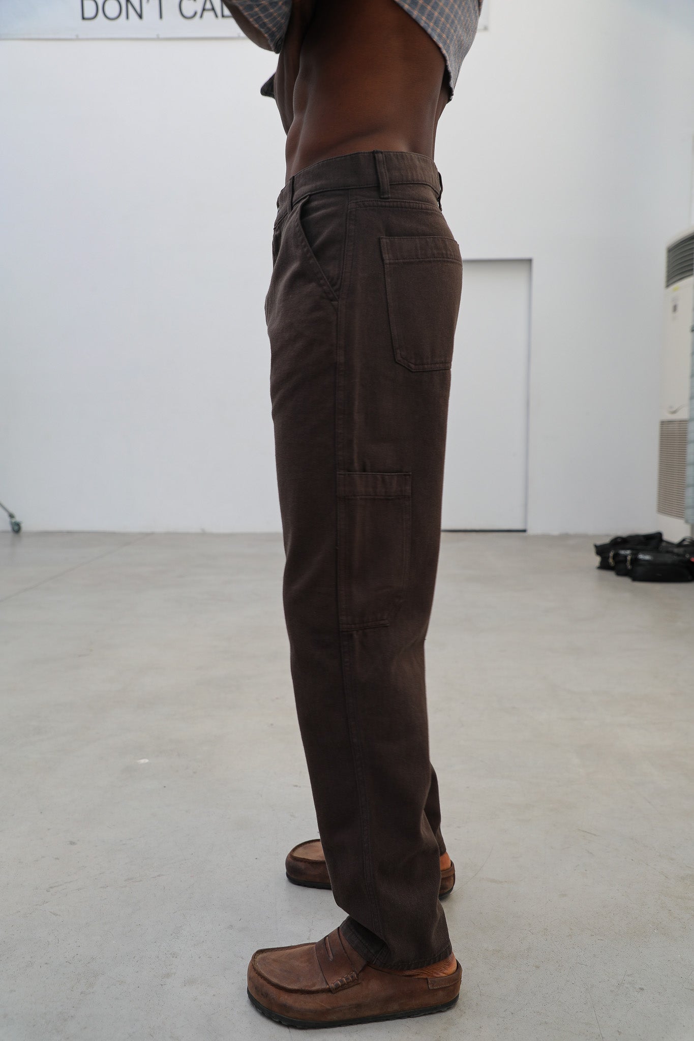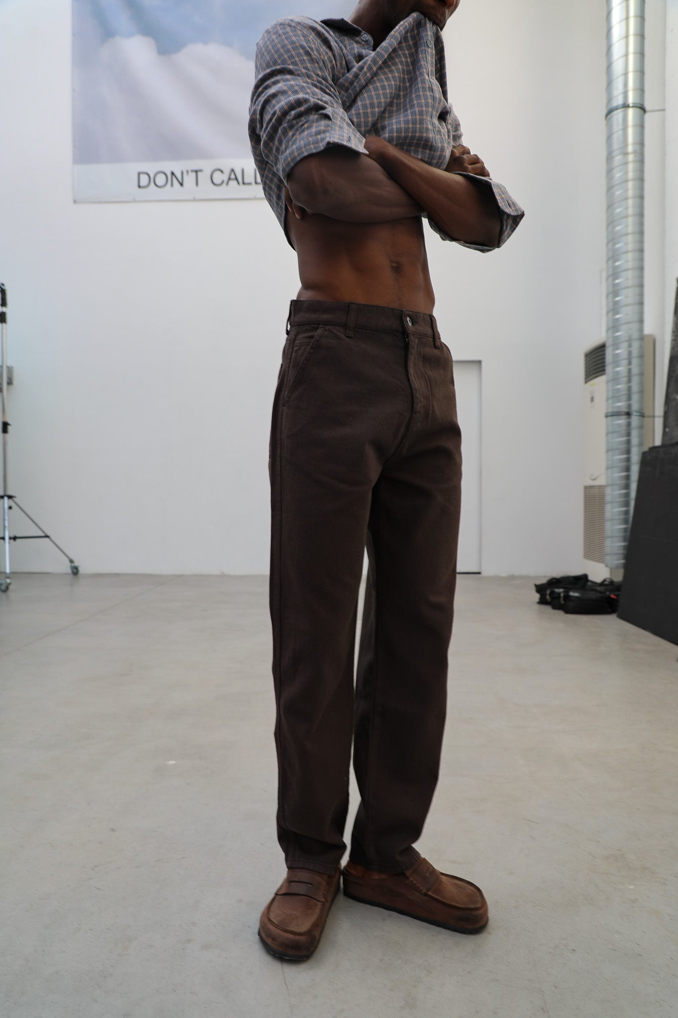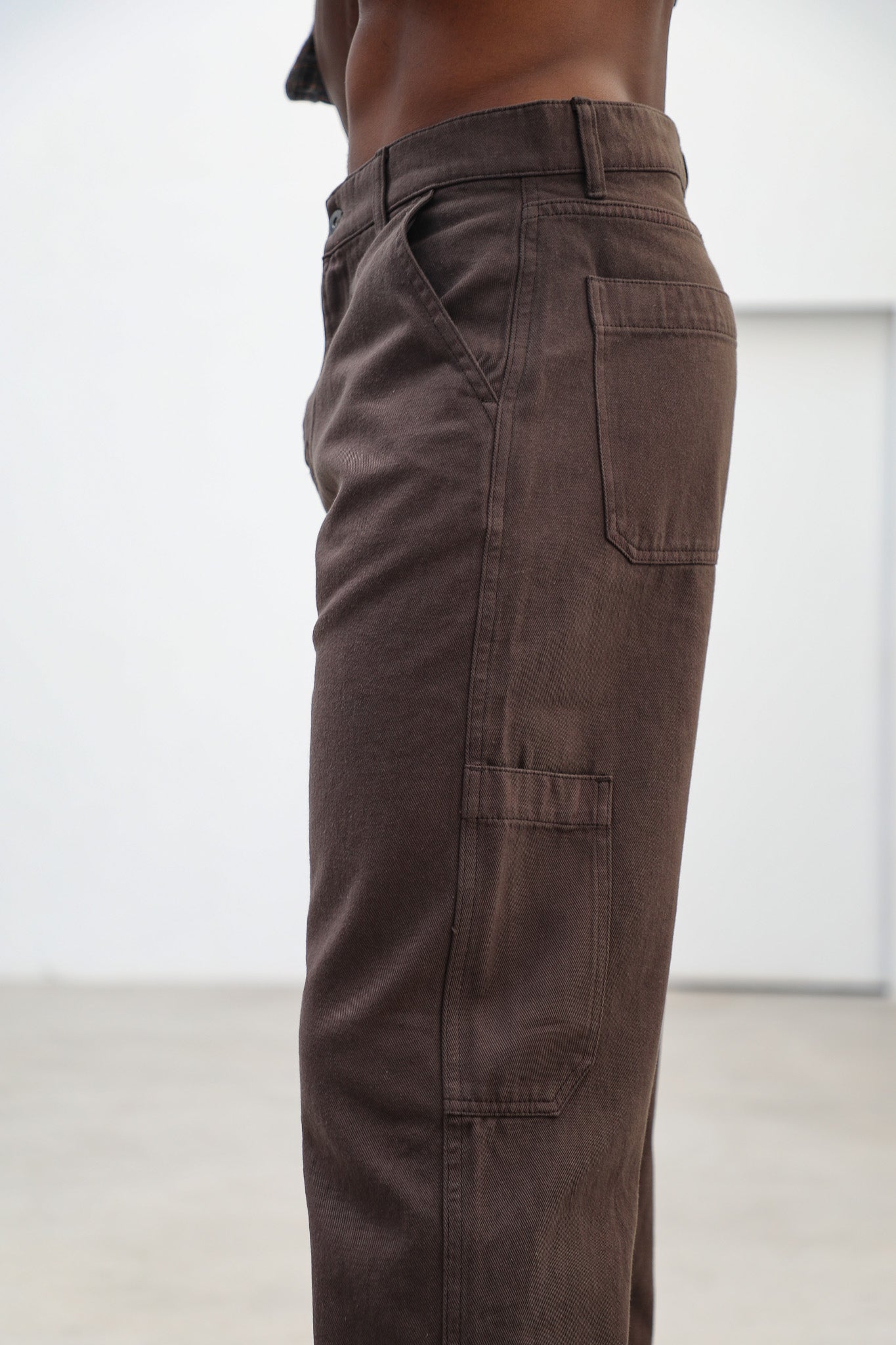 Brown straight-fit pants with button at the waist and side pockets, with side pocket along the leg and two open back pockets.