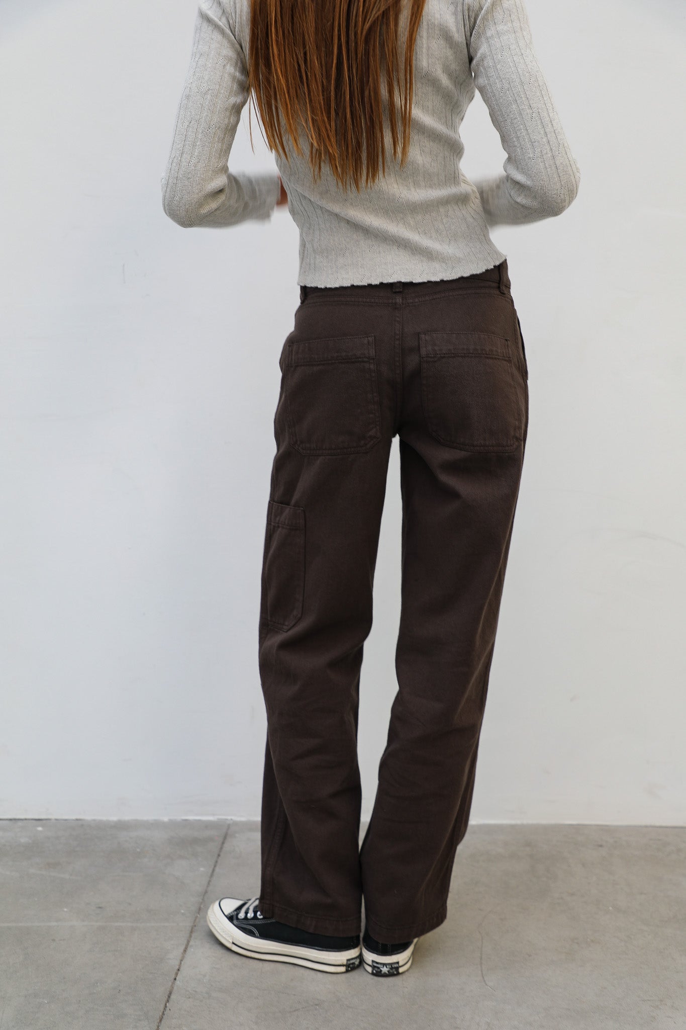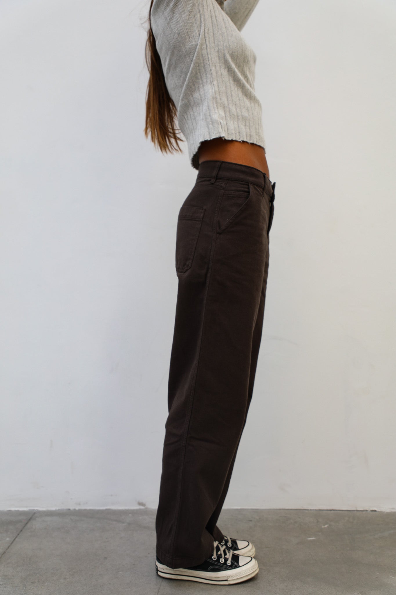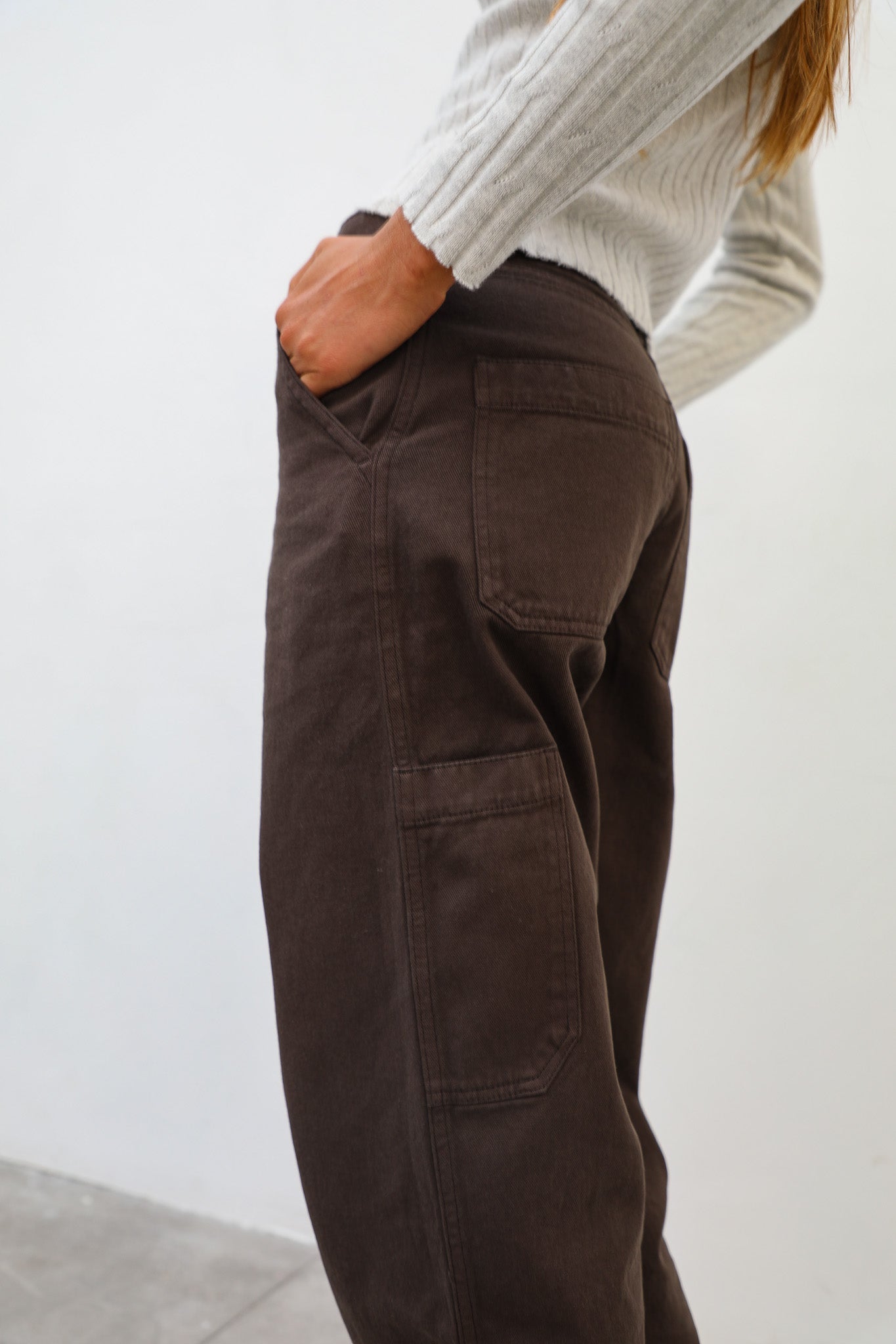 Our bestseller modern comfy pants in dark brown crafted for a modern and comfortable fit for women, with a classic button at waist and side pocket.