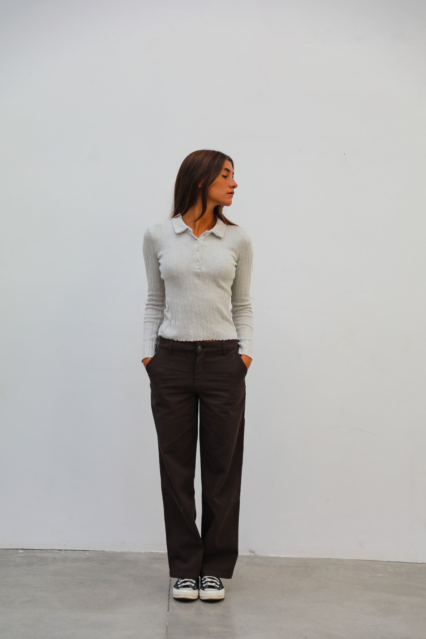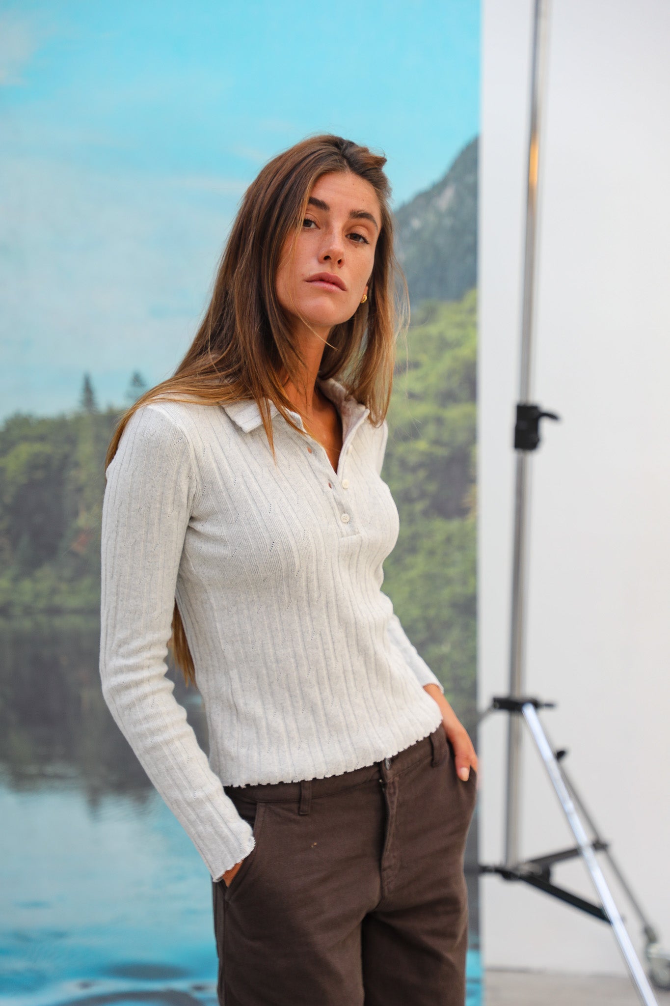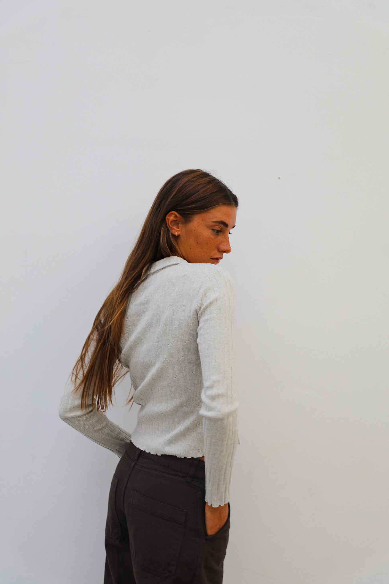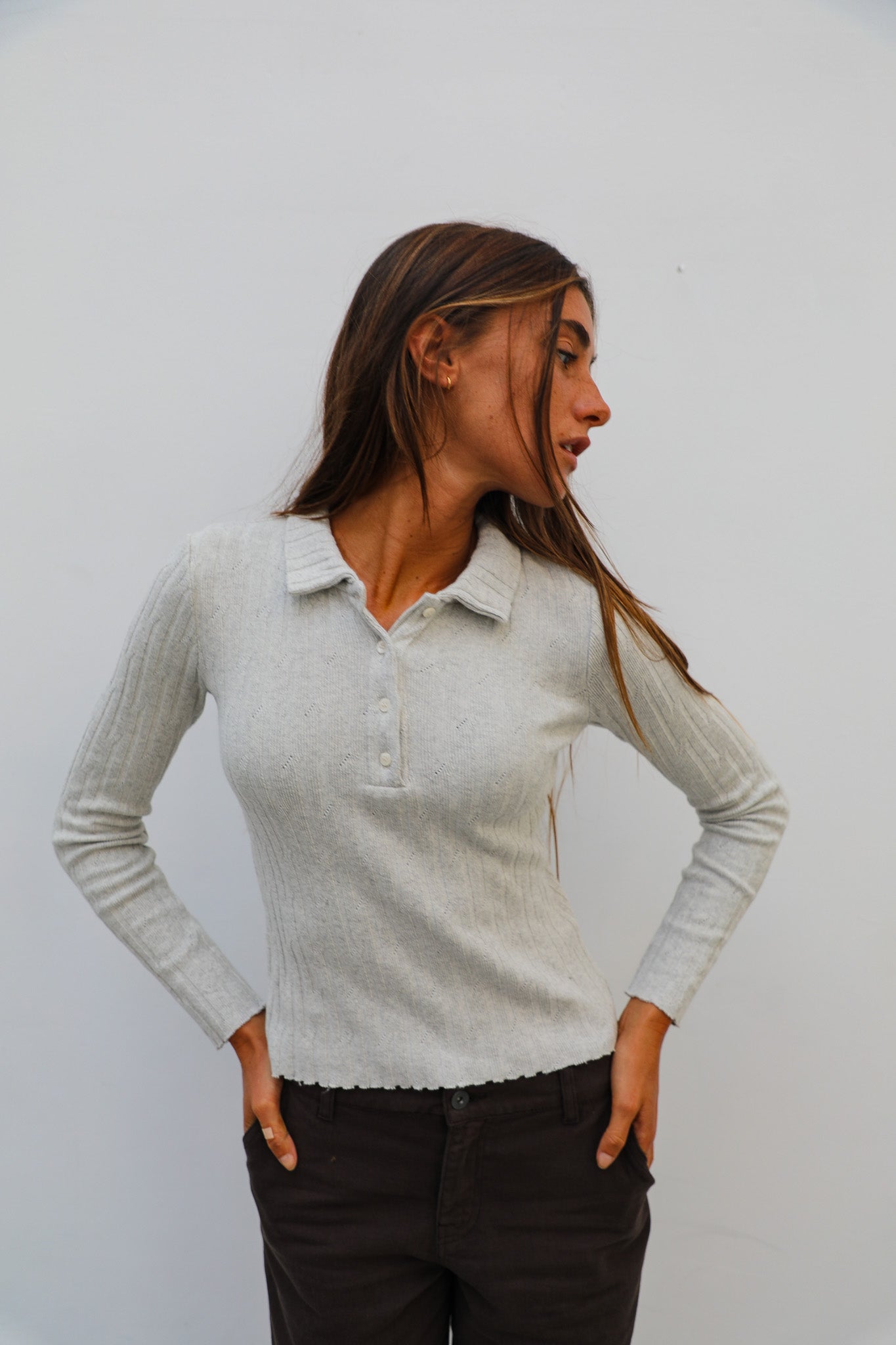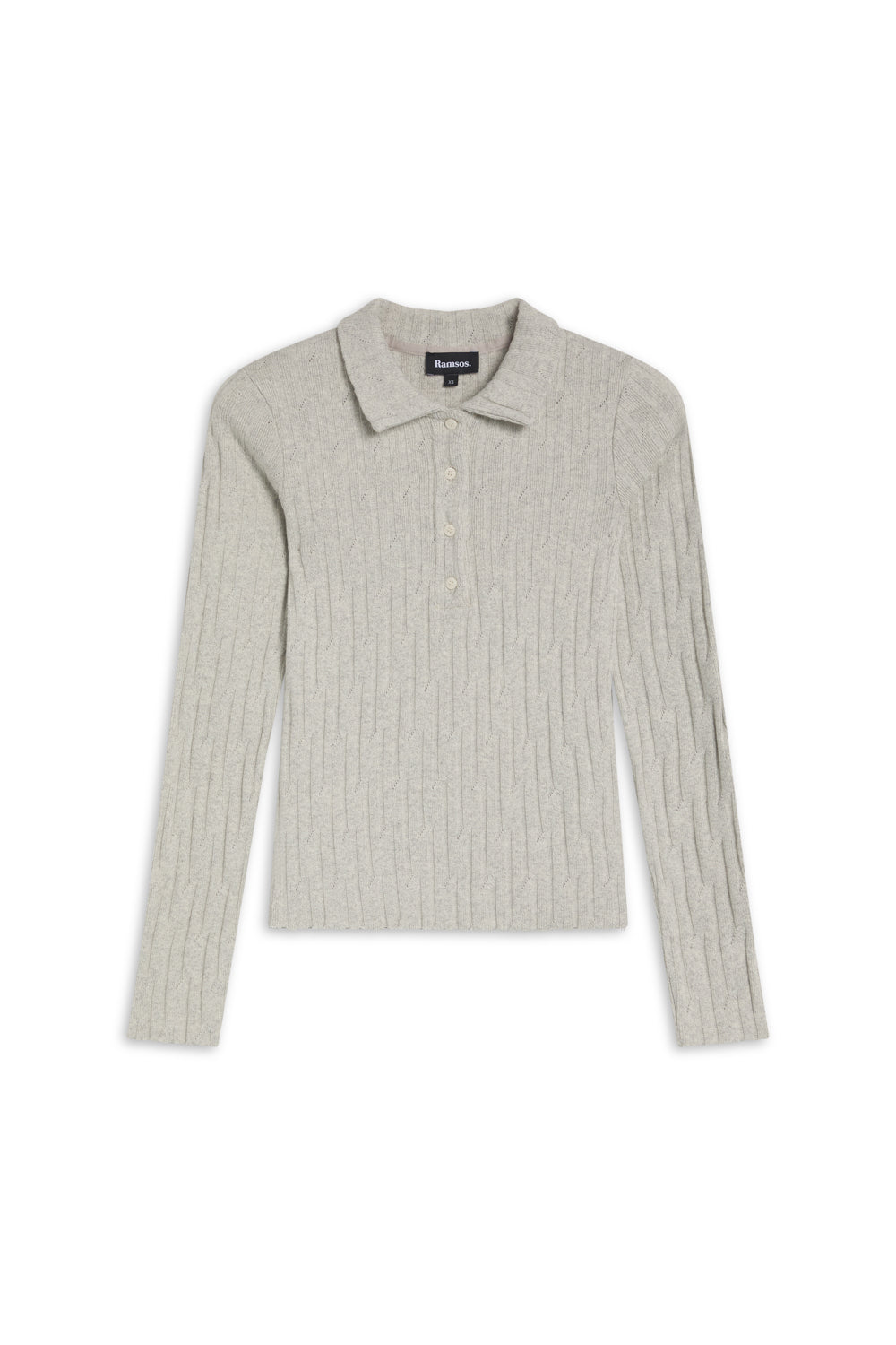 Light grey textured knit sweater with a patterned finish, featuring a polo neckline and a slim fit.