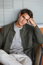 Our model wears size L and stands at 1.89 m tall, highlighting the overshirt's comfortable fit. Crafted from 100% cotton, it offers breathability and softness for all-day wear.