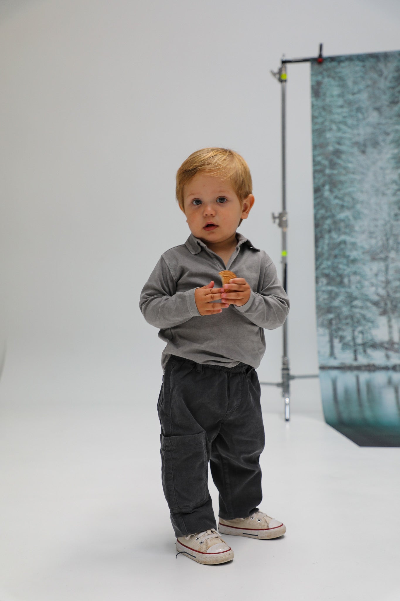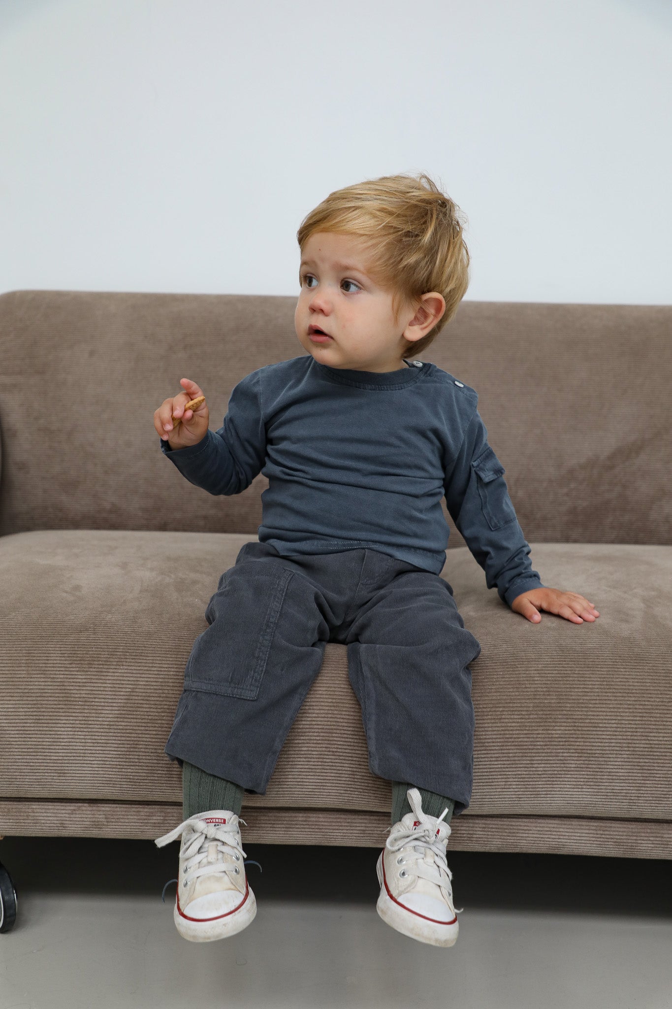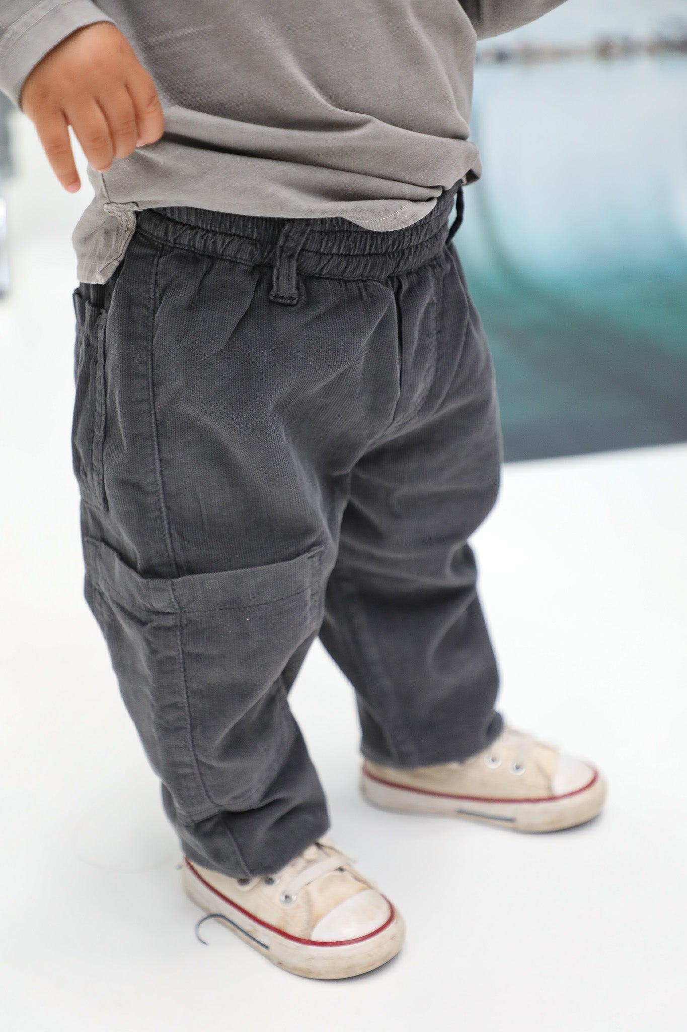 Dark navy Ramsitos corduroy pants for ages 1-6, featuring an elastic waist and a side pocket.