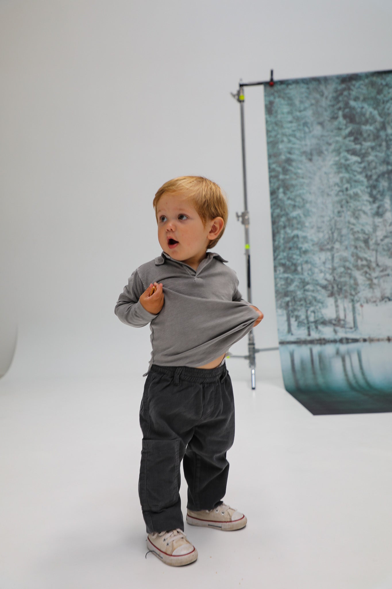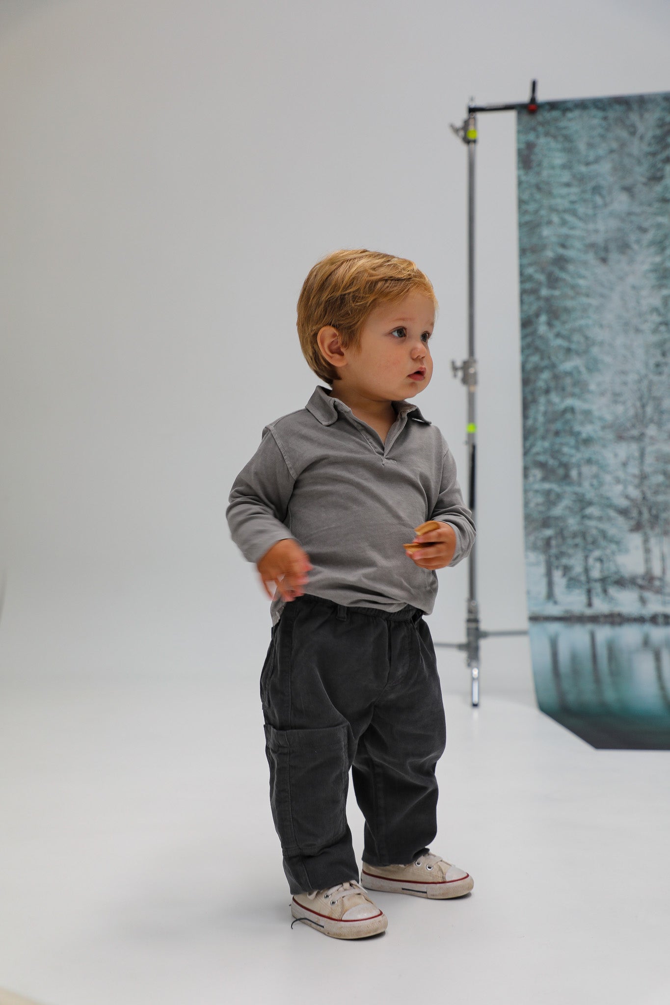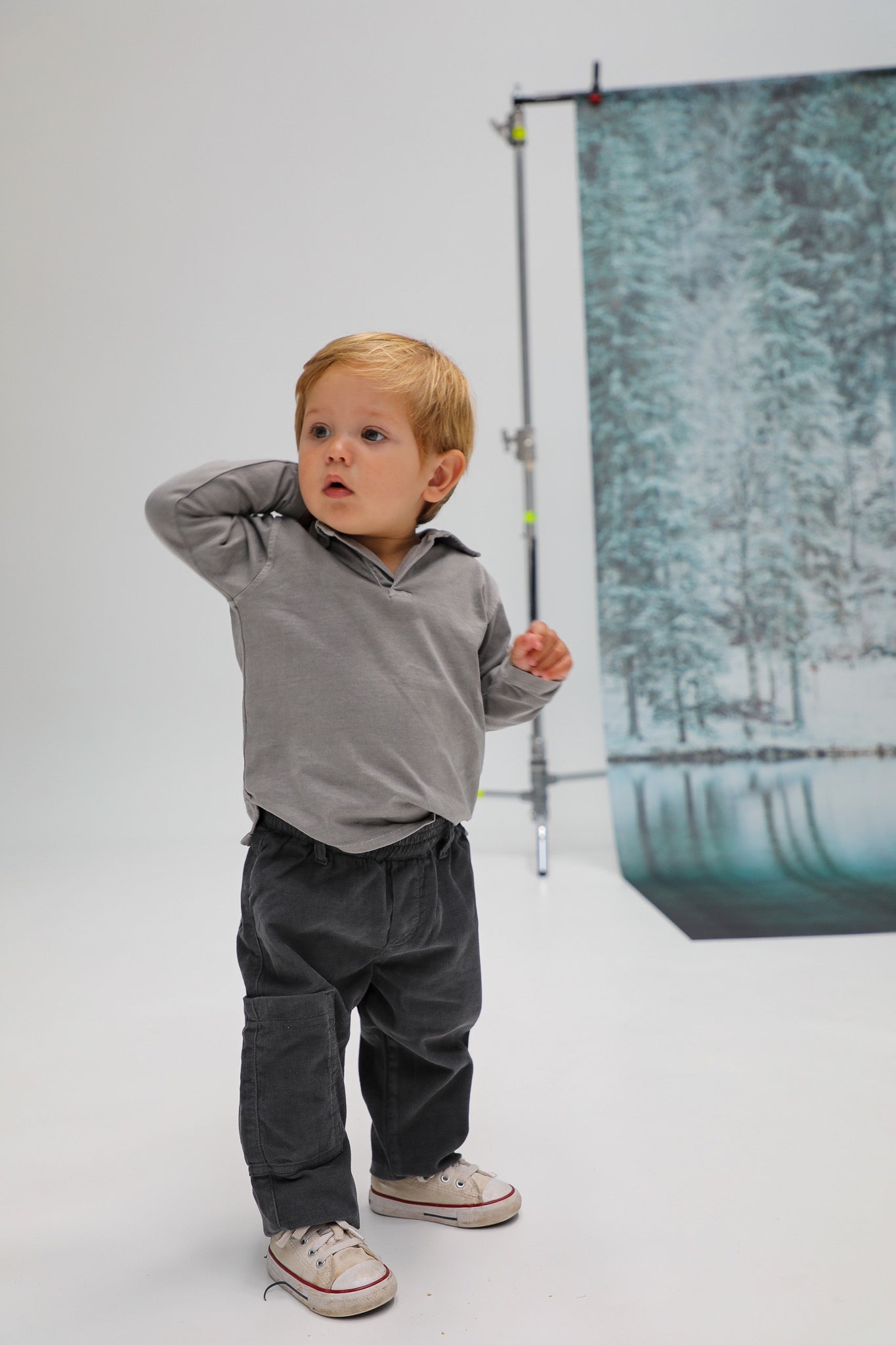 Dark navy Ramsitos corduroy pants for ages 1-6, featuring an elastic waist and a side pocket.