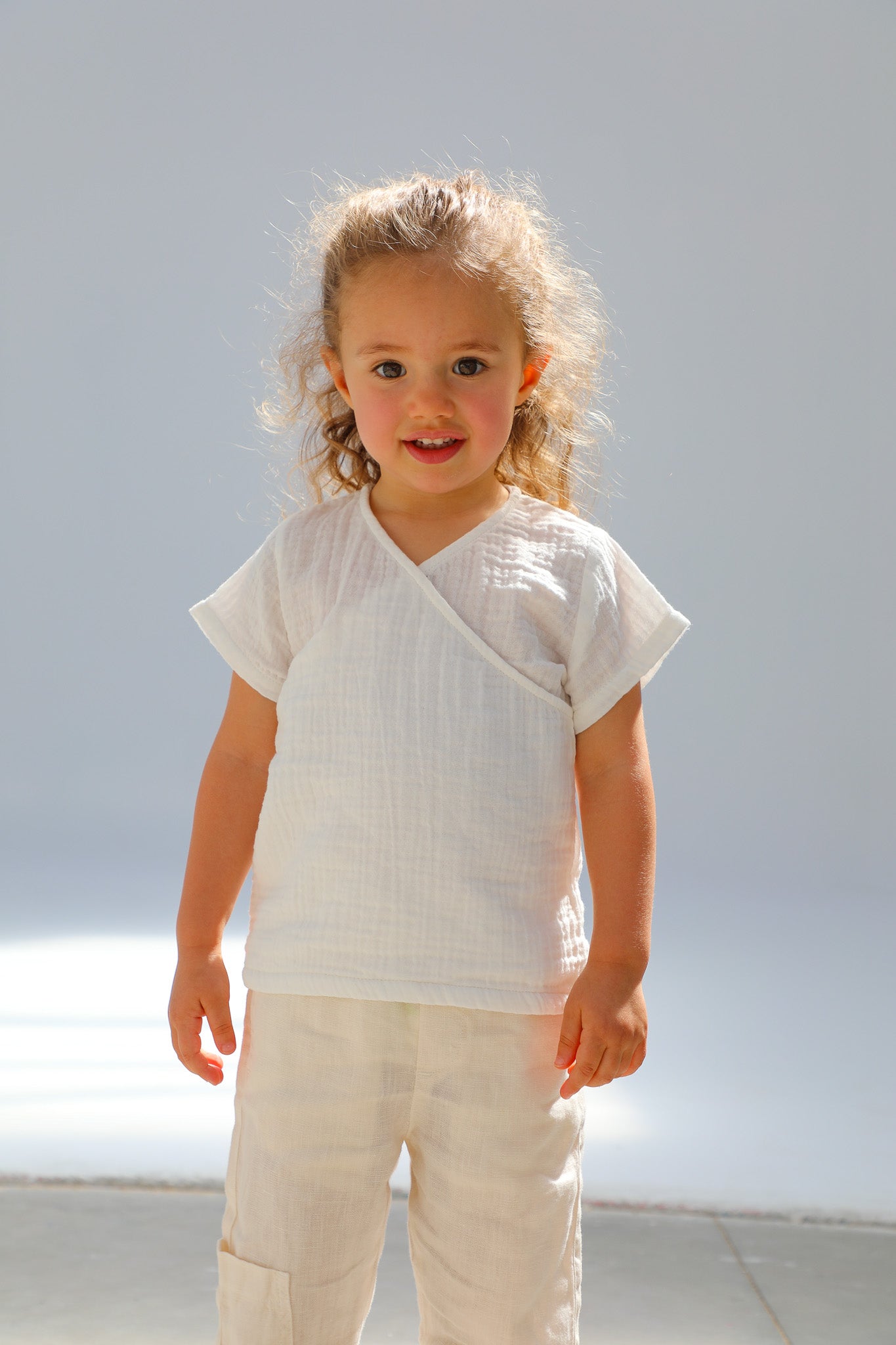 White Ramsitos baby blouse for ages 1-3, featuring short sleeves, a round neck, and a delicate crossed front detail.