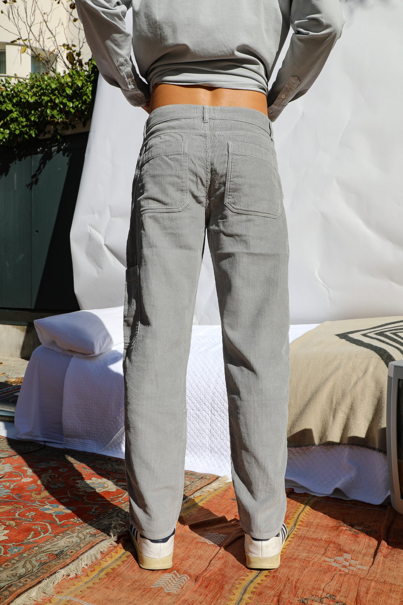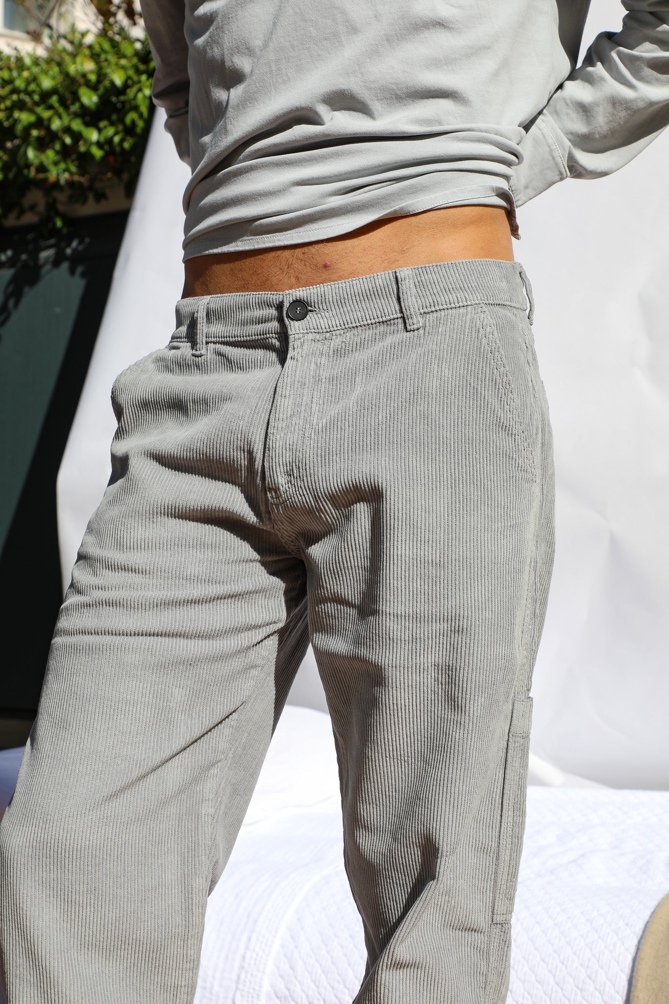 Elevate your style with our light grey corduroy pants, featuring a button at the waist and two convenient pockets below the waist, two back pockets and a small side pocket along the leg, seamlessly blending style and functionality. These pants offer a comfortable, wide and modern fit, perfect for any occasion.