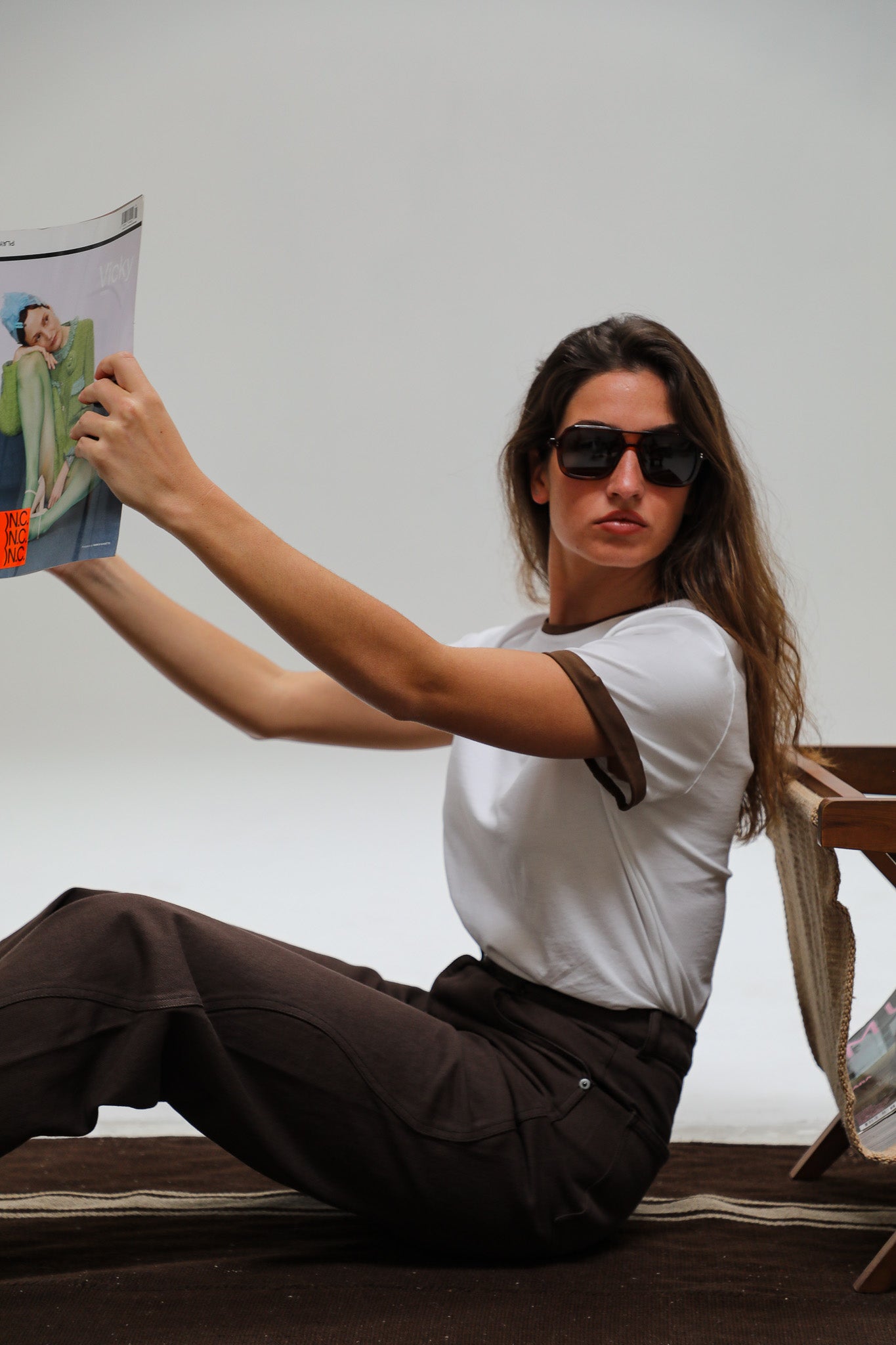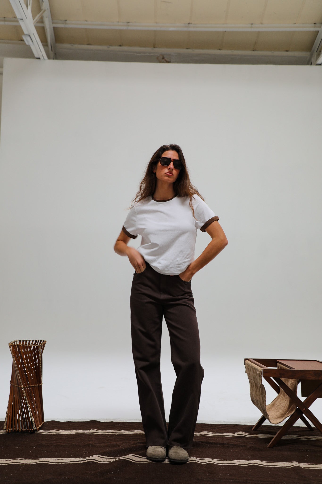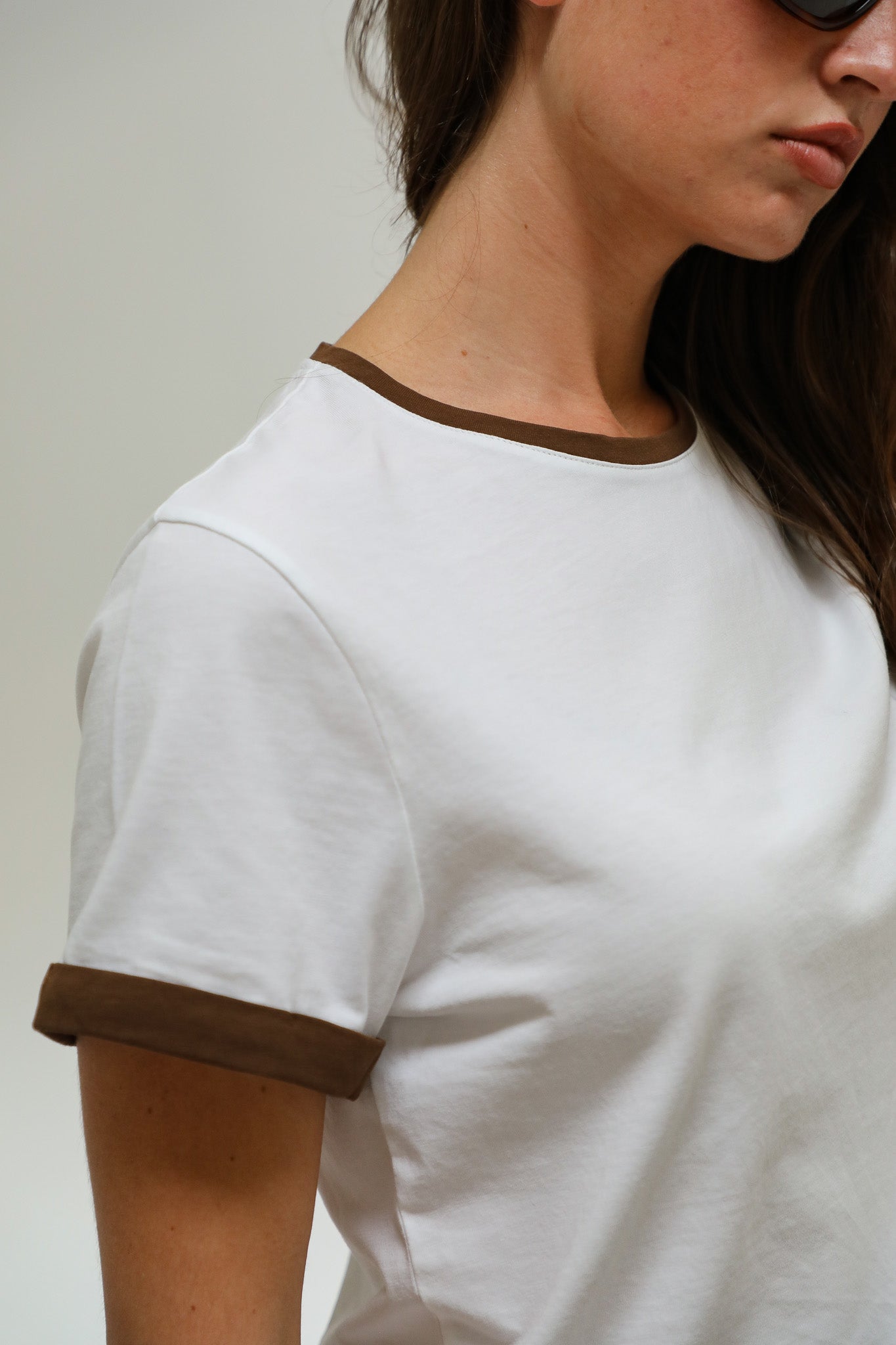 White short-sleeve t-shirt with contrast brown fabric around the neckline and sleeve edges, featuring a classic round neck and a clean straight hem.