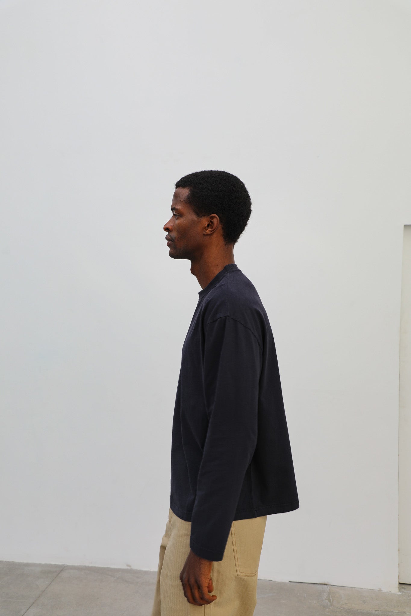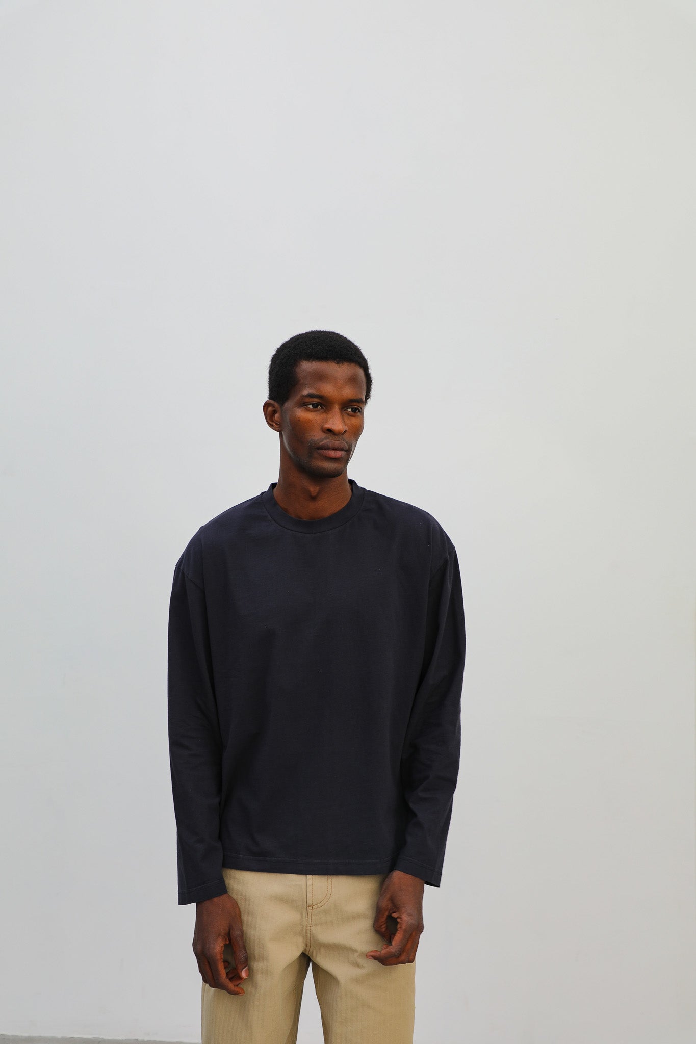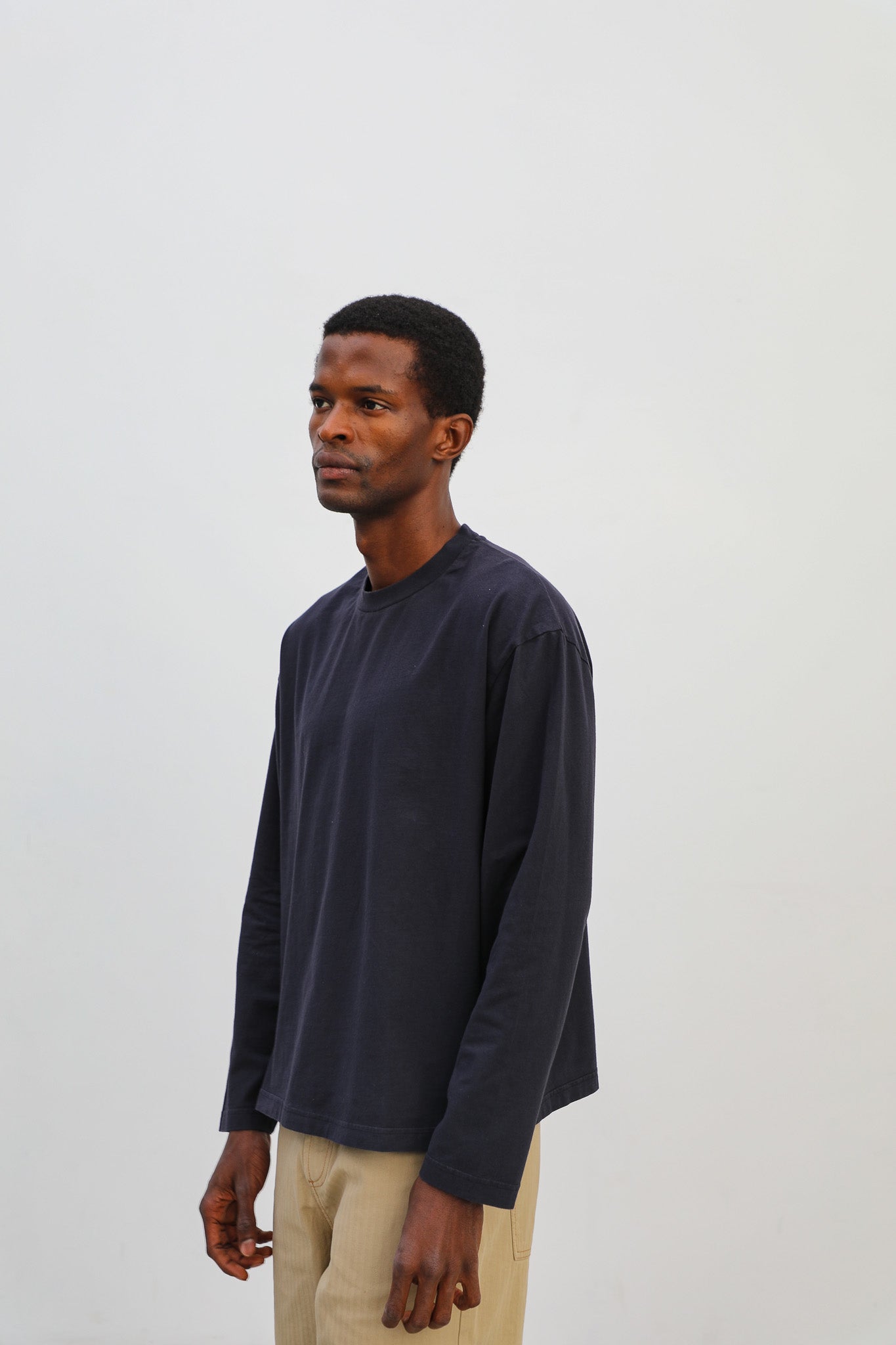 Men’s wide-fit navy T-shirt in organic cotton, designed with long sleeves, a chest pocket, a cropped length, and soft fabric for added comfort on chilly days.