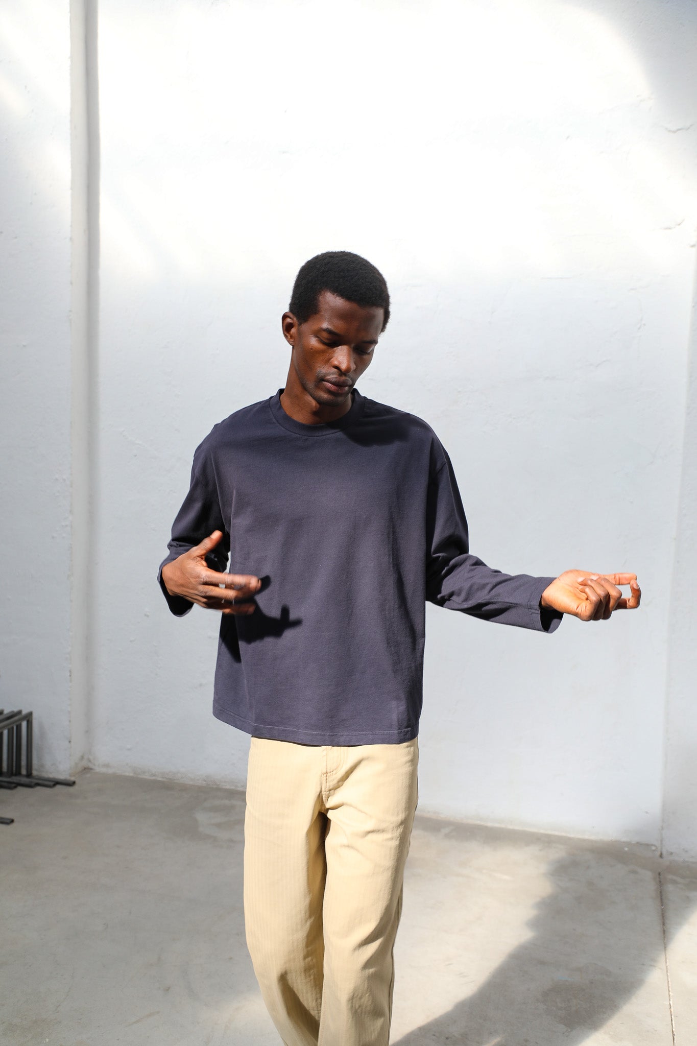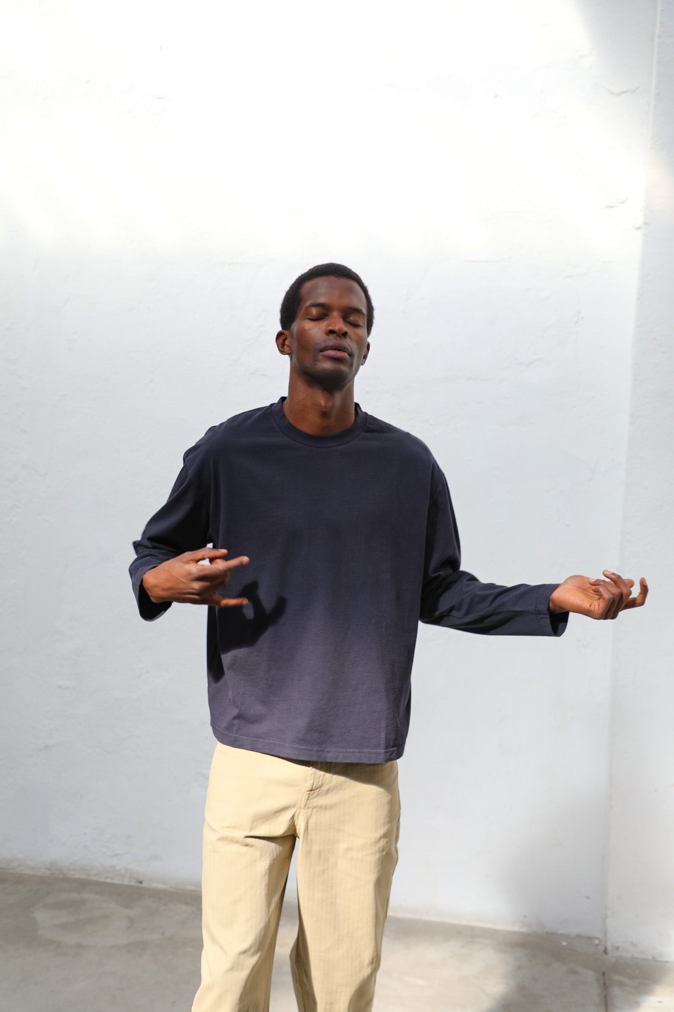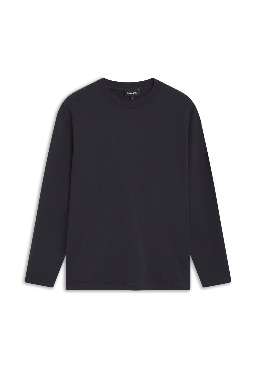 Men’s wide-fit navy T-shirt in organic cotton, designed with long sleeves, a chest pocket, a cropped length, and soft fabric for added comfort on chilly days.