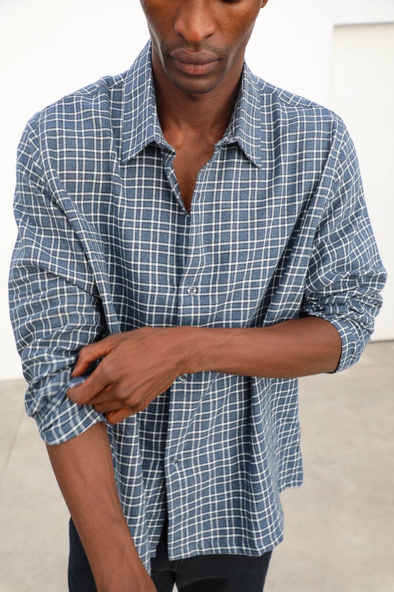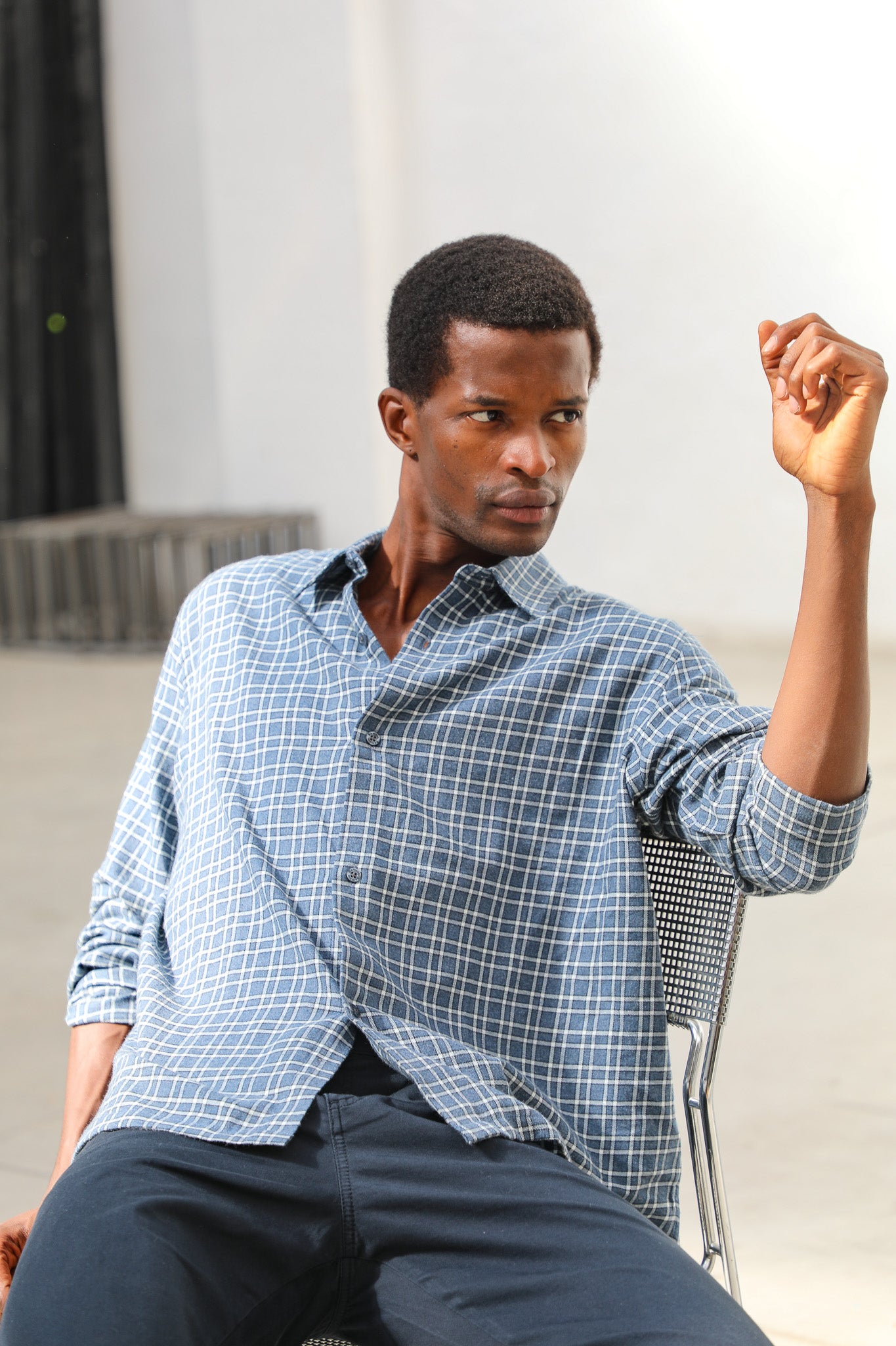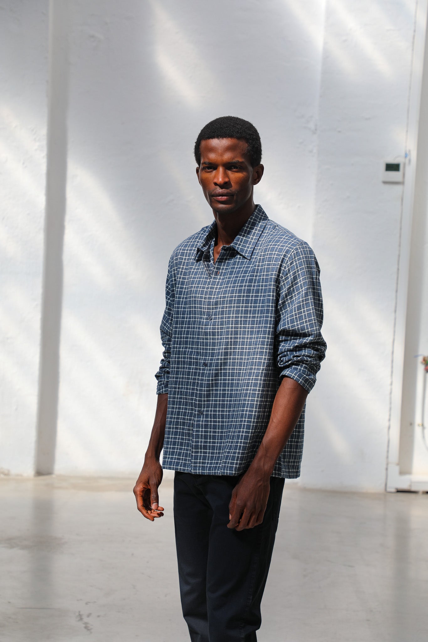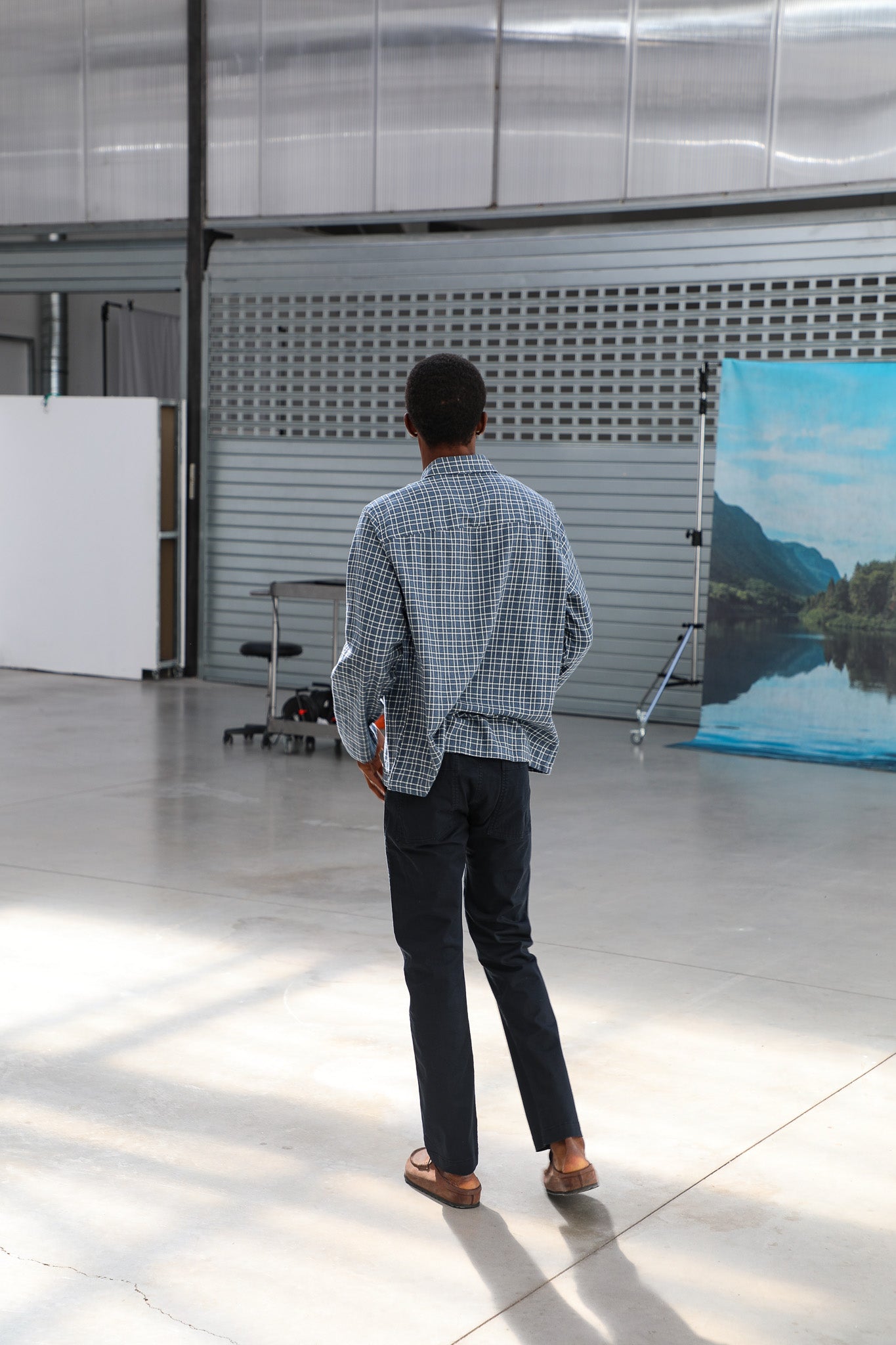 Blue and white button-down shirt featuring a subtle checkered pattern and cropped fit.