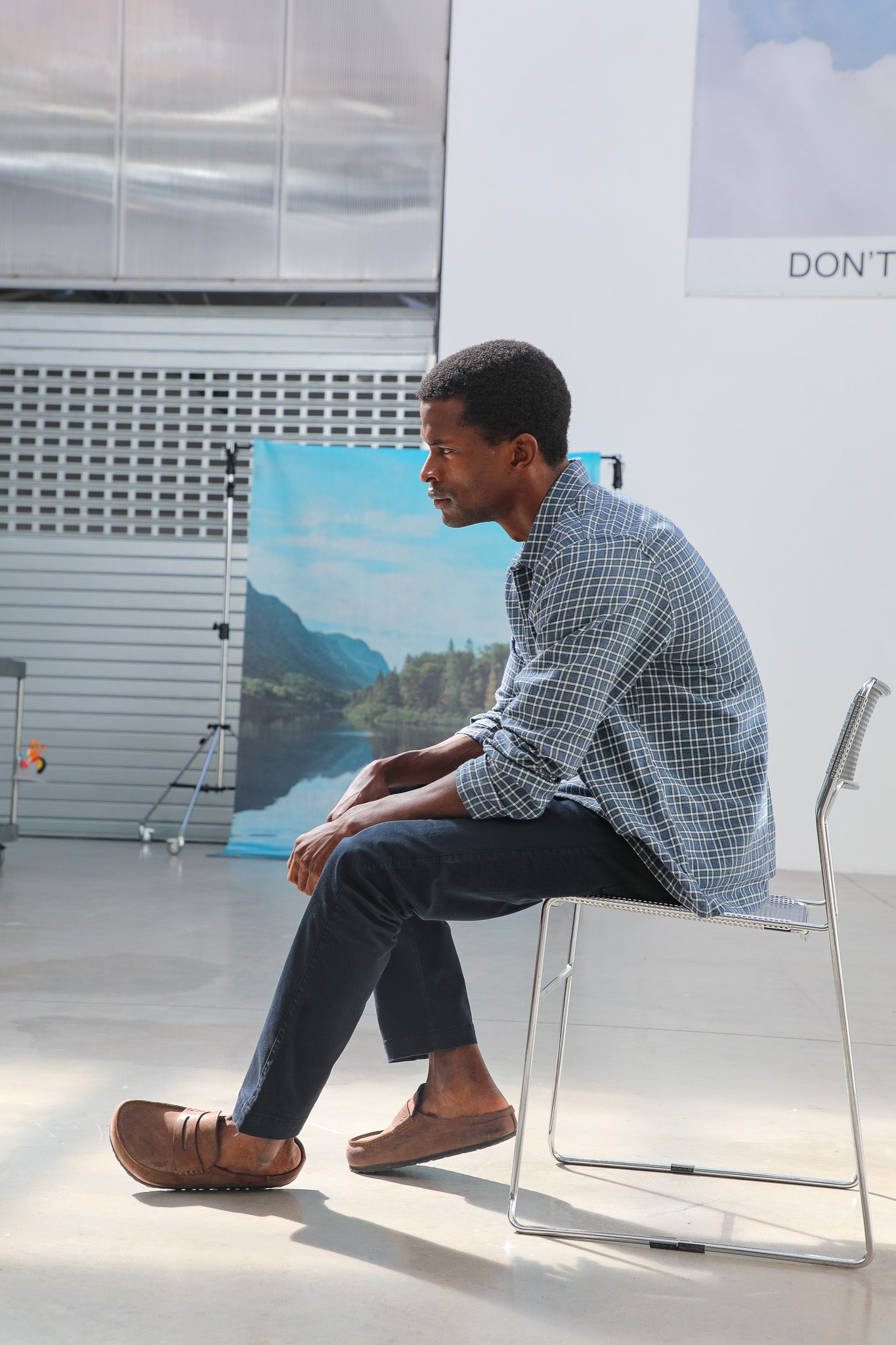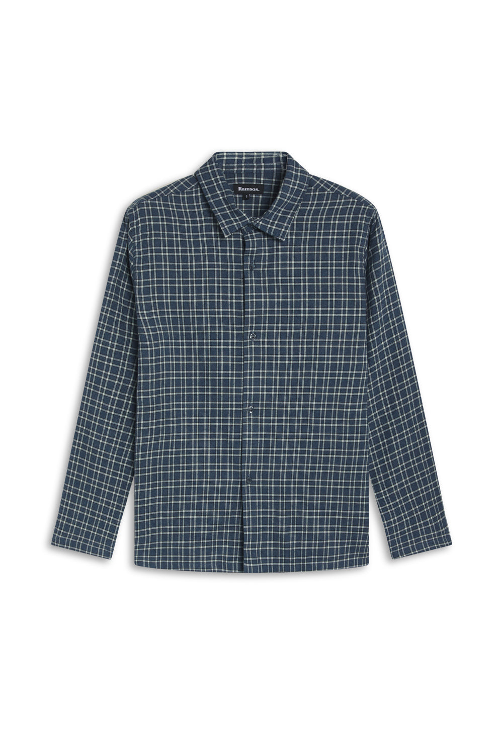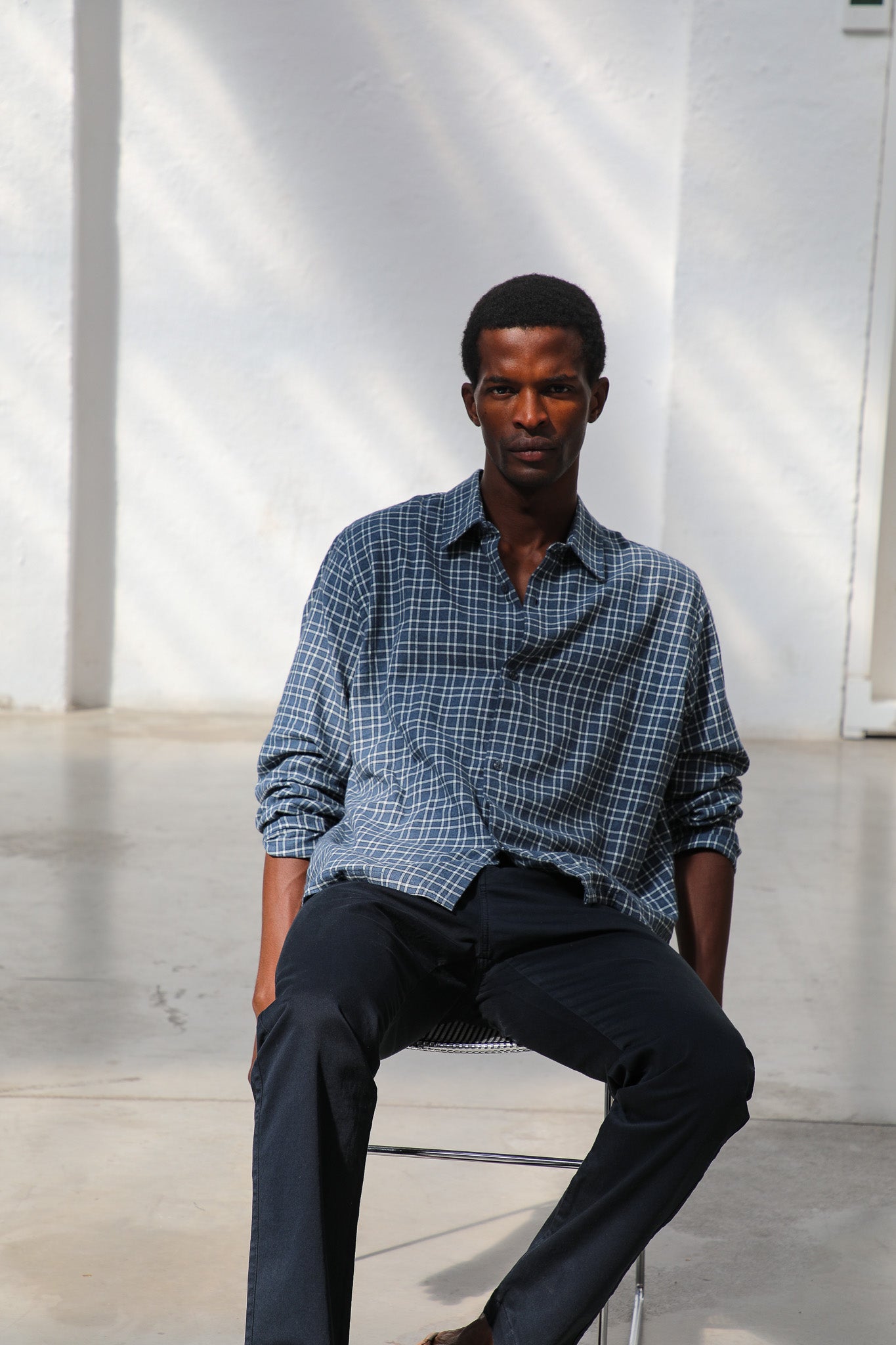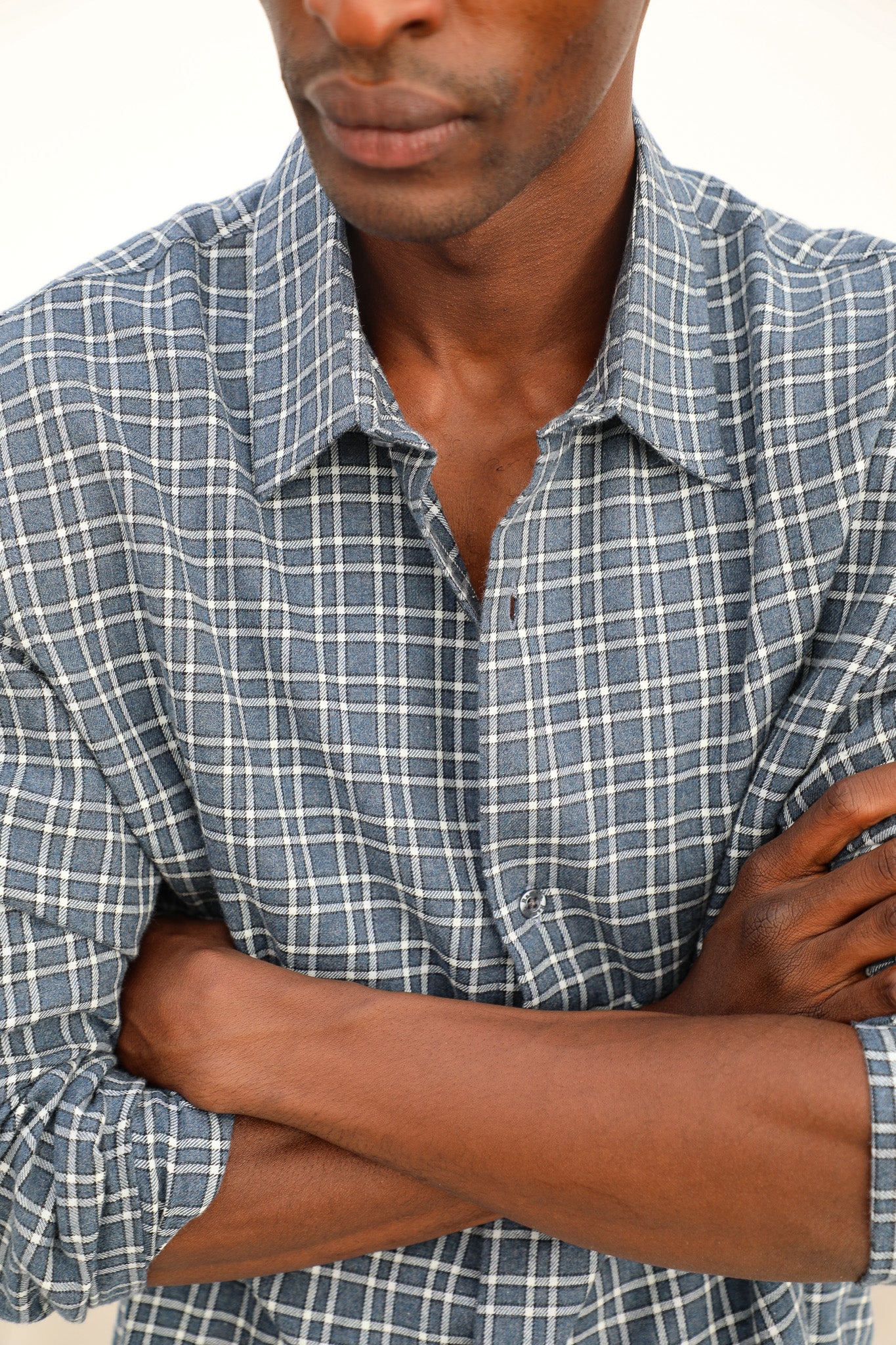 Blue and white button-down shirt featuring a subtle checkered pattern and cropped fit.
